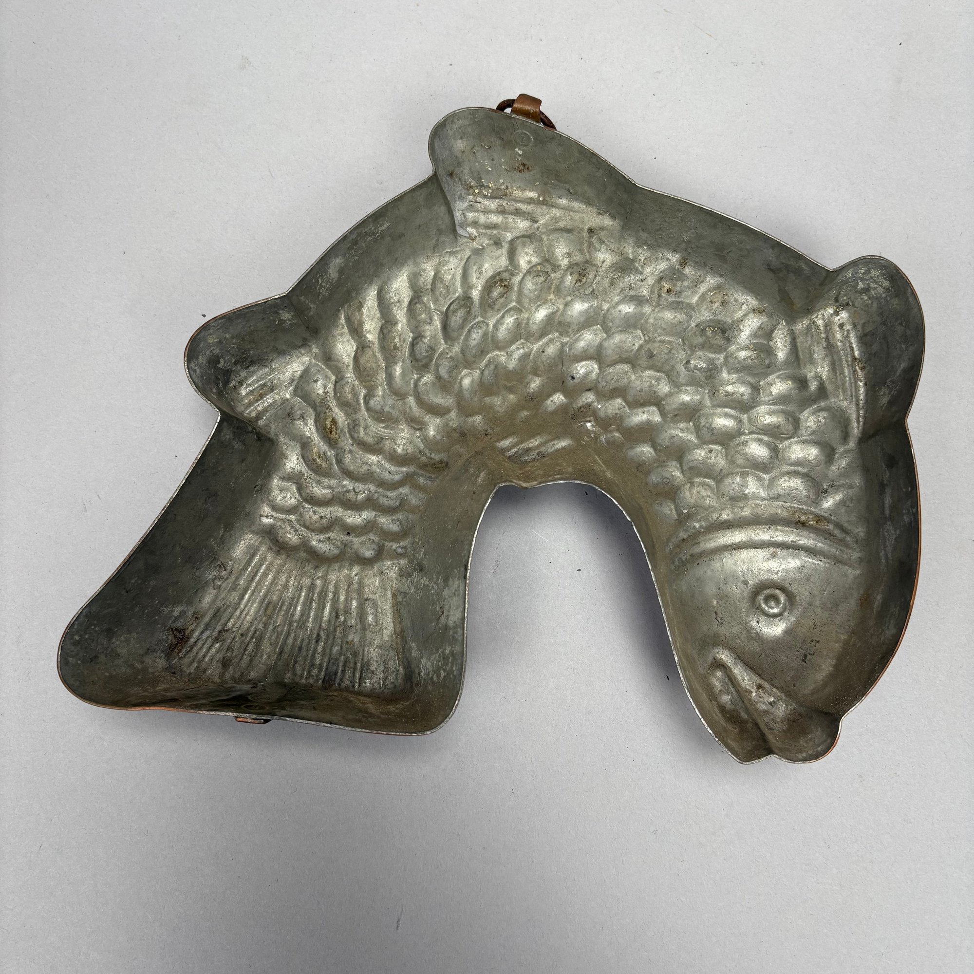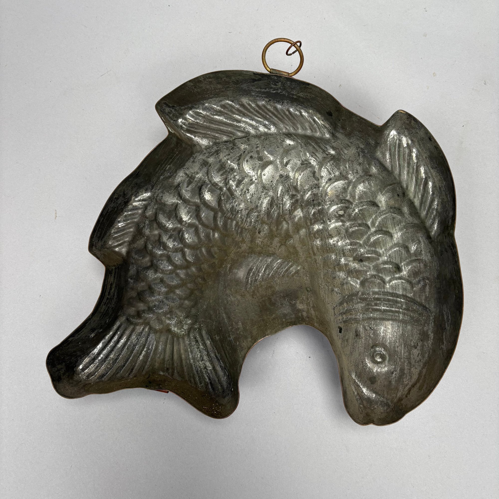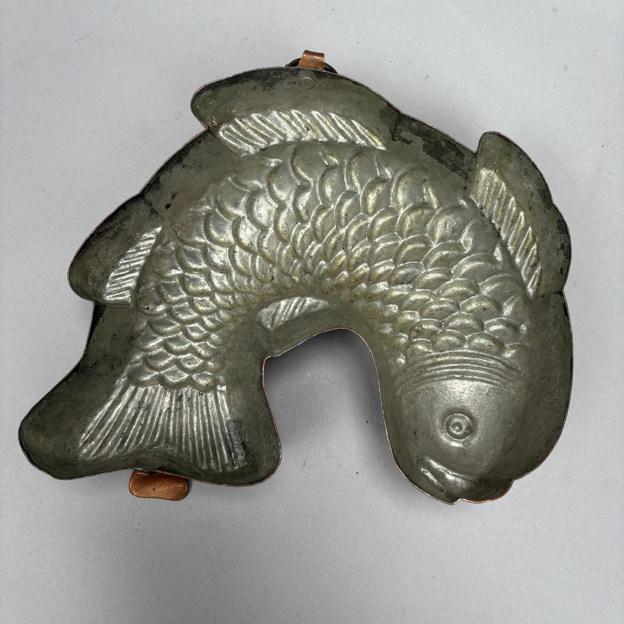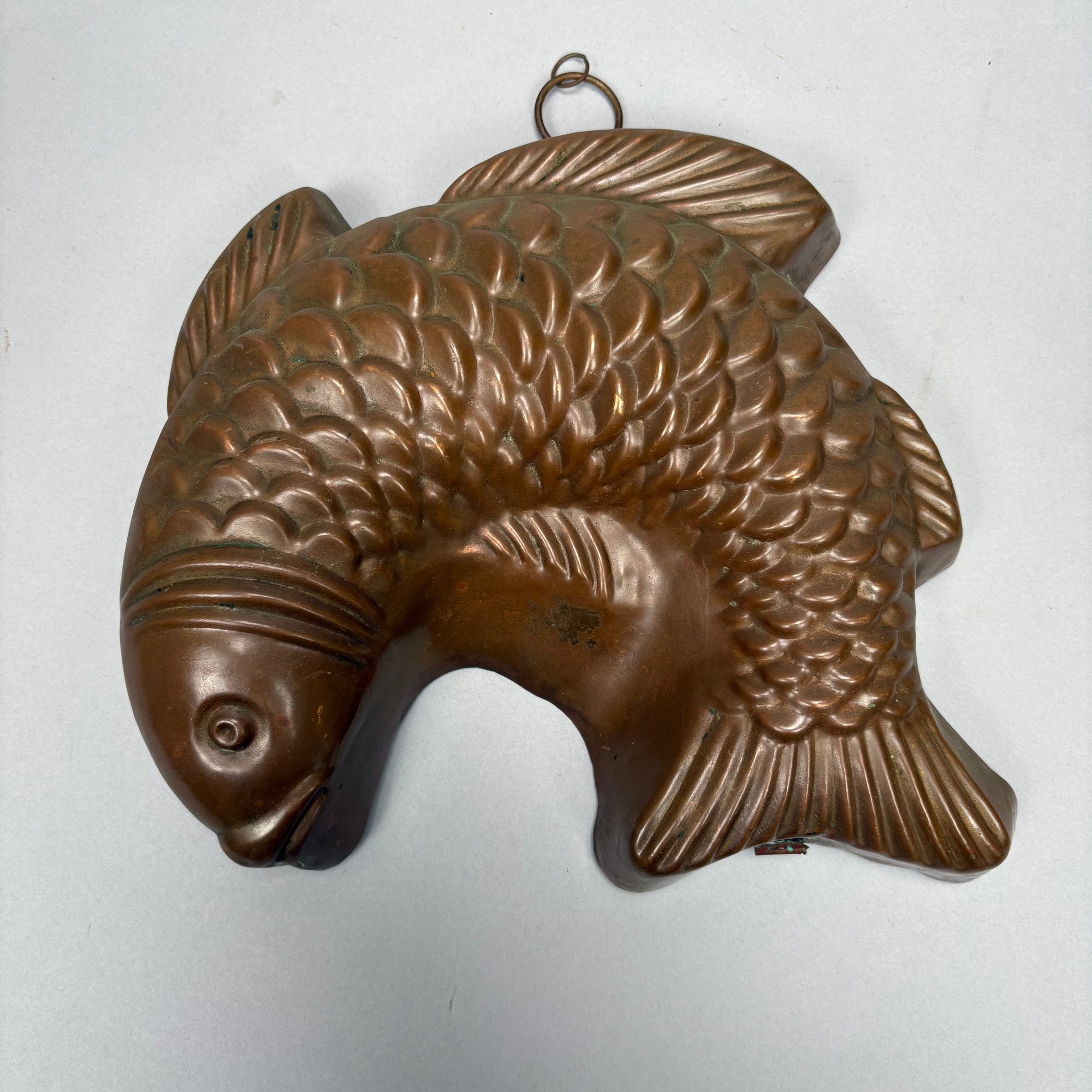 Five Tin-Lined Copper Jumping Fish Molds, 20th Century. Each with a hanging loop and four each with a handle.