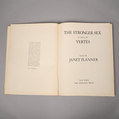 Janet Flanner and Marcel Vertes, "The Stronger Sex as Seen by Vertes," No. 968 of a limited edition of 1,750. New York: The Hyperion Press, 1941. 12 pages of text, illustrated with 24 tipped-in plates (some erotic), mostly in sepia and hand colored, a few in black and white, and with several in-text drawings. Together with three monotypes of birds, each printed from the original by Giancarlo Gemo, Vicenza, 1967; and six lithographs from "La carrozza d'Oro" (The Golden Coach), 1952, illustrated by Brini. (11)