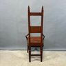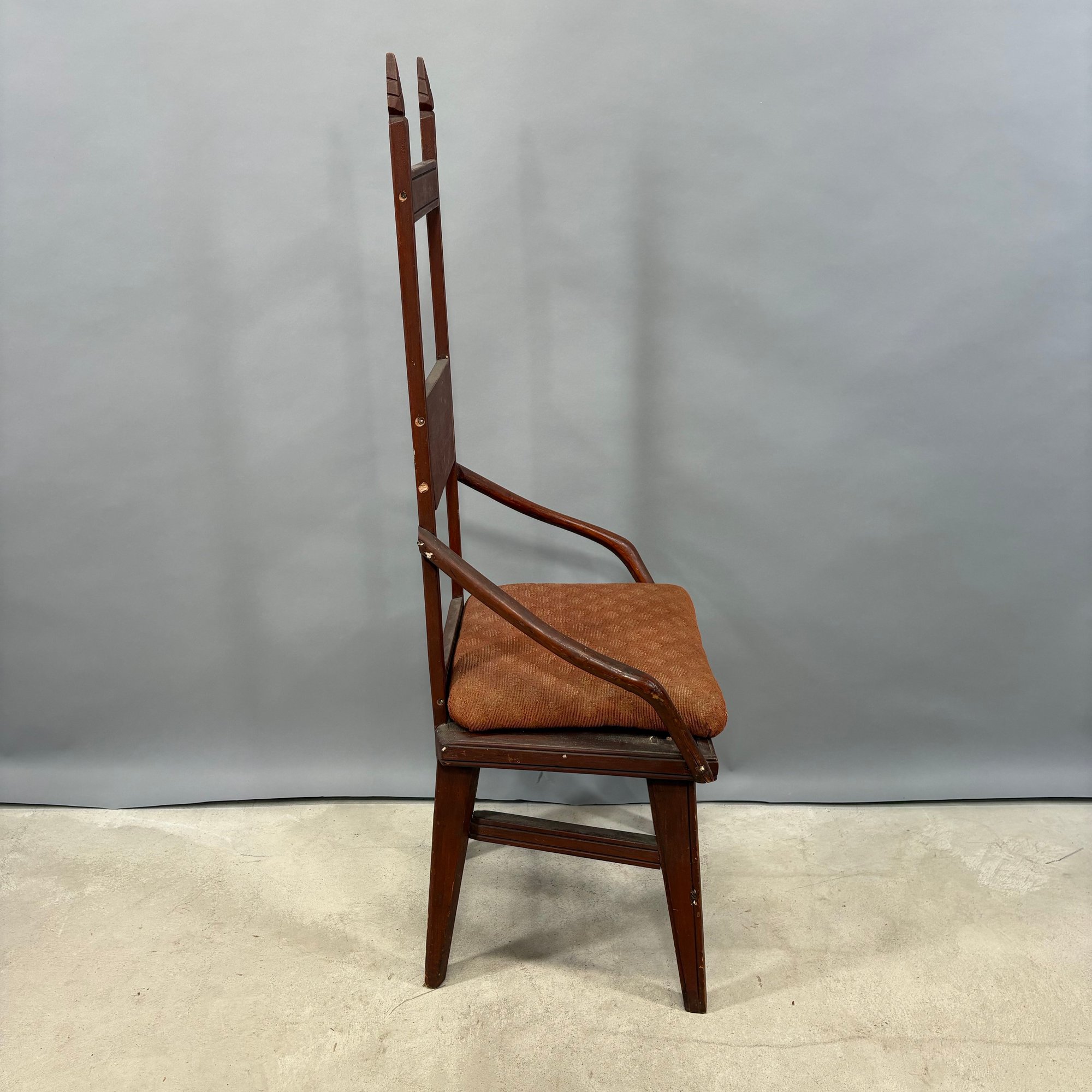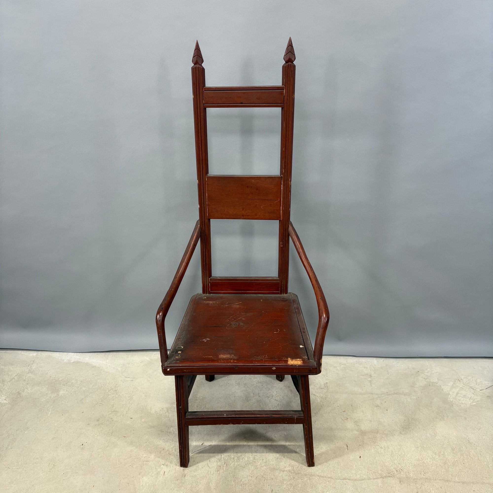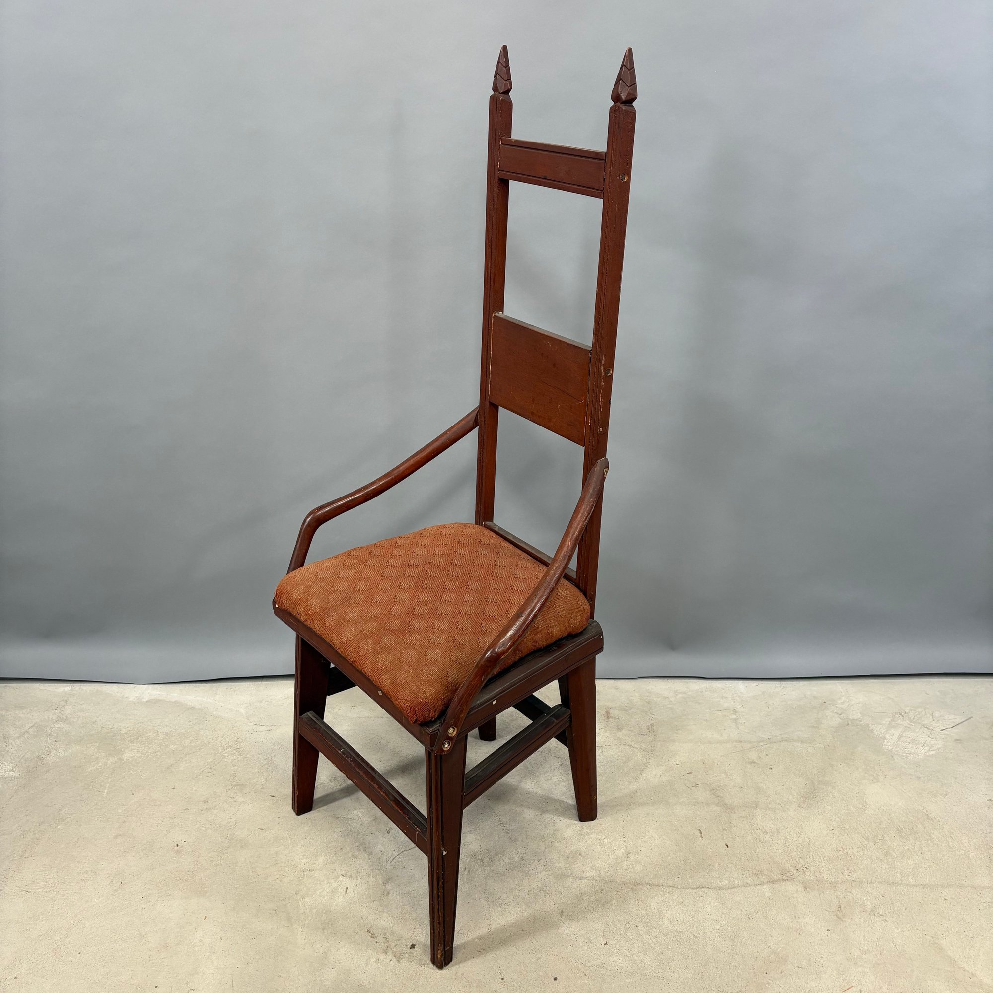 Folk Art Country Armchair in Red Paint. The two rectangular splats within graduated square stiles surmounted by spire finials, down-curved arms, the seat with loose cushion raised on slightly-curved square legs.