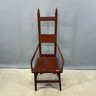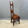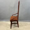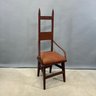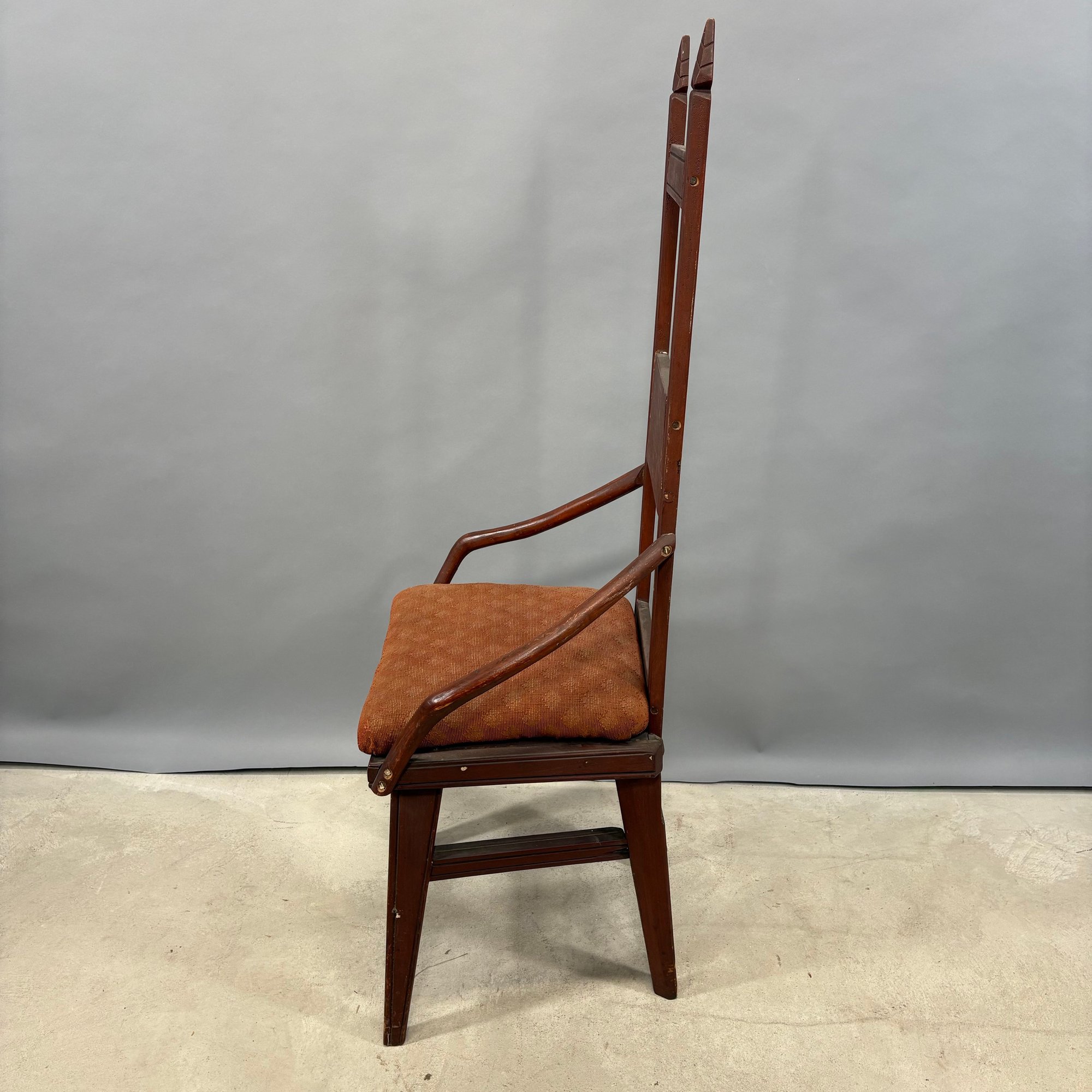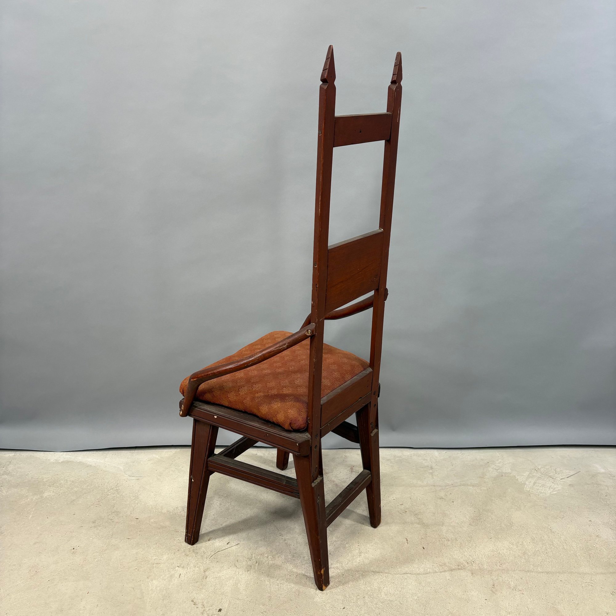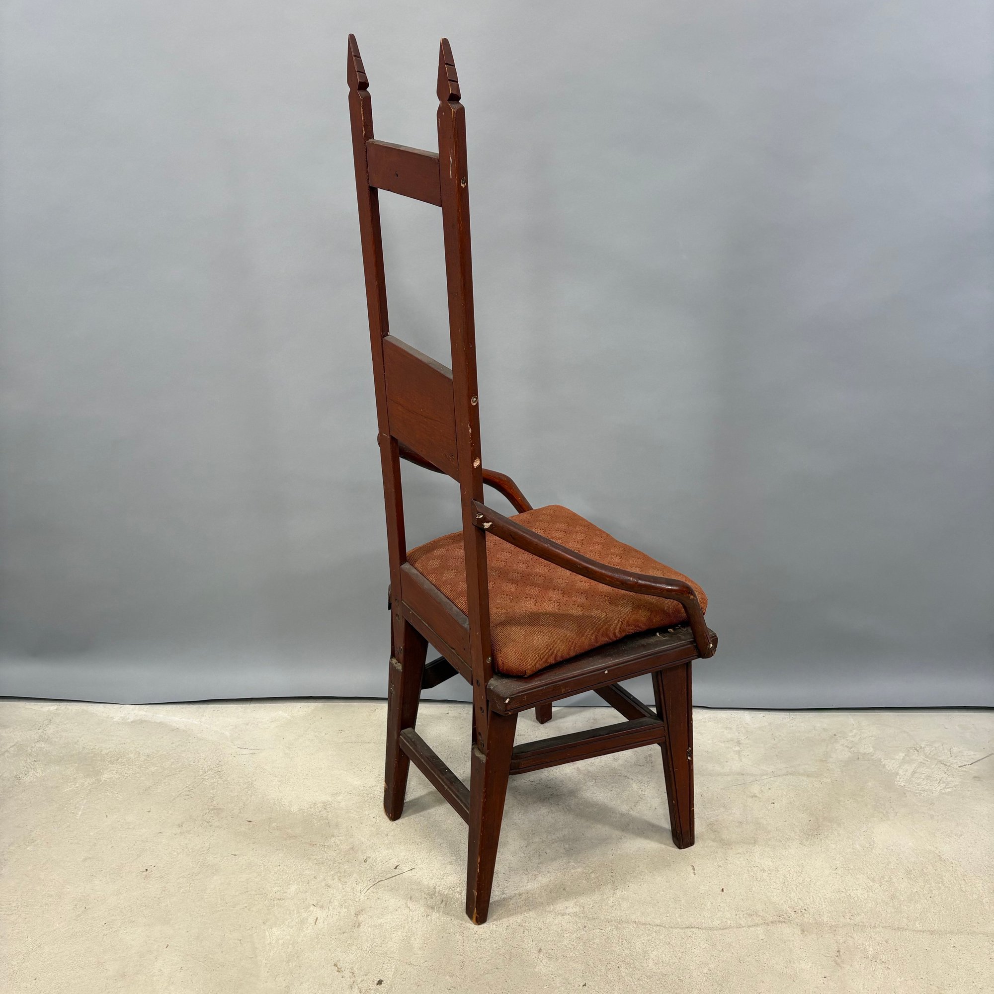 Folk Art Country Armchair in Red Paint. The two rectangular splats within graduated square stiles surmounted by spire finials, down-curved arms, the seat with loose cushion raised on slightly-curved square legs.