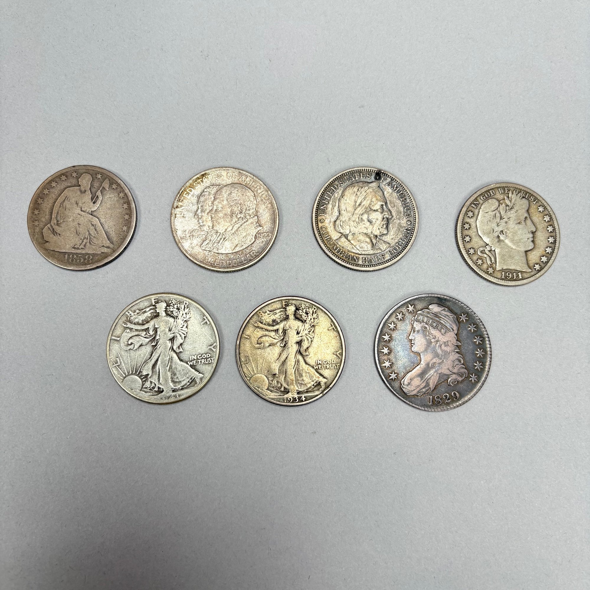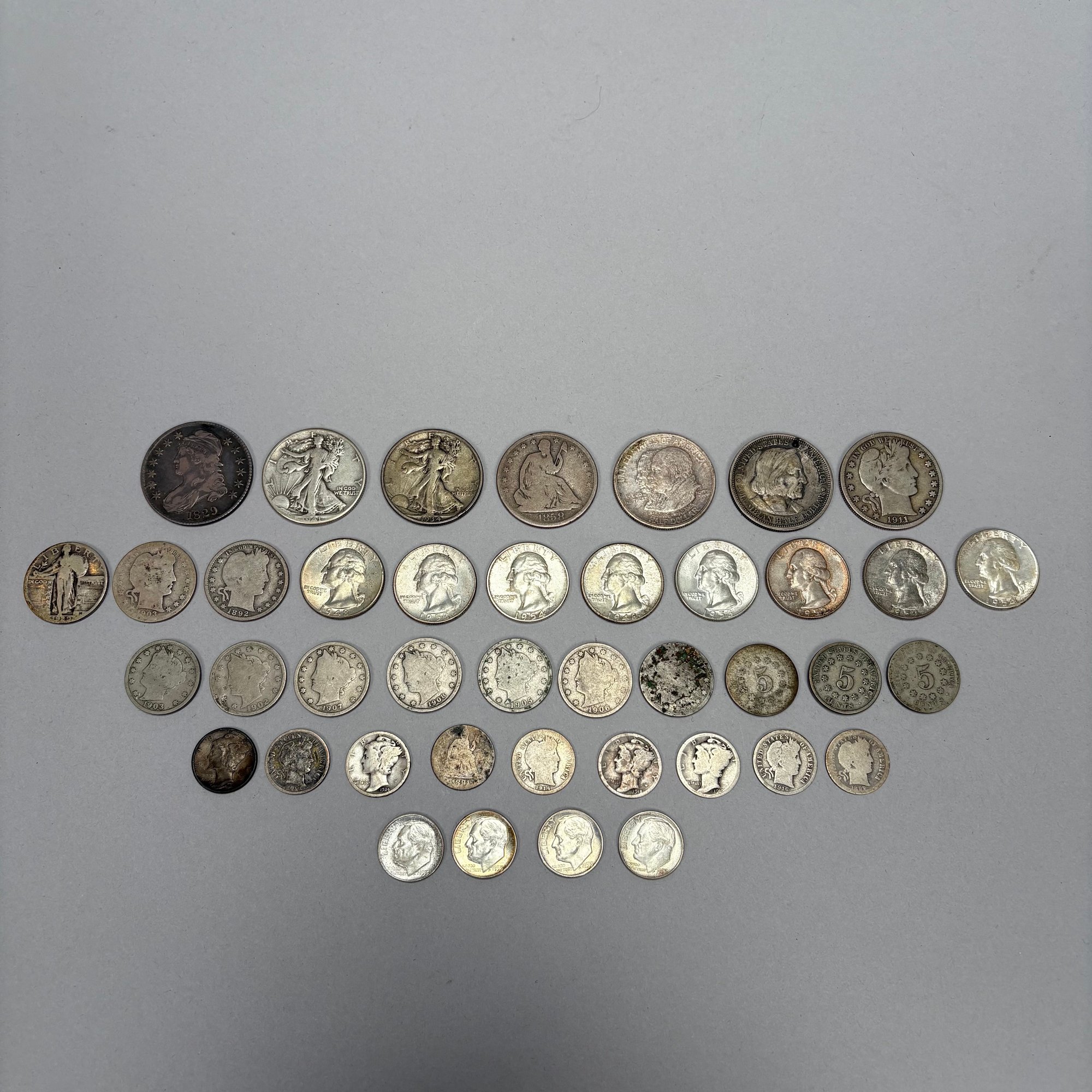 Forty-One Assorted United States Silver Coins. Including an 1829 Capped Bust Half Dollar and 1858-O Seated Liberty Half Dollar.