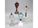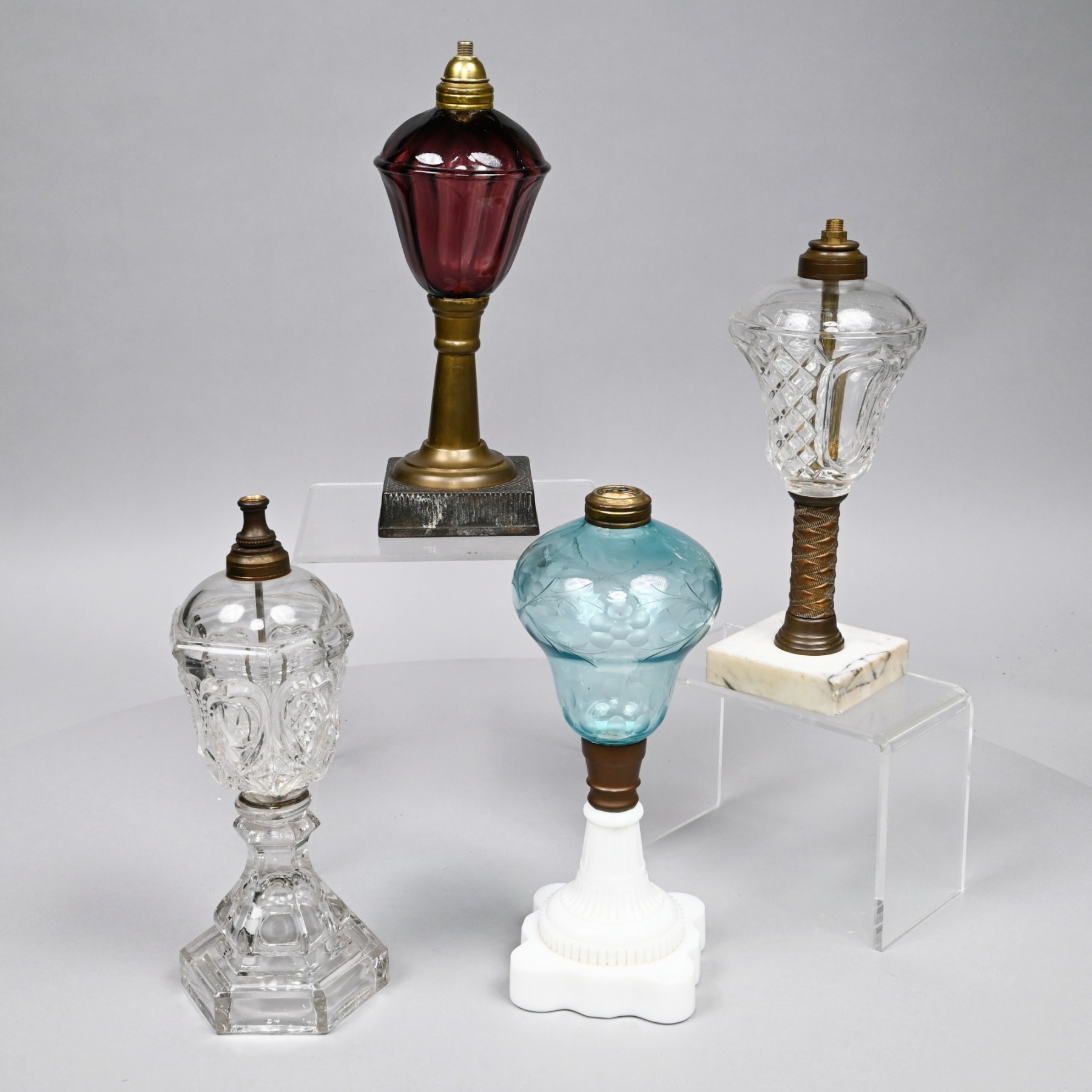 1850-70. Comprising a colorless glass 'Diamond and Hearts' lamp, Boston & Sandwich Glass Co.; a colorless panel and trellis diamond patterned lamp on a brass standard and marble base; a lamp with pale blue font engraved with flowers and leaf devices, on an opaque white base; and a lamp with amethyst paneled font on a brass standard and cast metal base. Height of tallest: 11 in., W: 4 in., D: 4 in.