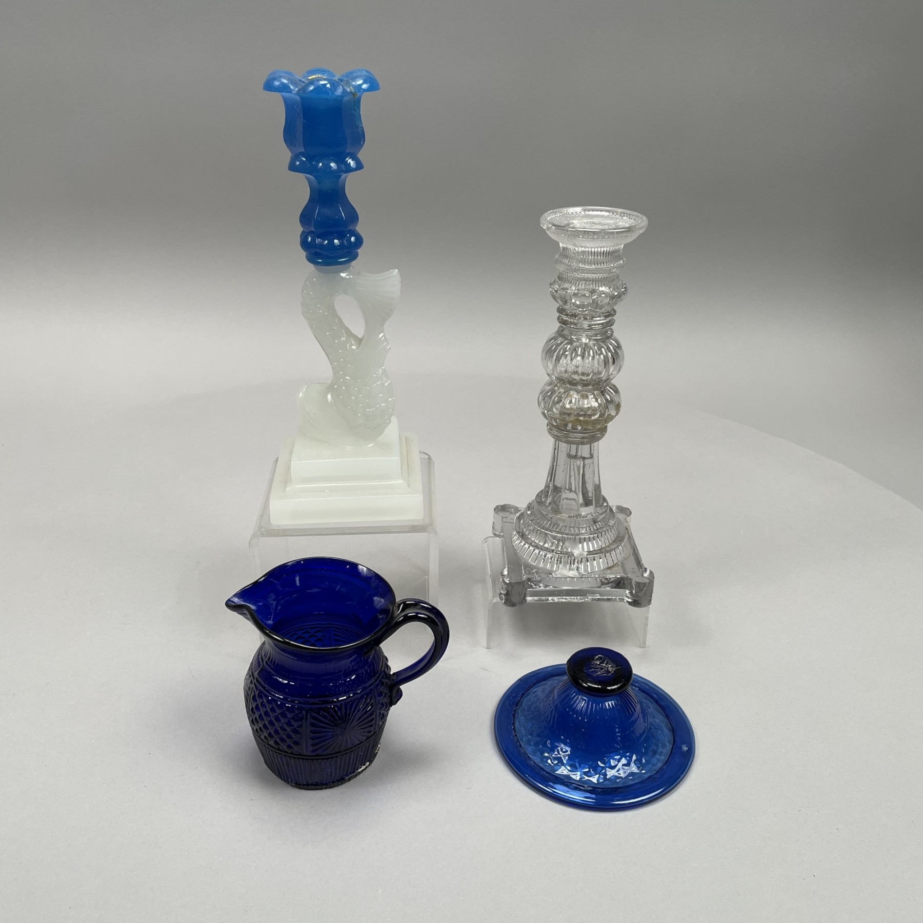 Comprising a New England blue GIII-14 cream pitcher, 1820-40, h: 4.25 in.; a colorless Lacy pressed candlestick, 1830-35; a Boston & Sandwich Glass Co. blue and clambroth 'Dolphin' candlestick, 1840-60; and a GII-22 blue base, diam. 4.625 in.