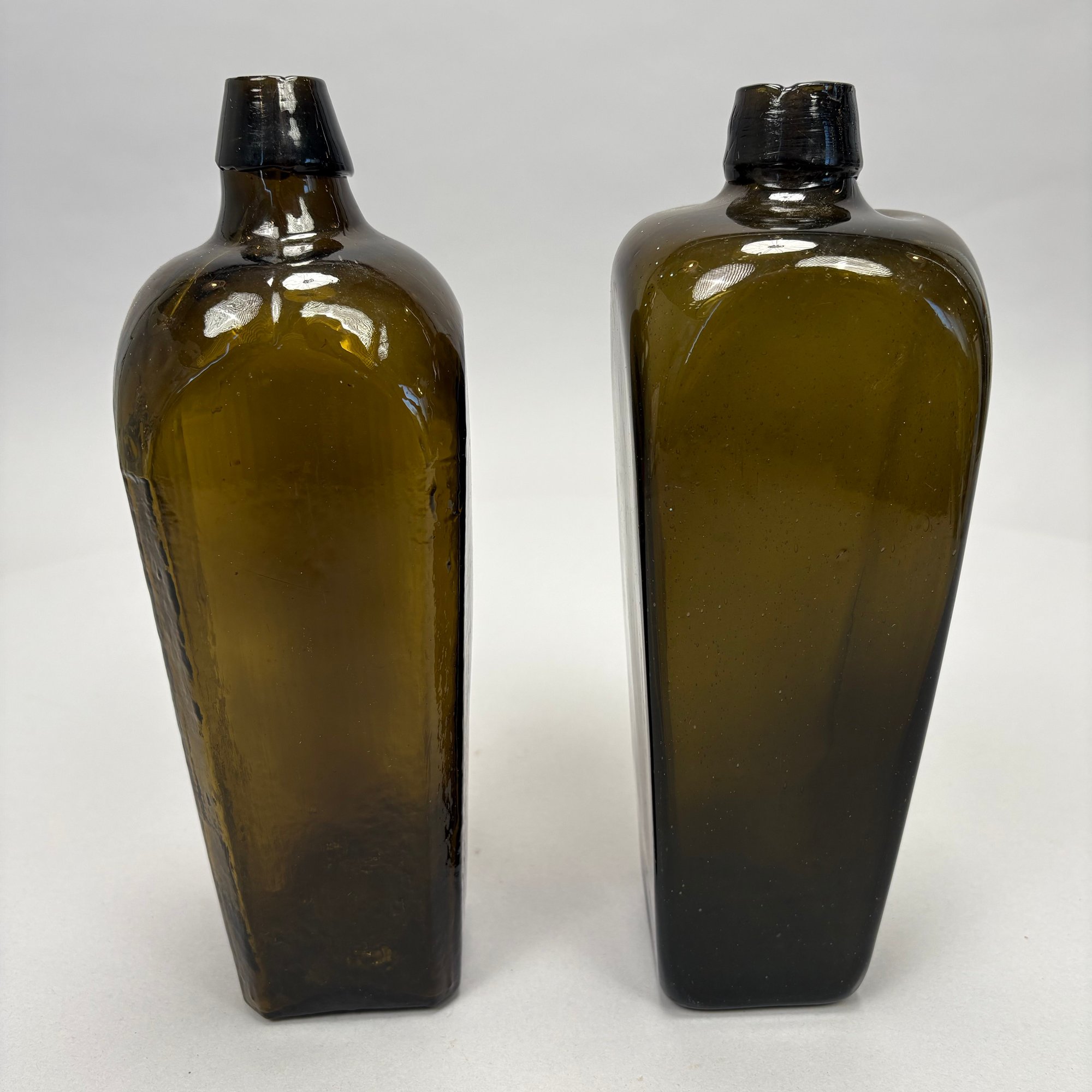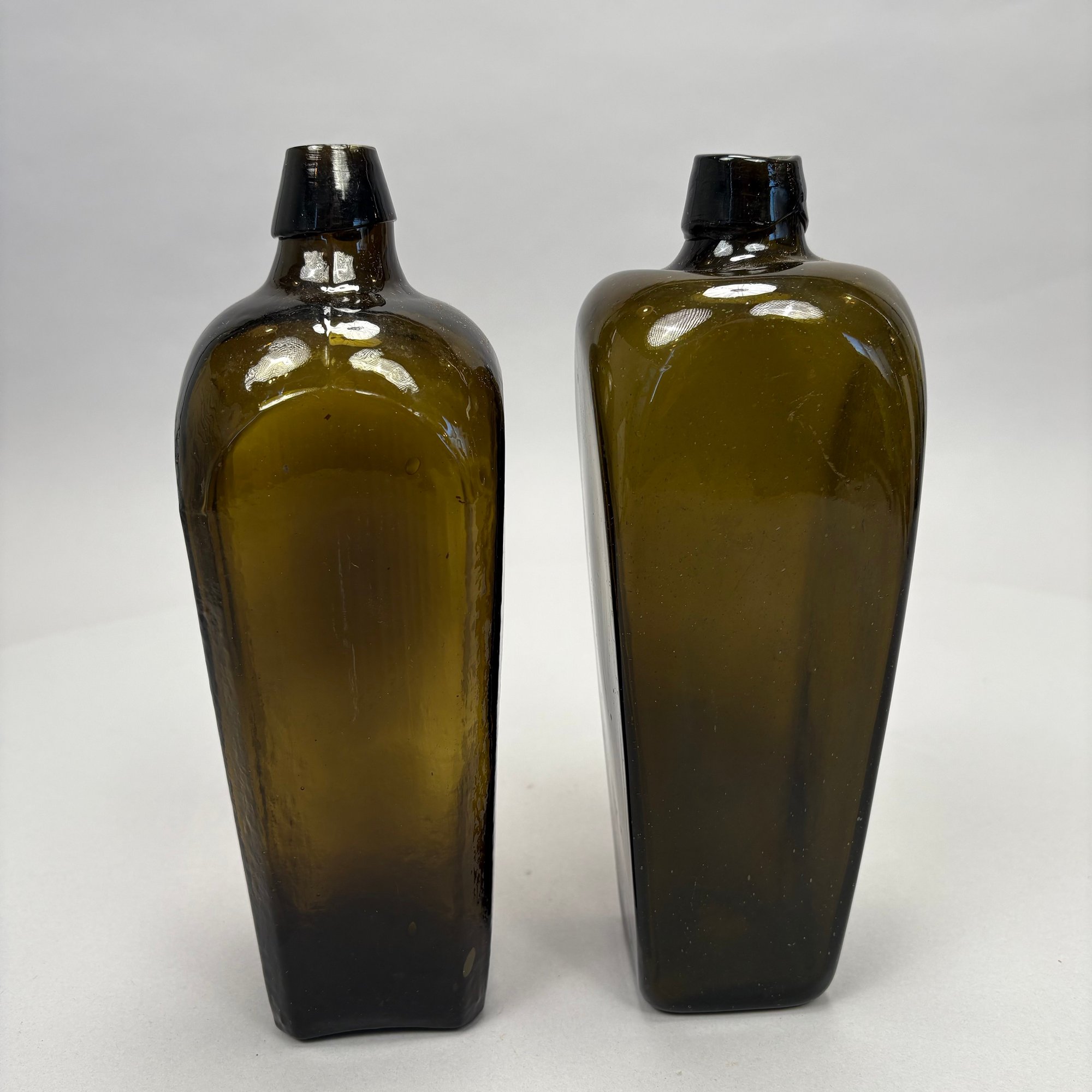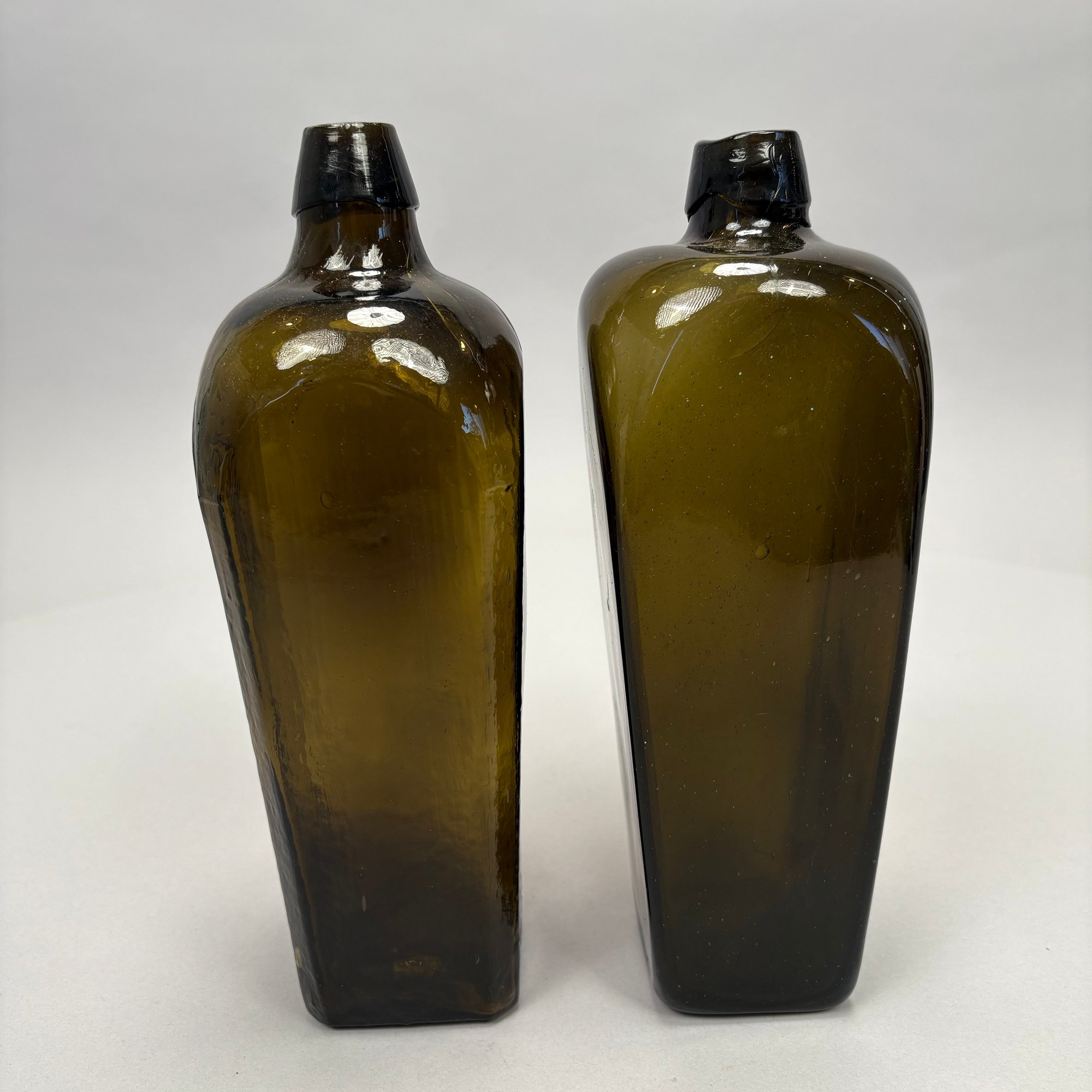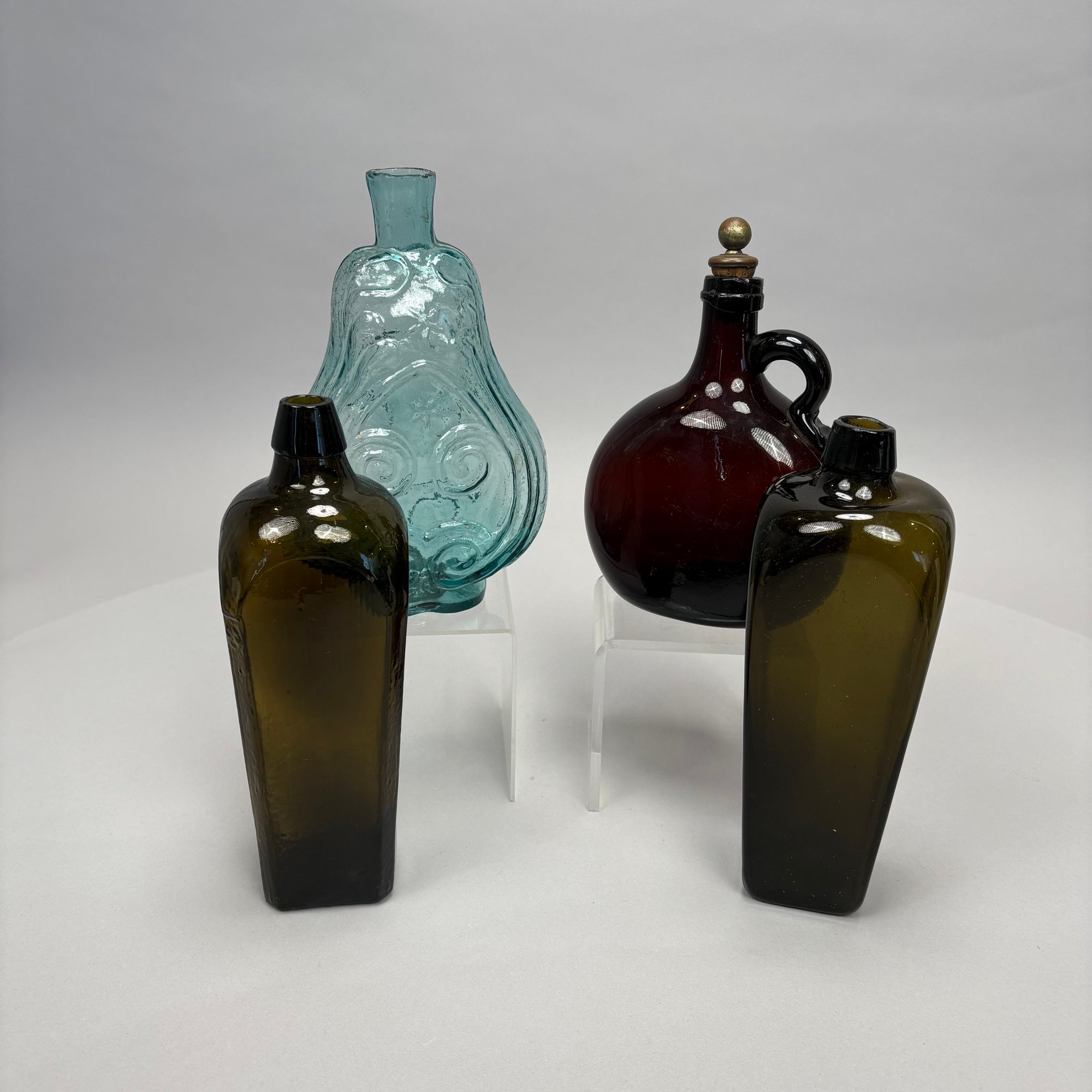 Four American Glass Utilitarian Bottles, 19th Century. Comprising a circular flask with handle in dark amber, a 'Scroll' flask in pale aquamarine, and two case or gin bottles in dark olive green.