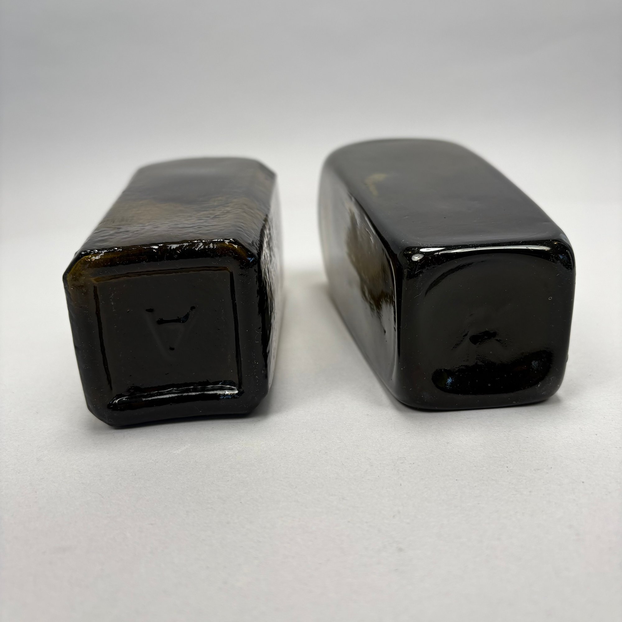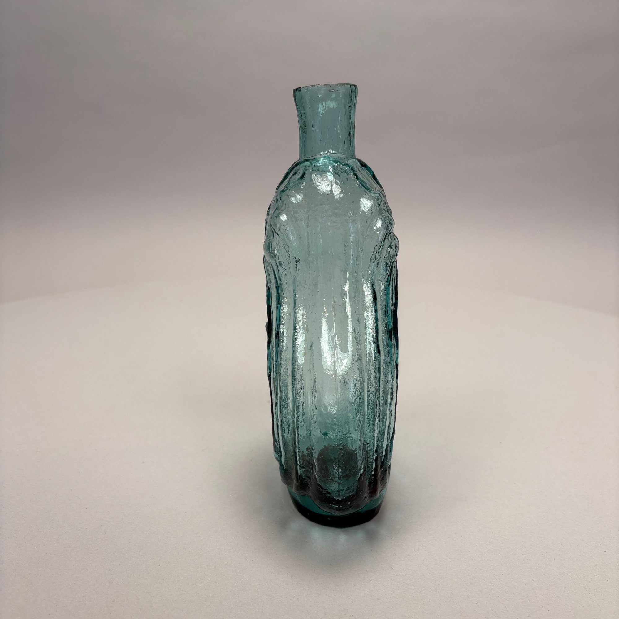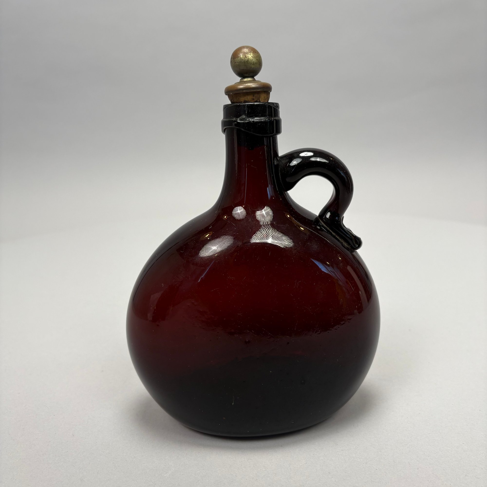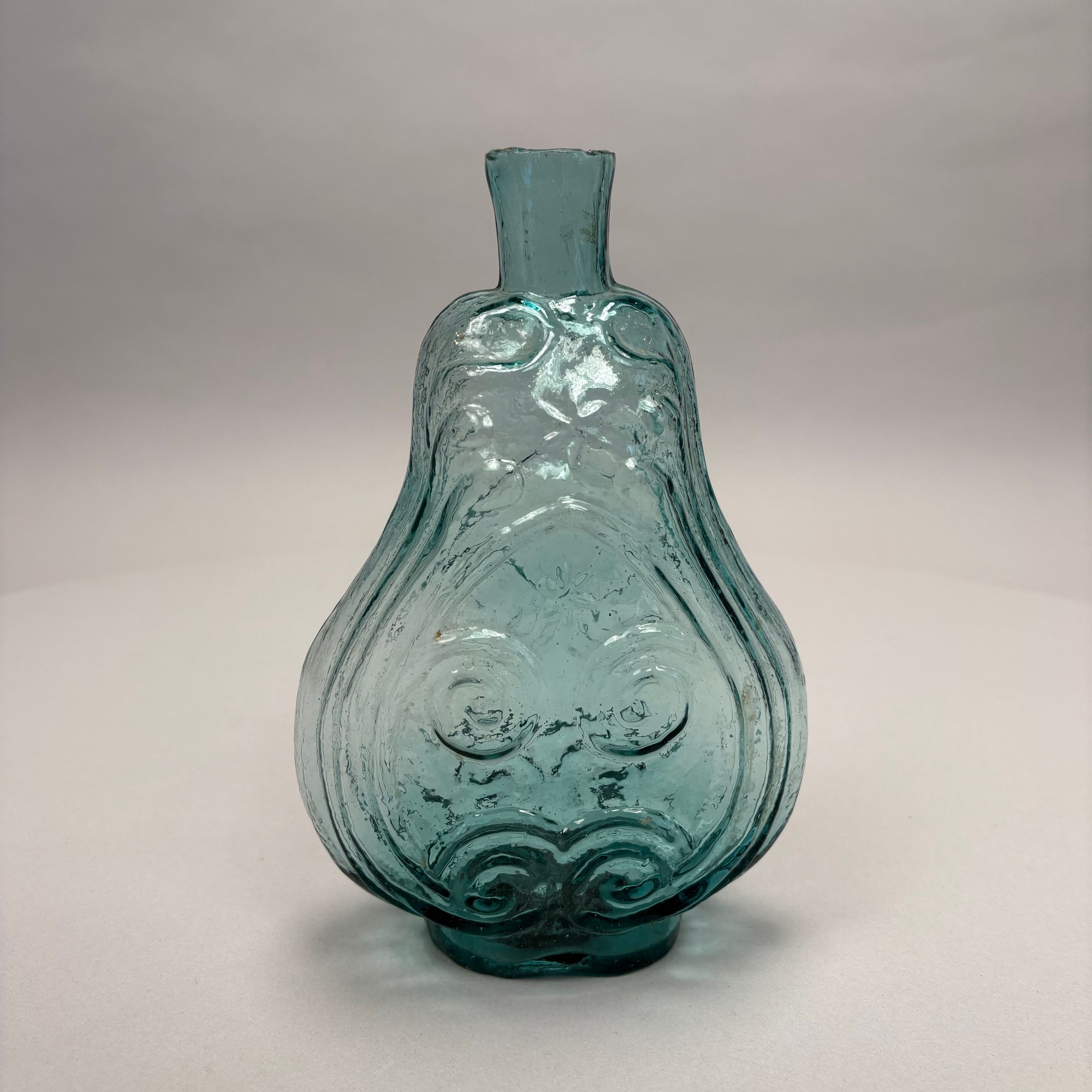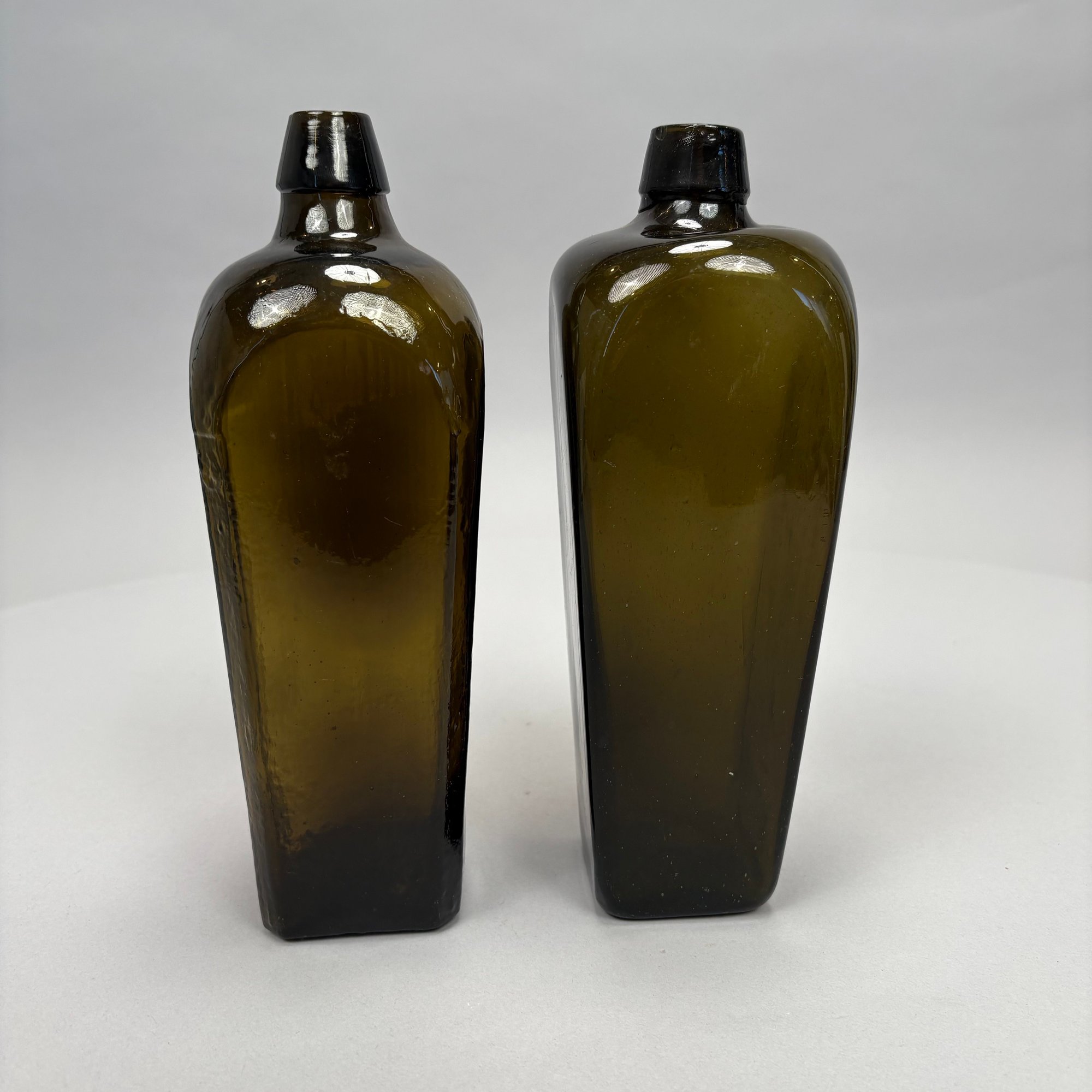 Four American Glass Utilitarian Bottles, 19th Century. Comprising a circular flask with handle in dark amber, a 'Scroll' flask in pale aquamarine, and two case or gin bottles in dark olive green.
