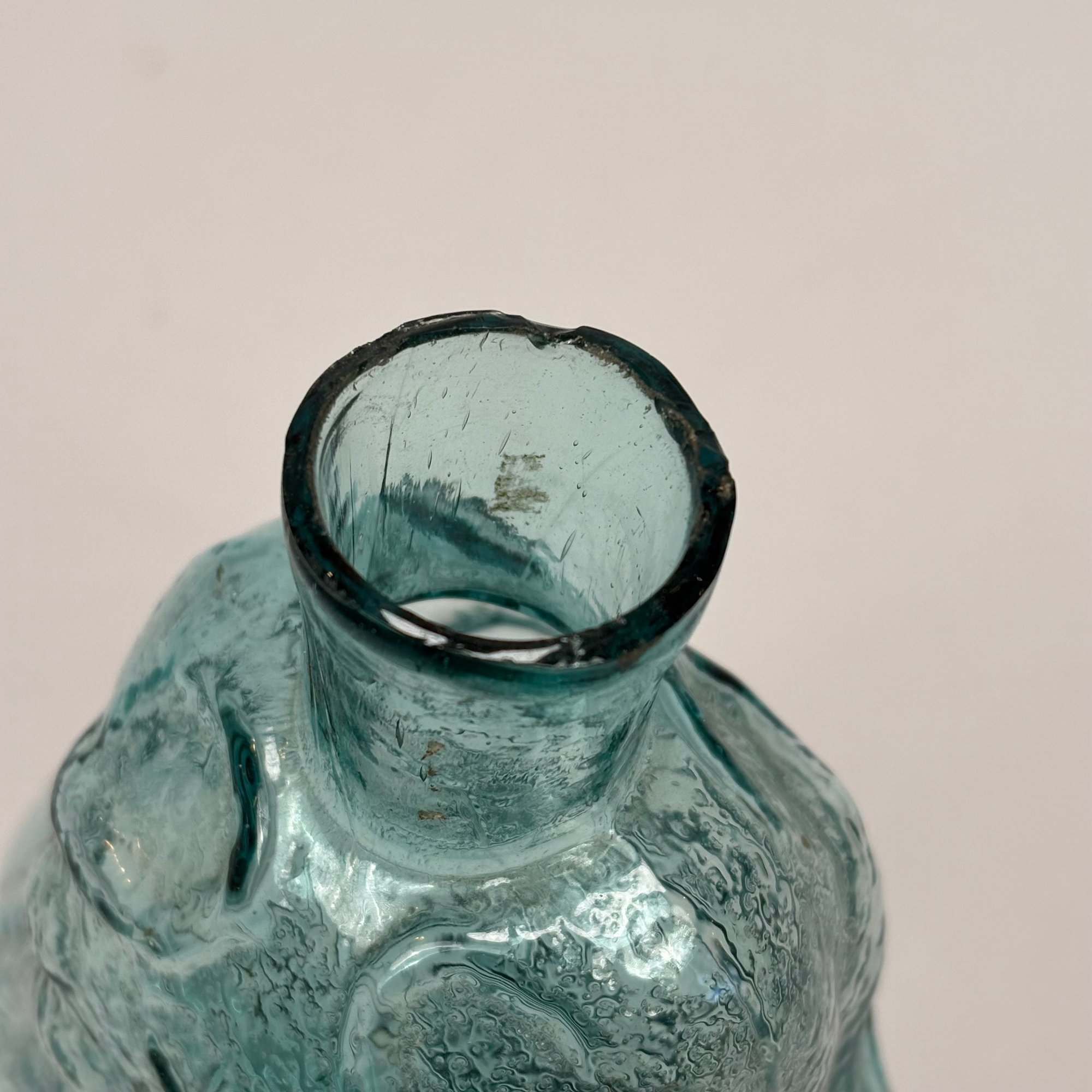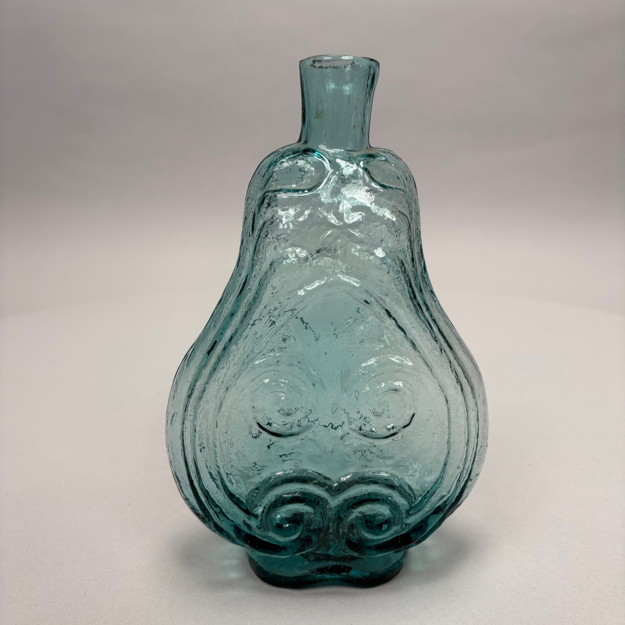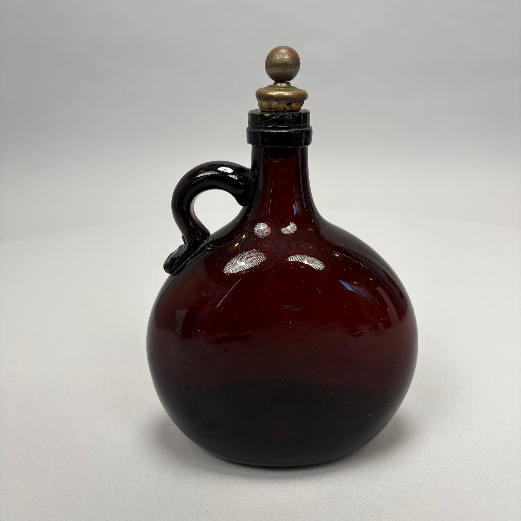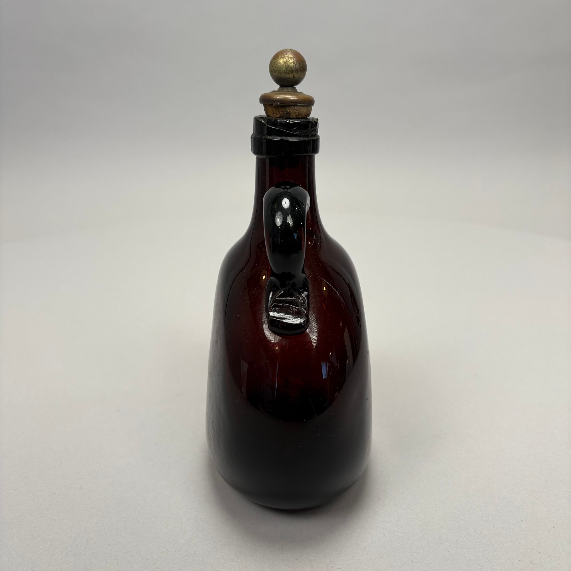 Four American Glass Utilitarian Bottles, 19th Century. Comprising a circular flask with handle in dark amber, a 'Scroll' flask in pale aquamarine, and two case or gin bottles in dark olive green.