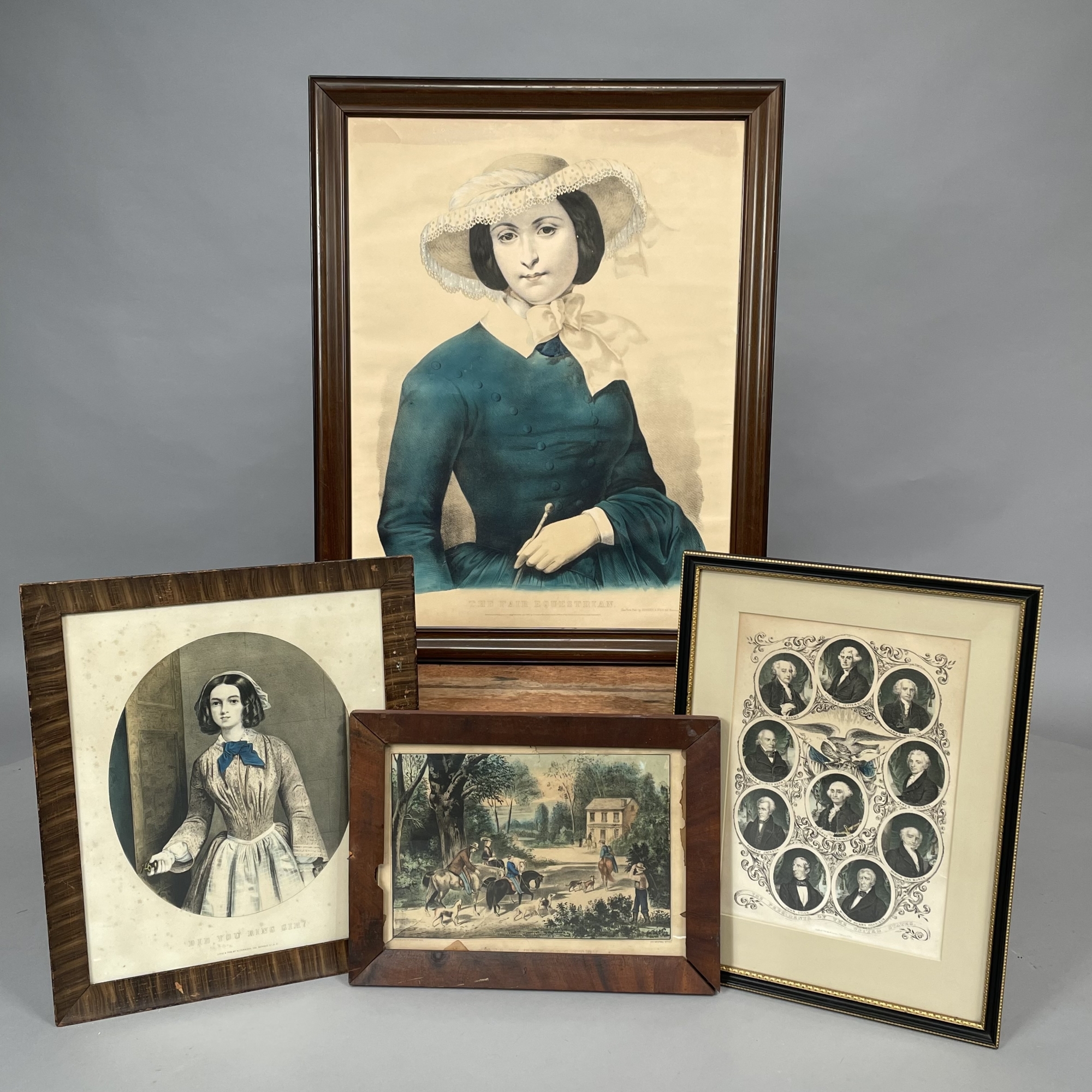 All framed, comprising "THE FAIR EQUESTRIAN," "DID YOU RING SIR?" and "SUMMER IN THE COUNTRY," Currier & Ives, and "THE PRESIDENTS OF THE UNITED STATES," N. Currier.