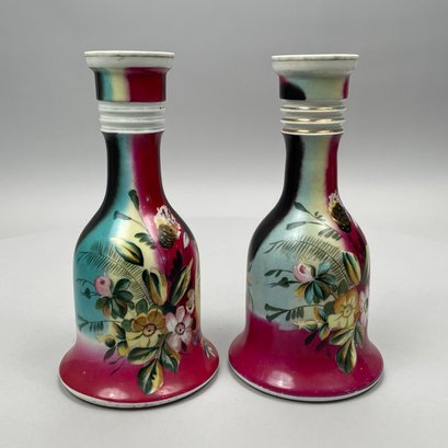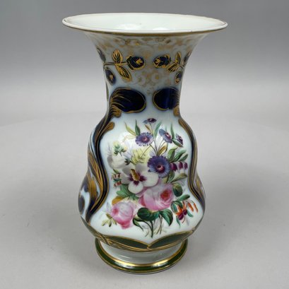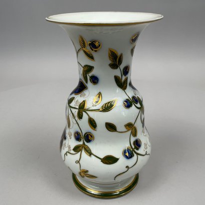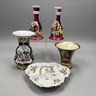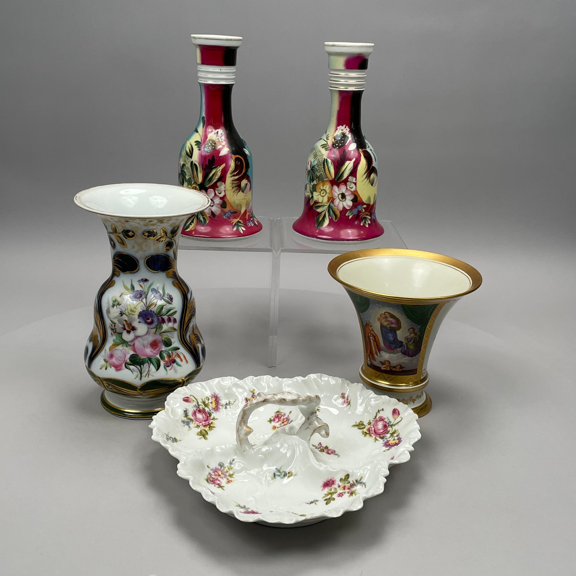 Four Continental Painted Porcelain Vases and a Dish, Mid-Nineteenth/ Early Twentieth Century. Comprising a vase painted after Raphael with a view of "The Sistine Madonna," marks in underglaze-blue; a pair of vases of mallet shape; a vase painted with a floral bouquet and berried branches; and a Limoges divided sweetmeat or serving dish, William Guerin, 1900-32, printed factory mark in green.