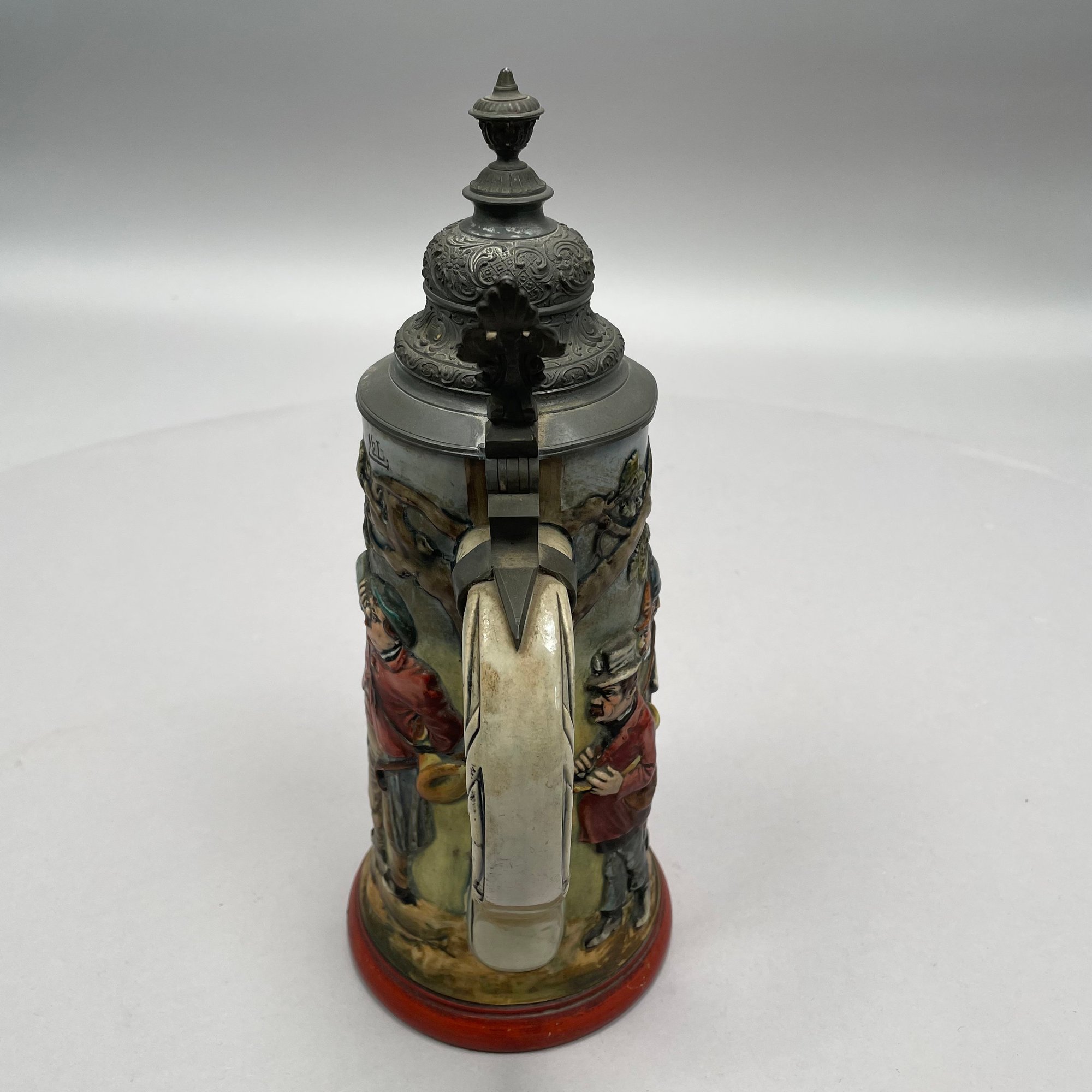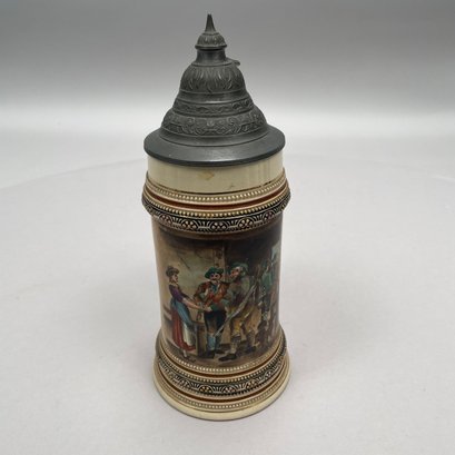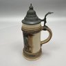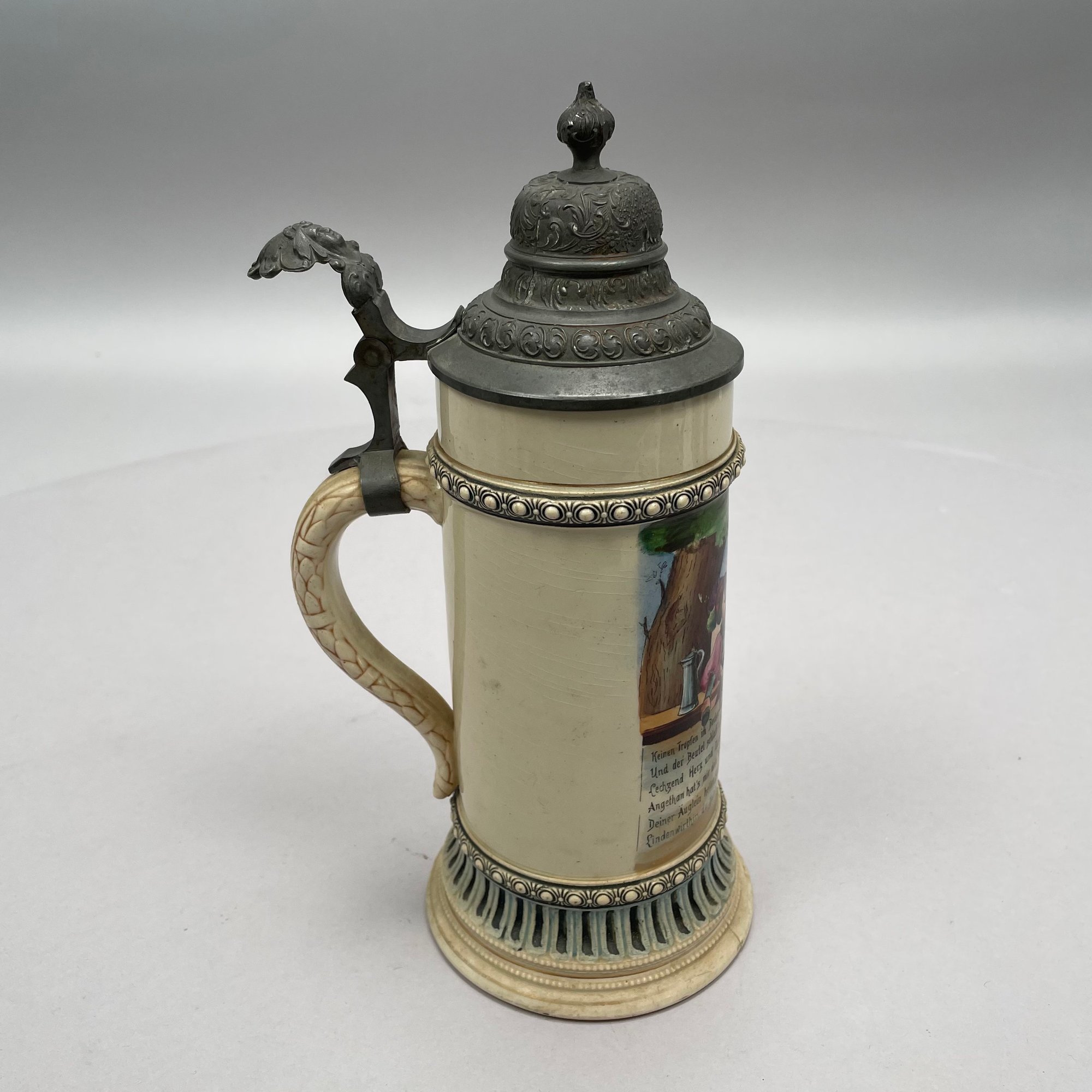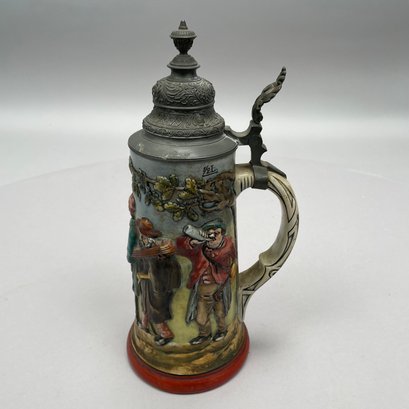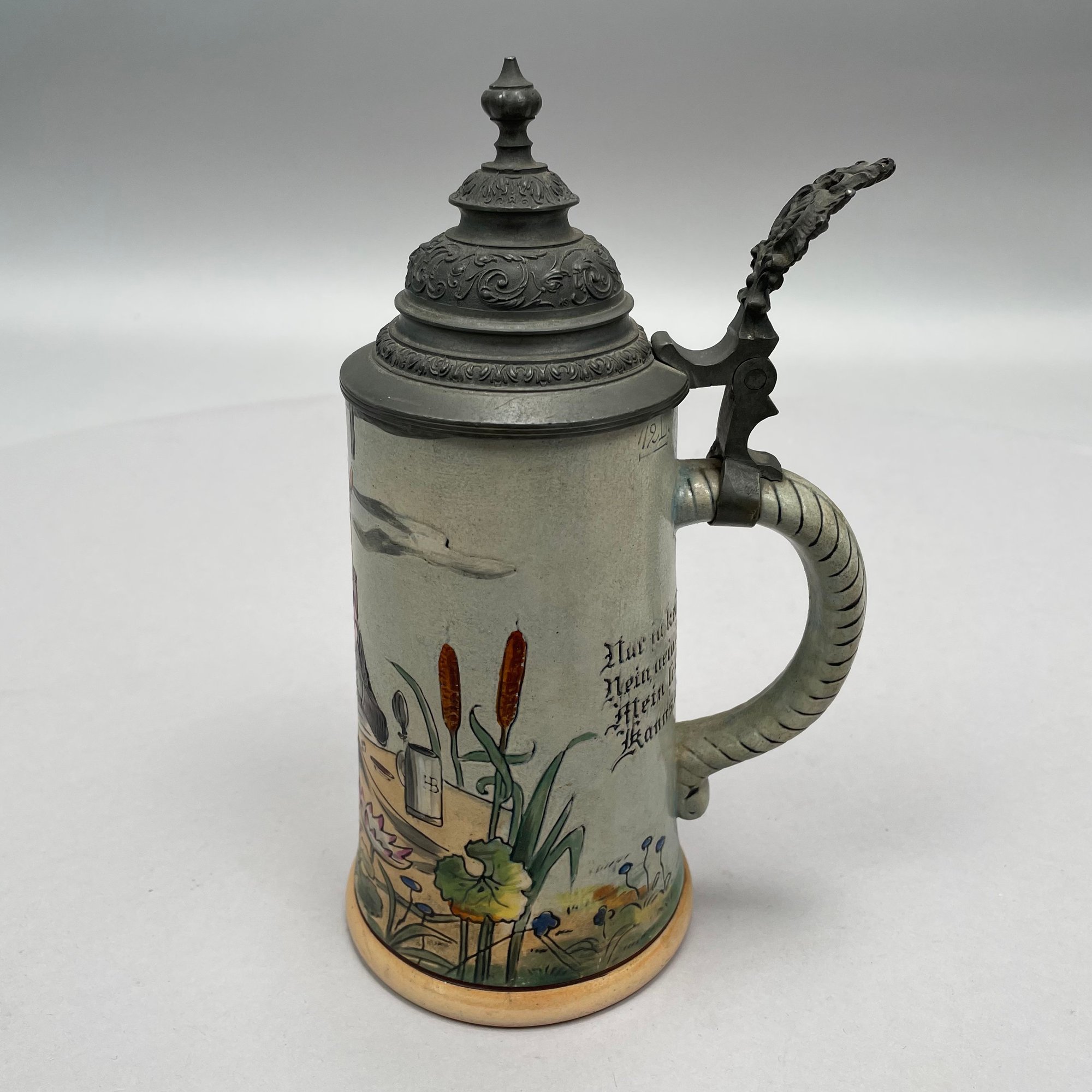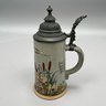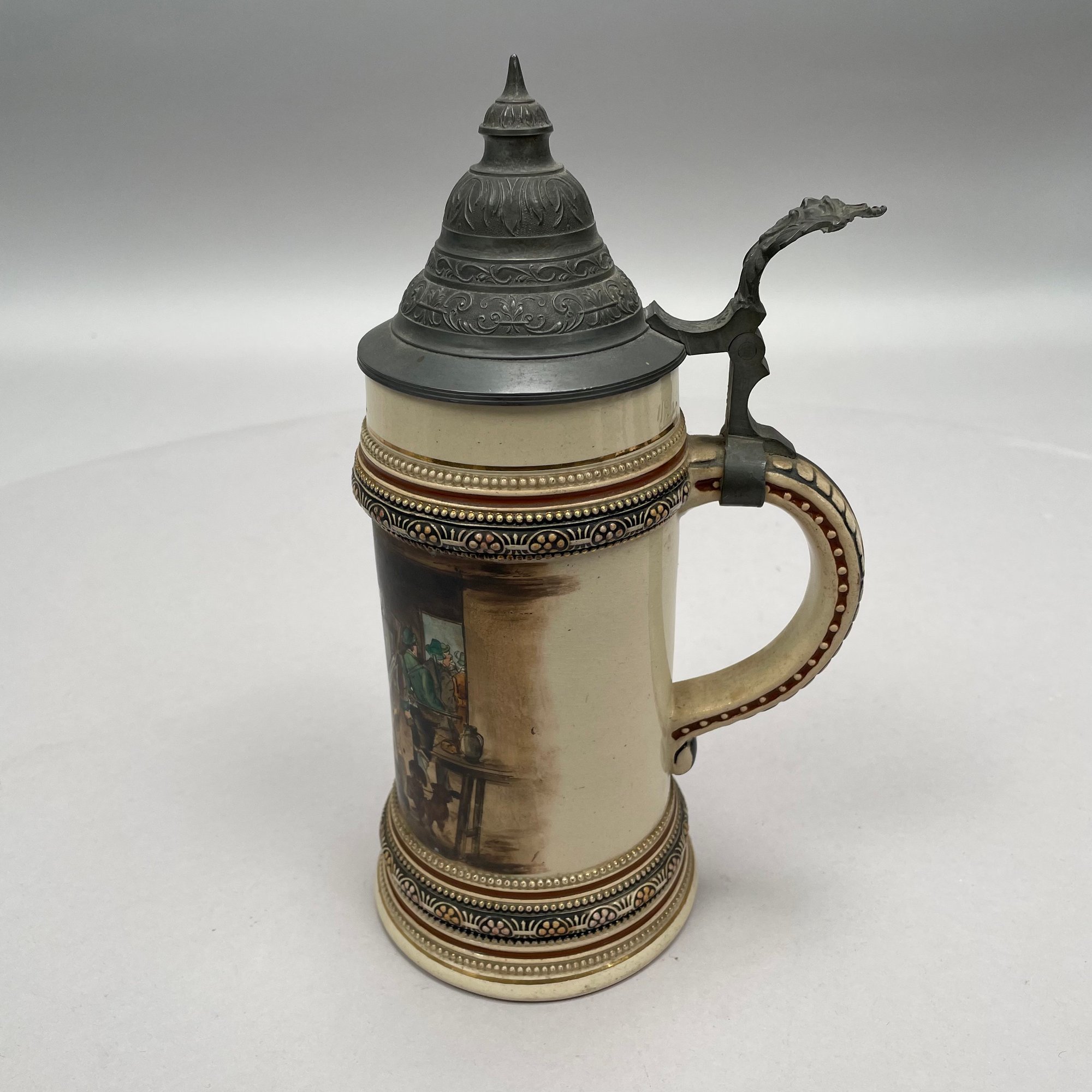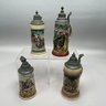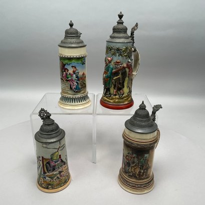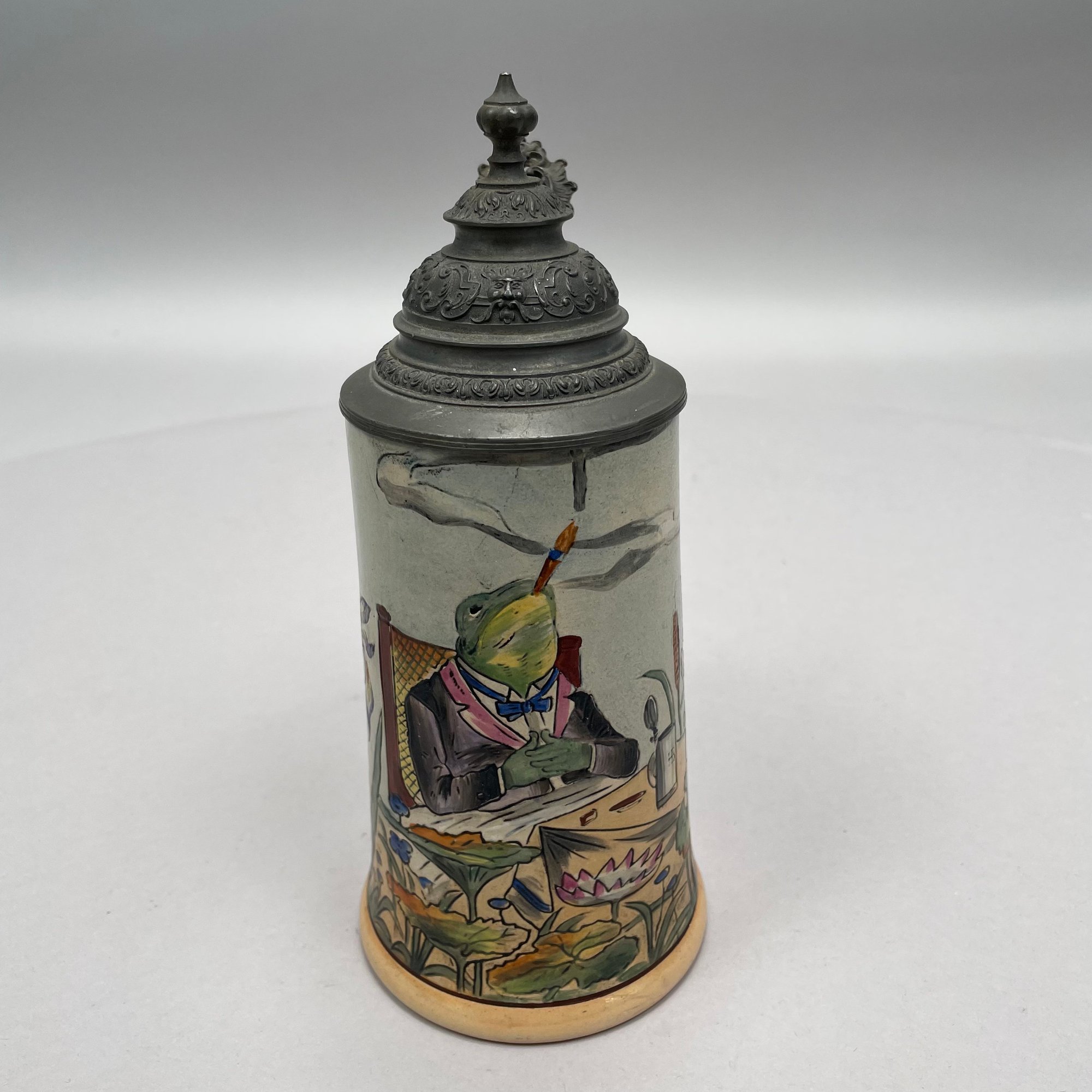 Four German Pottery Steins, Various Makers. Including a stein painted with a frog smoking and a stein painted with a departure scene, both Merkelbach & Wick, Hohr-Grenzhausen, Westerwald, 1879-1921, all with printed and impressed factory marks.