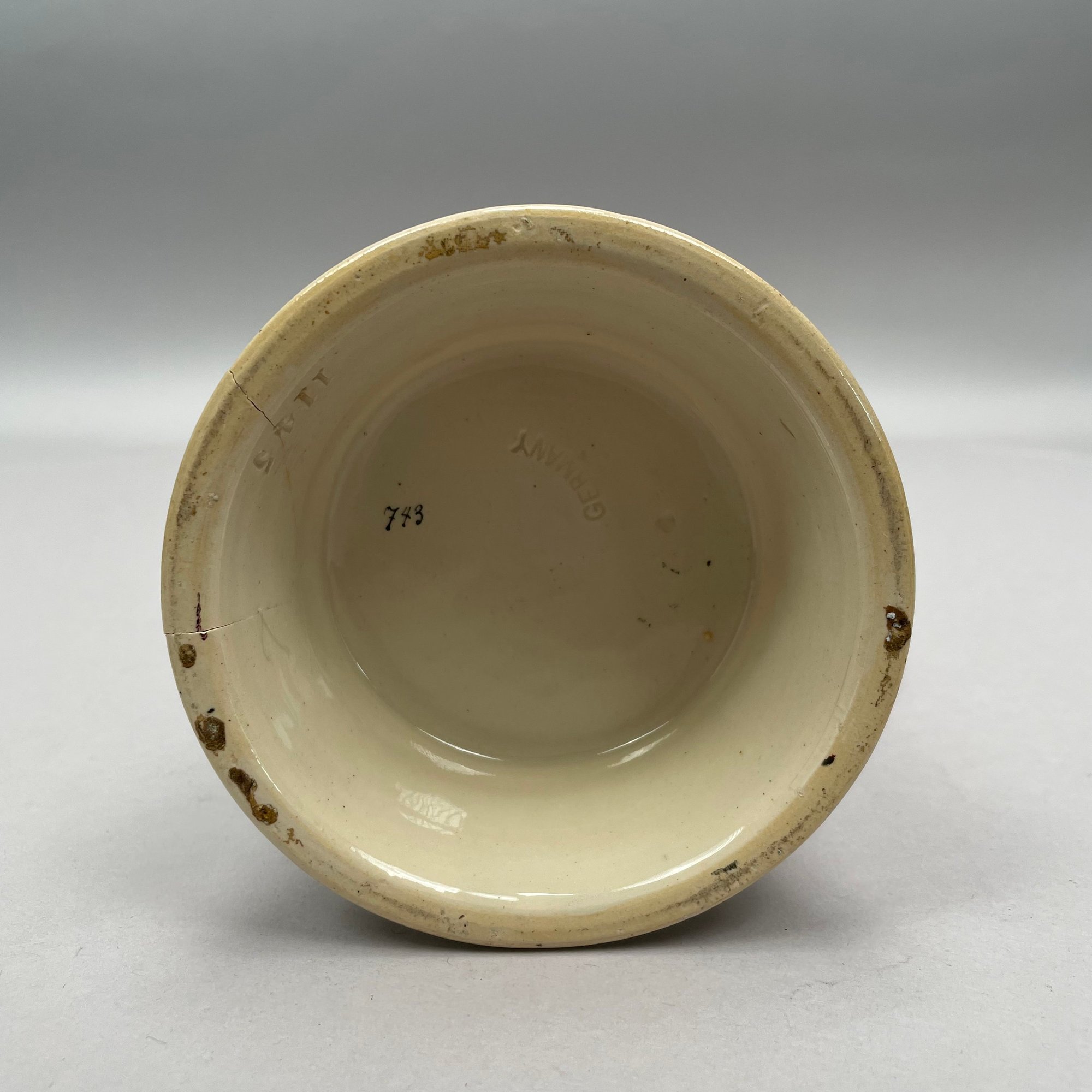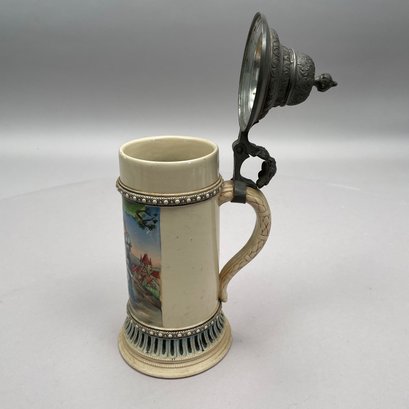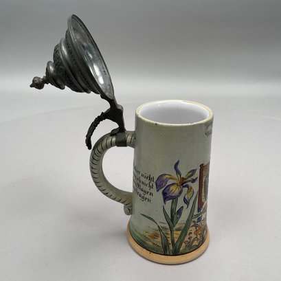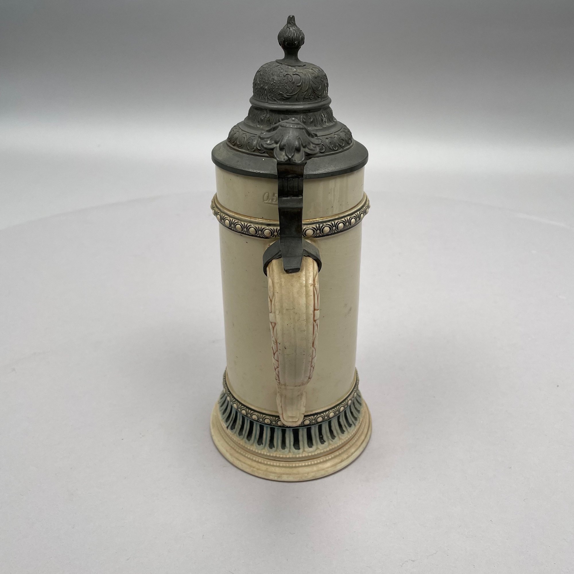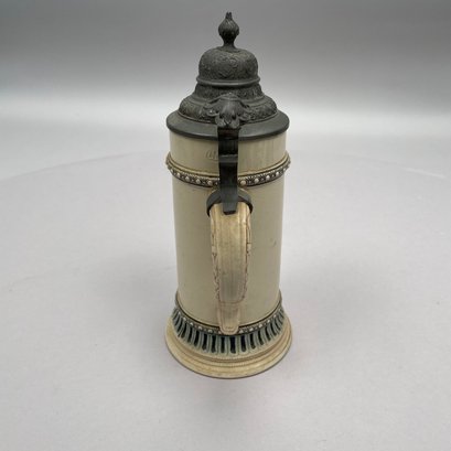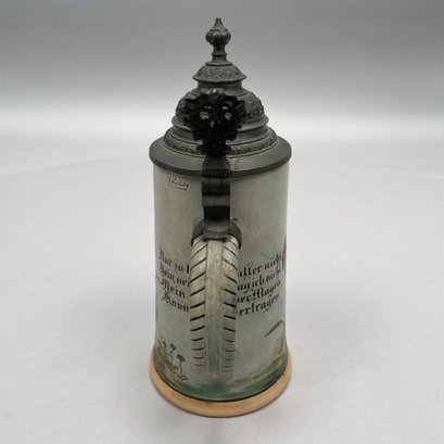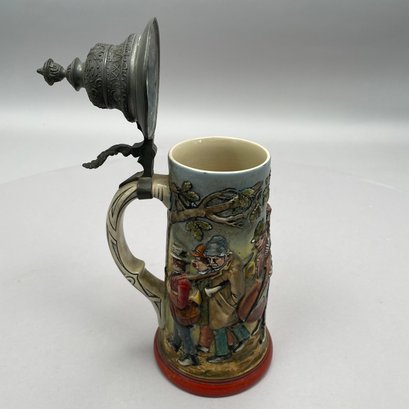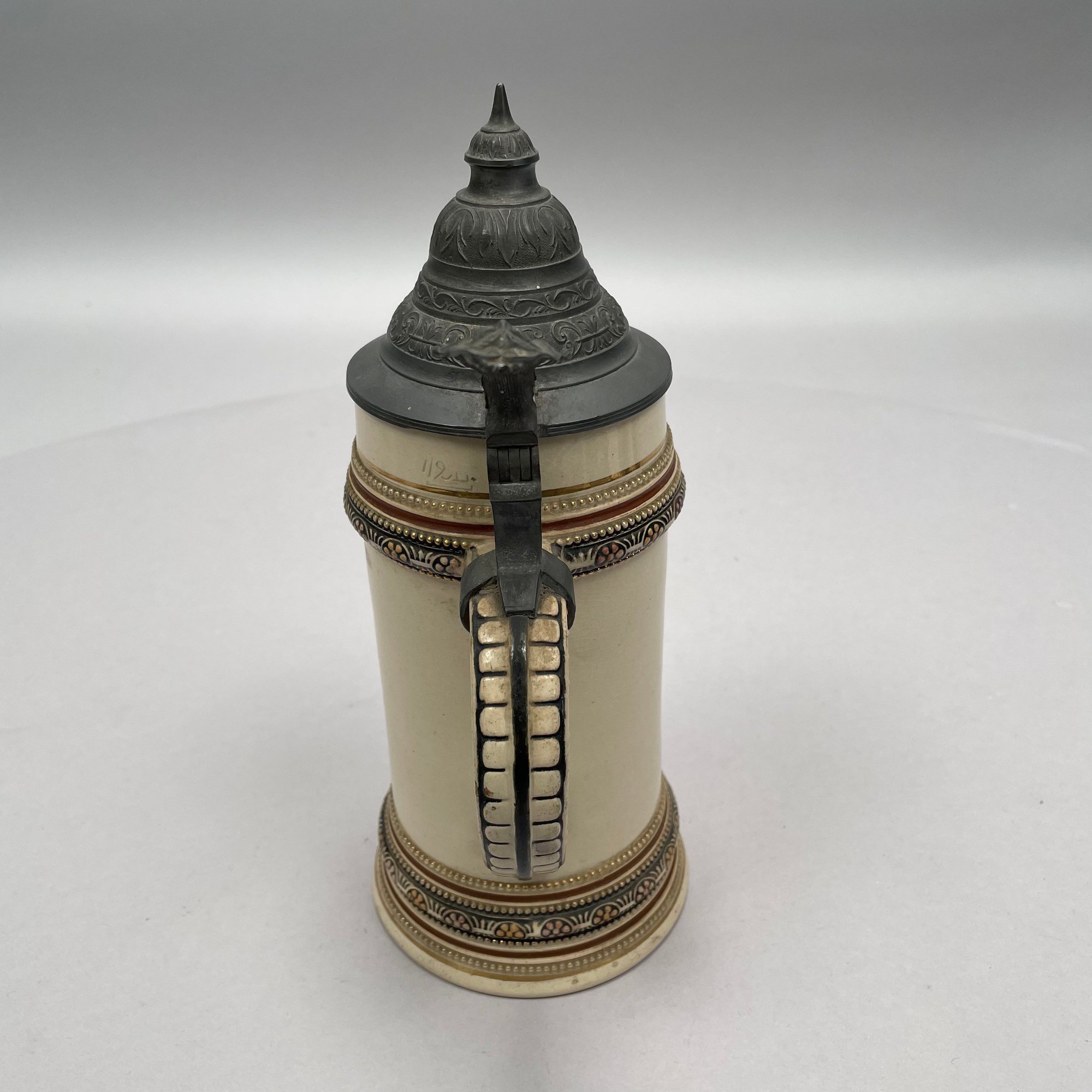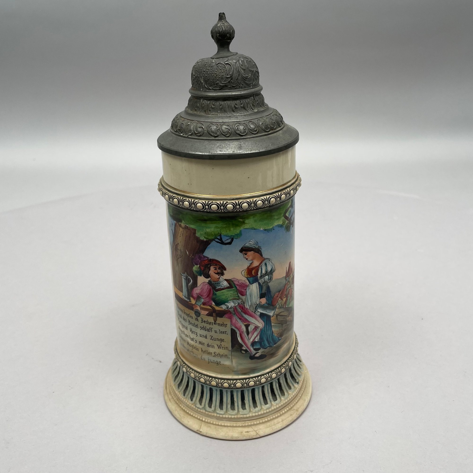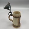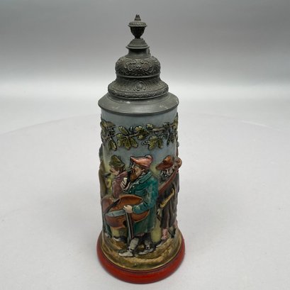 Four German Pottery Steins, Various Makers. Including a stein painted with a frog smoking and a stein painted with a departure scene, both Merkelbach & Wick, Hohr-Grenzhausen, Westerwald, 1879-1921, all with printed and impressed factory marks.