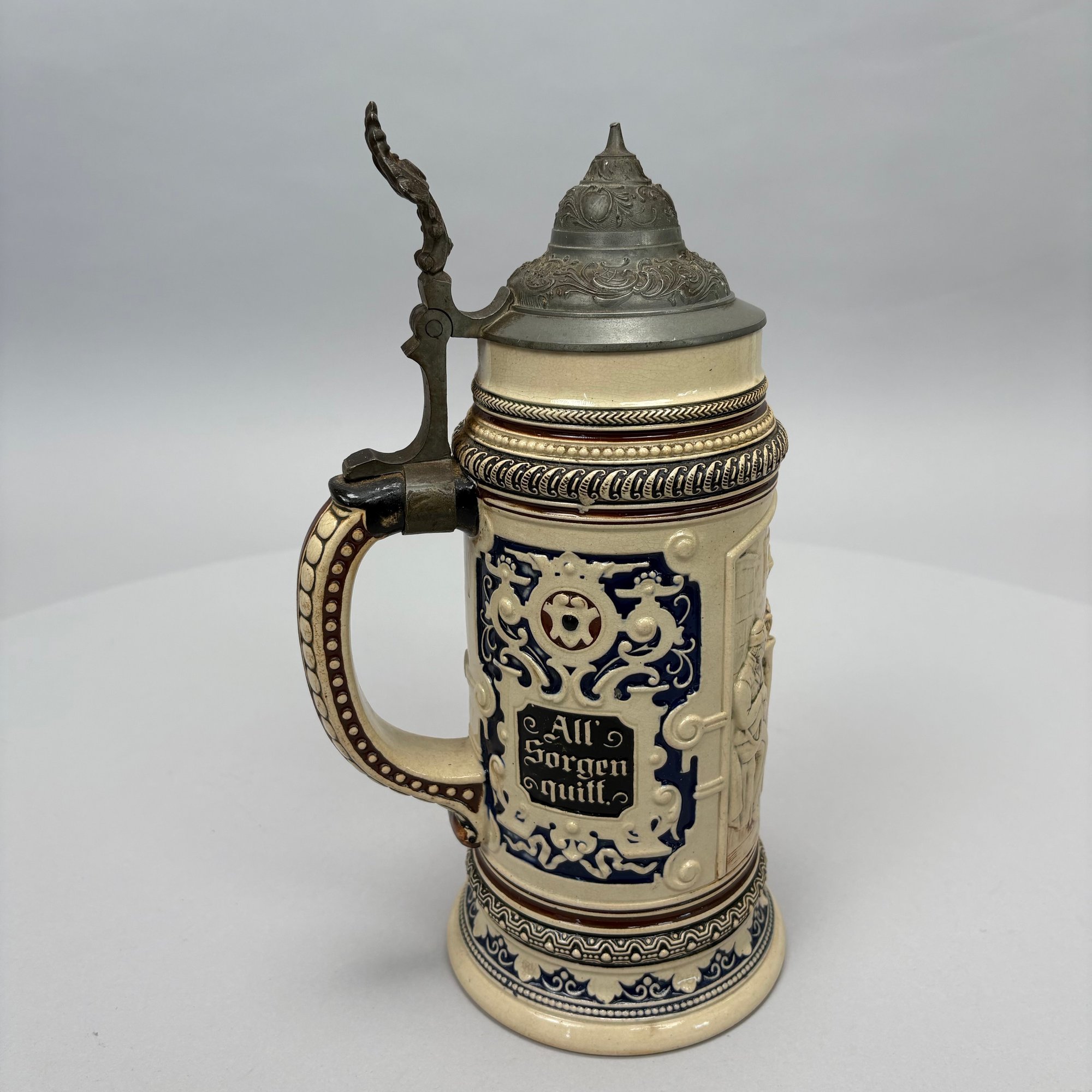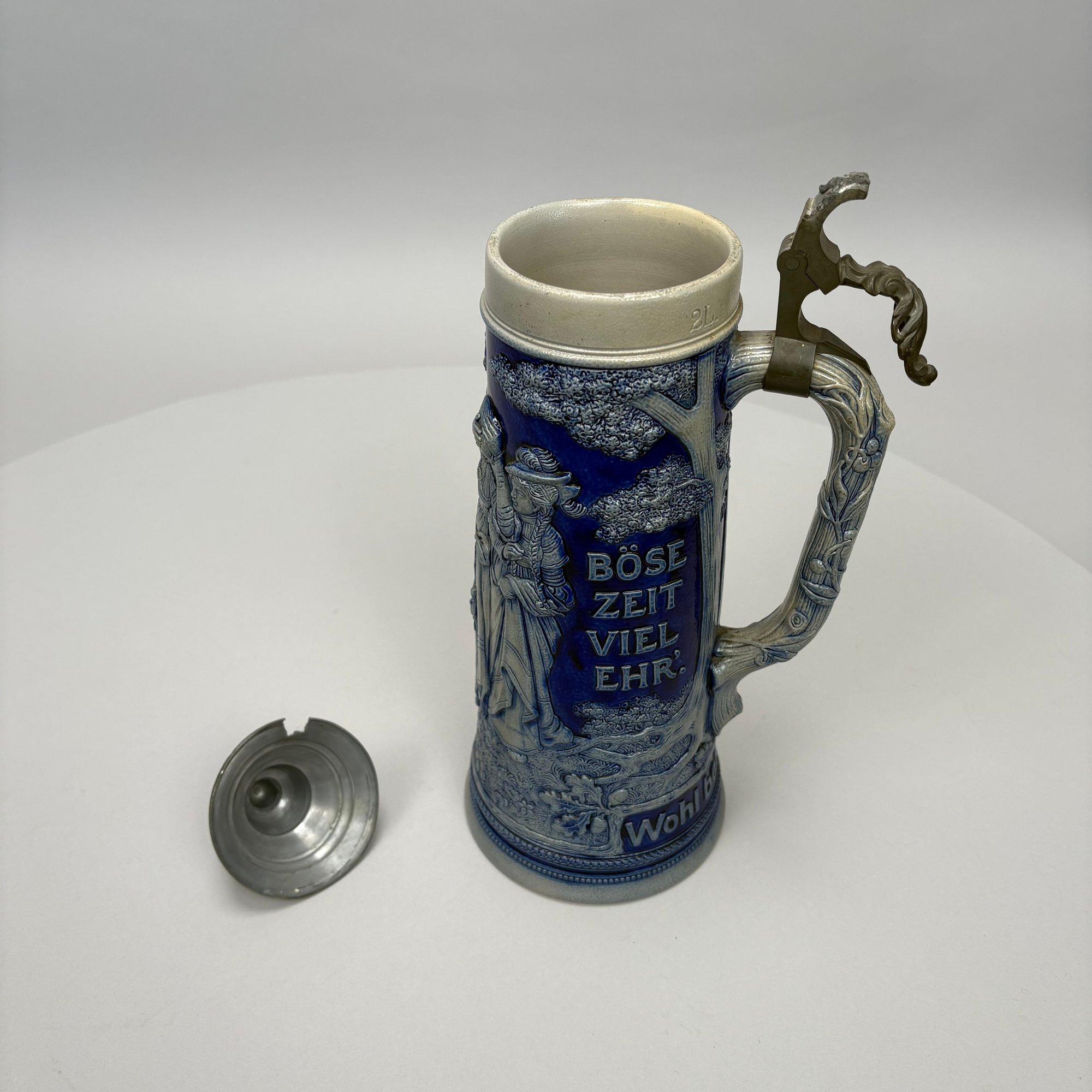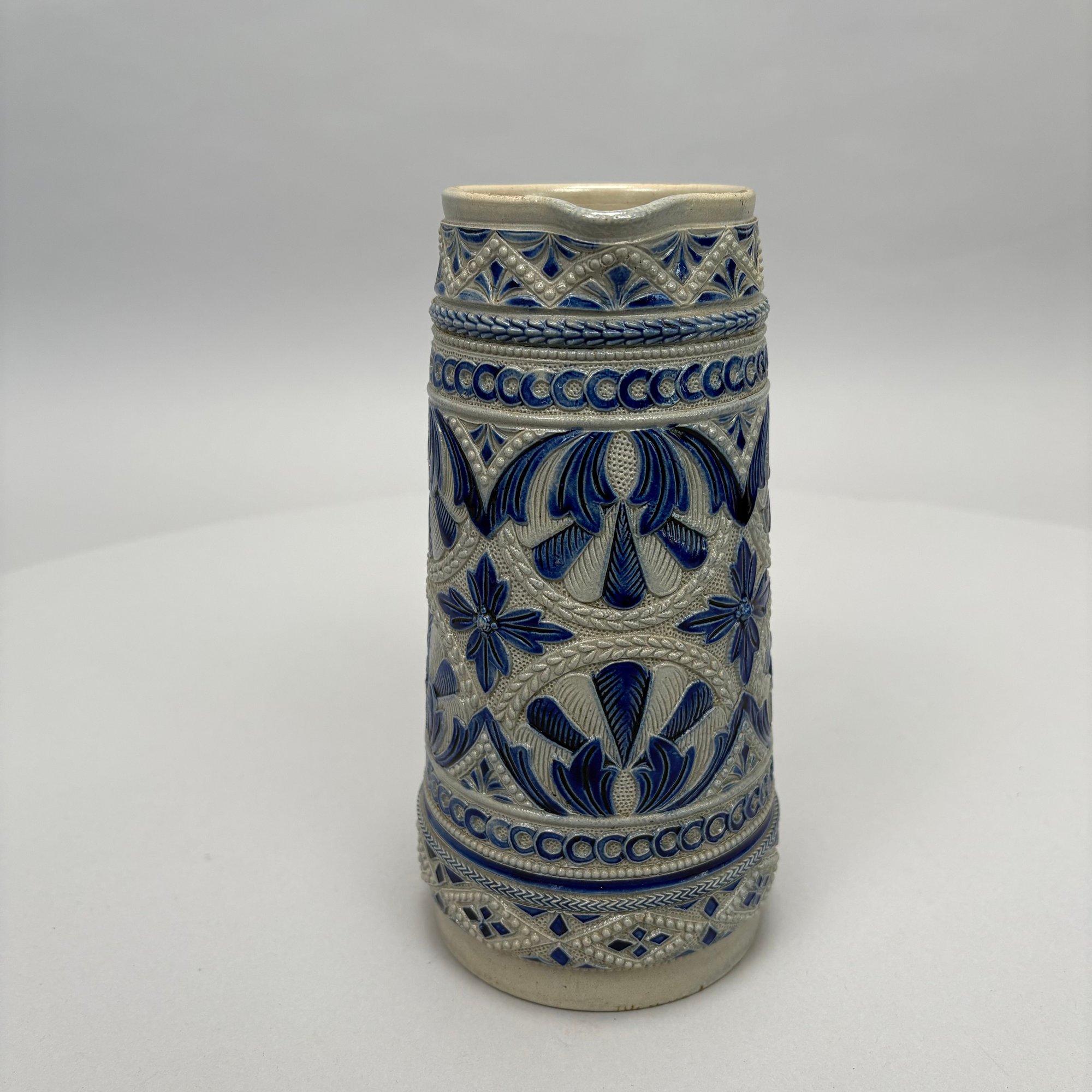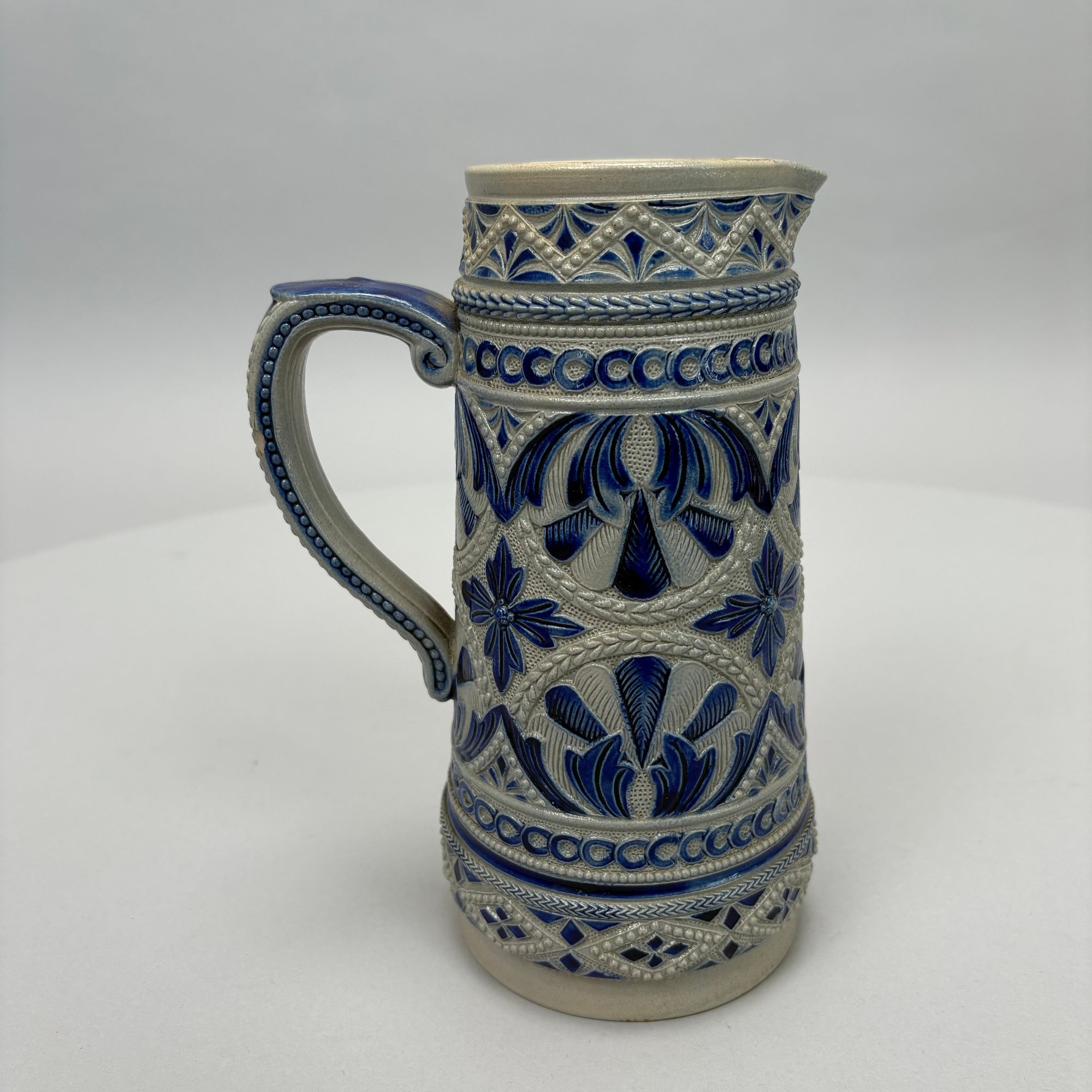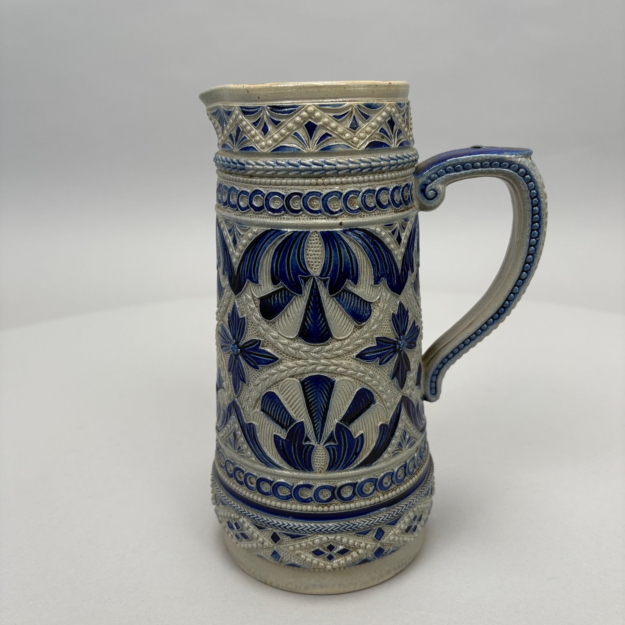 Four German Saltglaze Stoneware Steins with Pewter Lids and a Pitcher, Late 19th-20th Century. Including a pair of steins, Marzi & Remy, circa 1900, inscribed "In durstiger Mitt/ all Sorgen quitt" (In thirsty company all problems disappear).