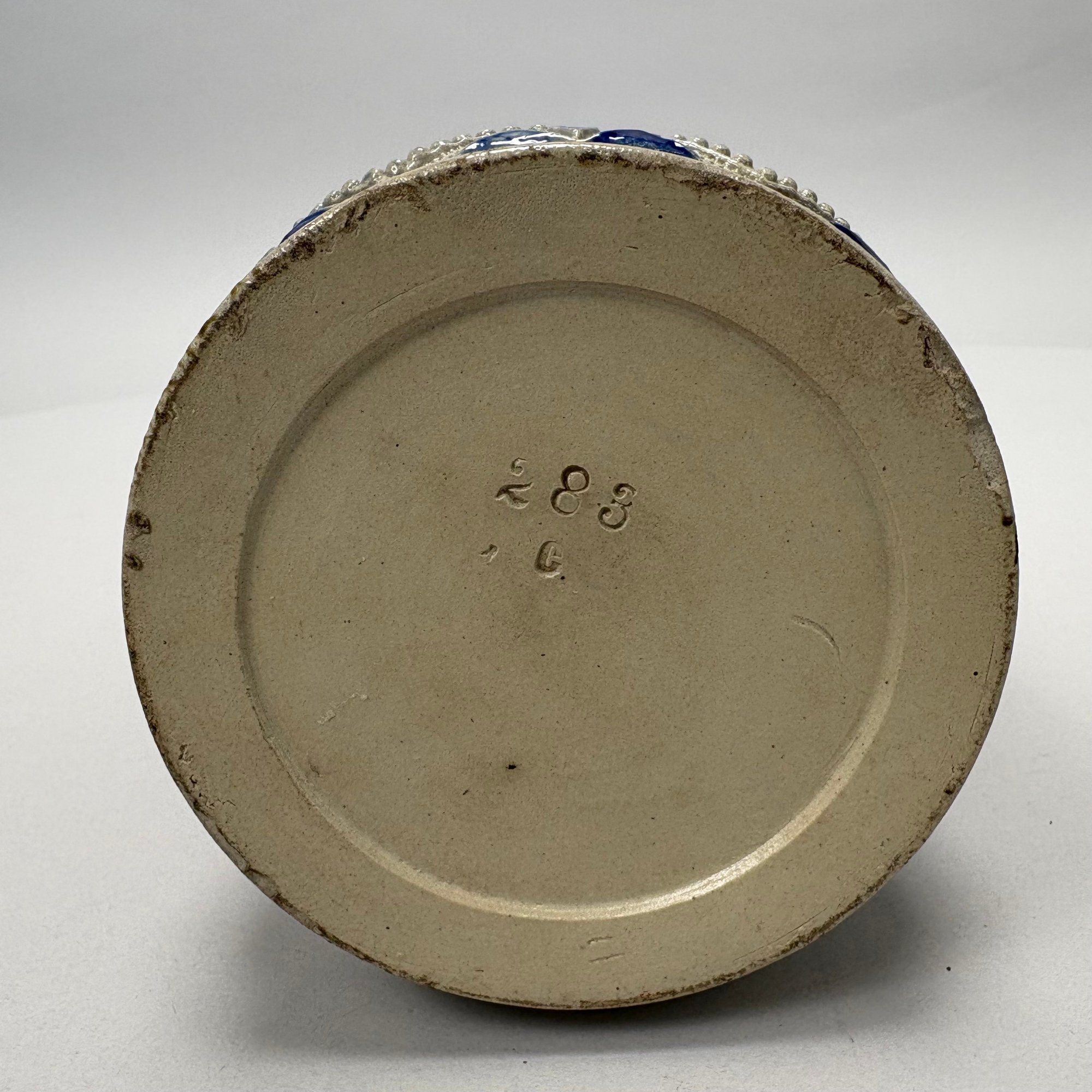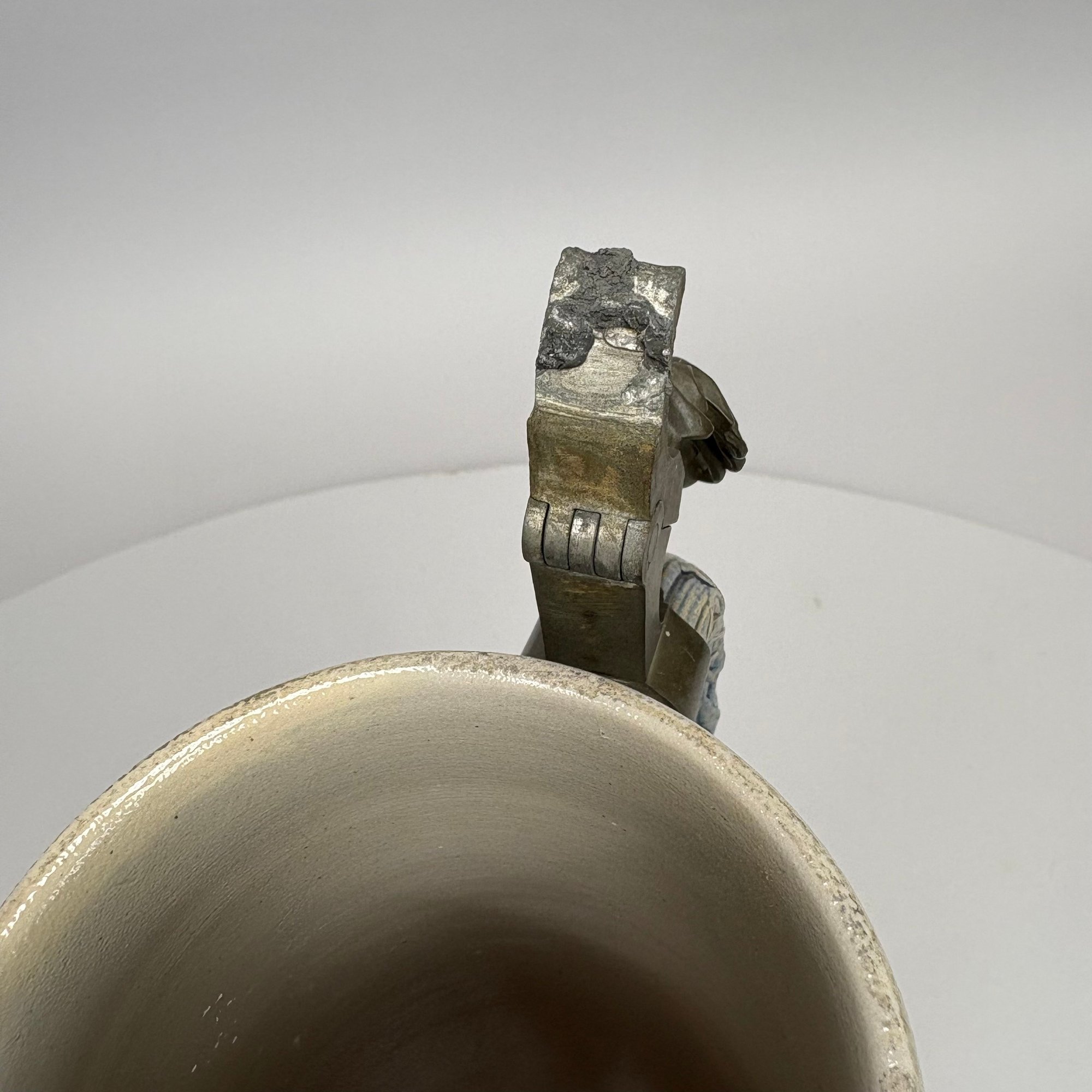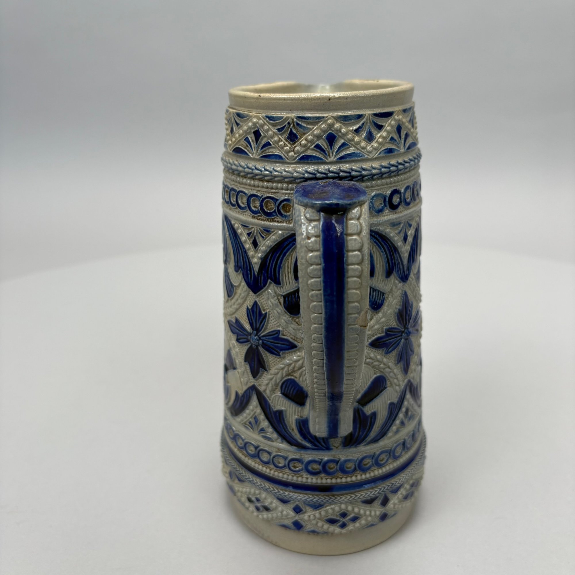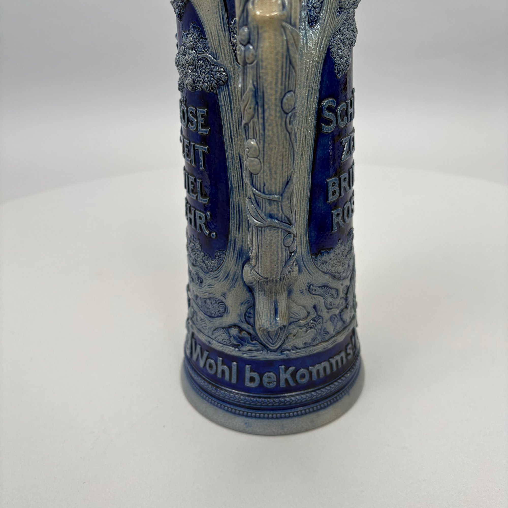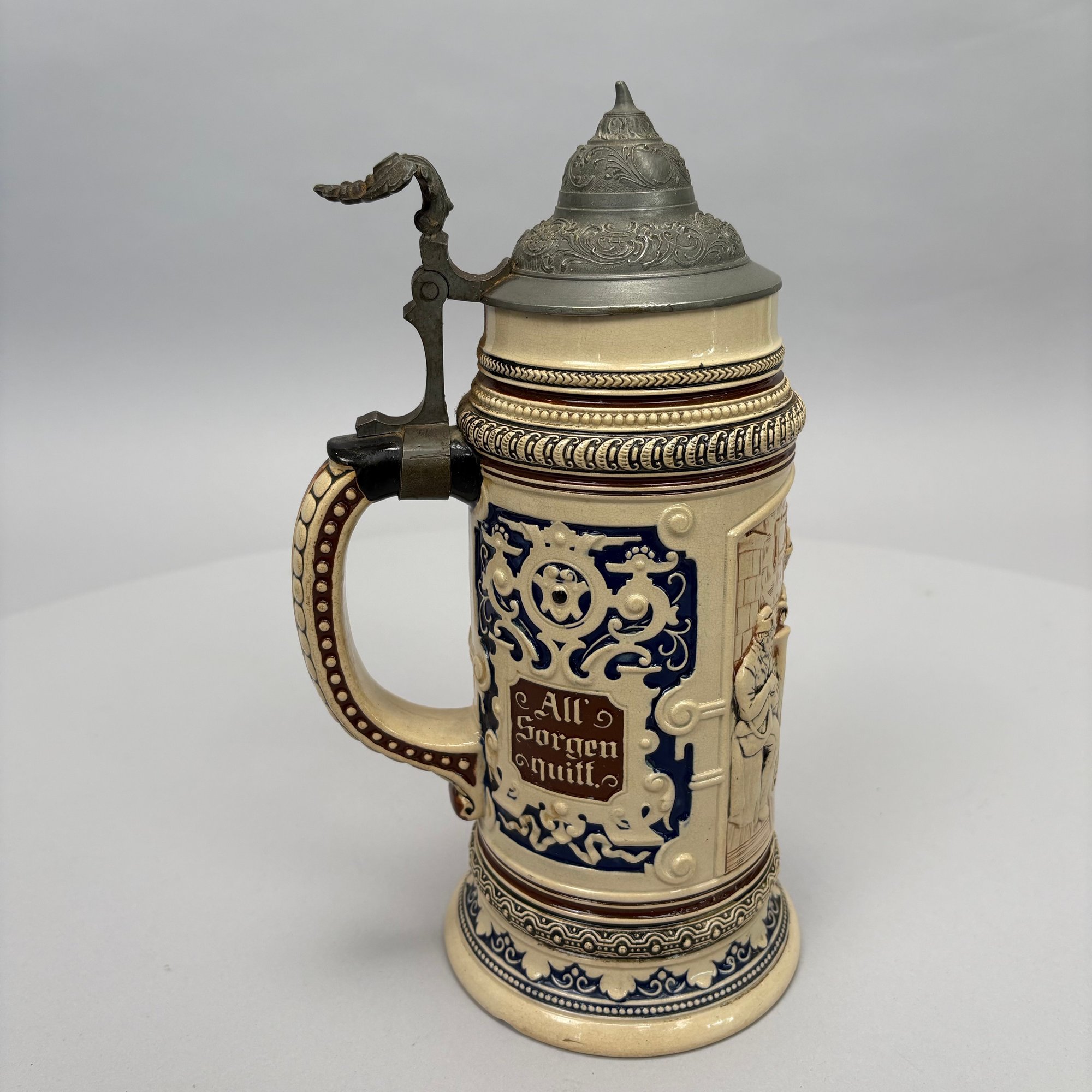 Four German Saltglaze Stoneware Steins with Pewter Lids and a Pitcher, Late 19th-20th Century. Including a pair of steins, Marzi & Remy, circa 1900, inscribed "In durstiger Mitt/ all Sorgen quitt" (In thirsty company all problems disappear).