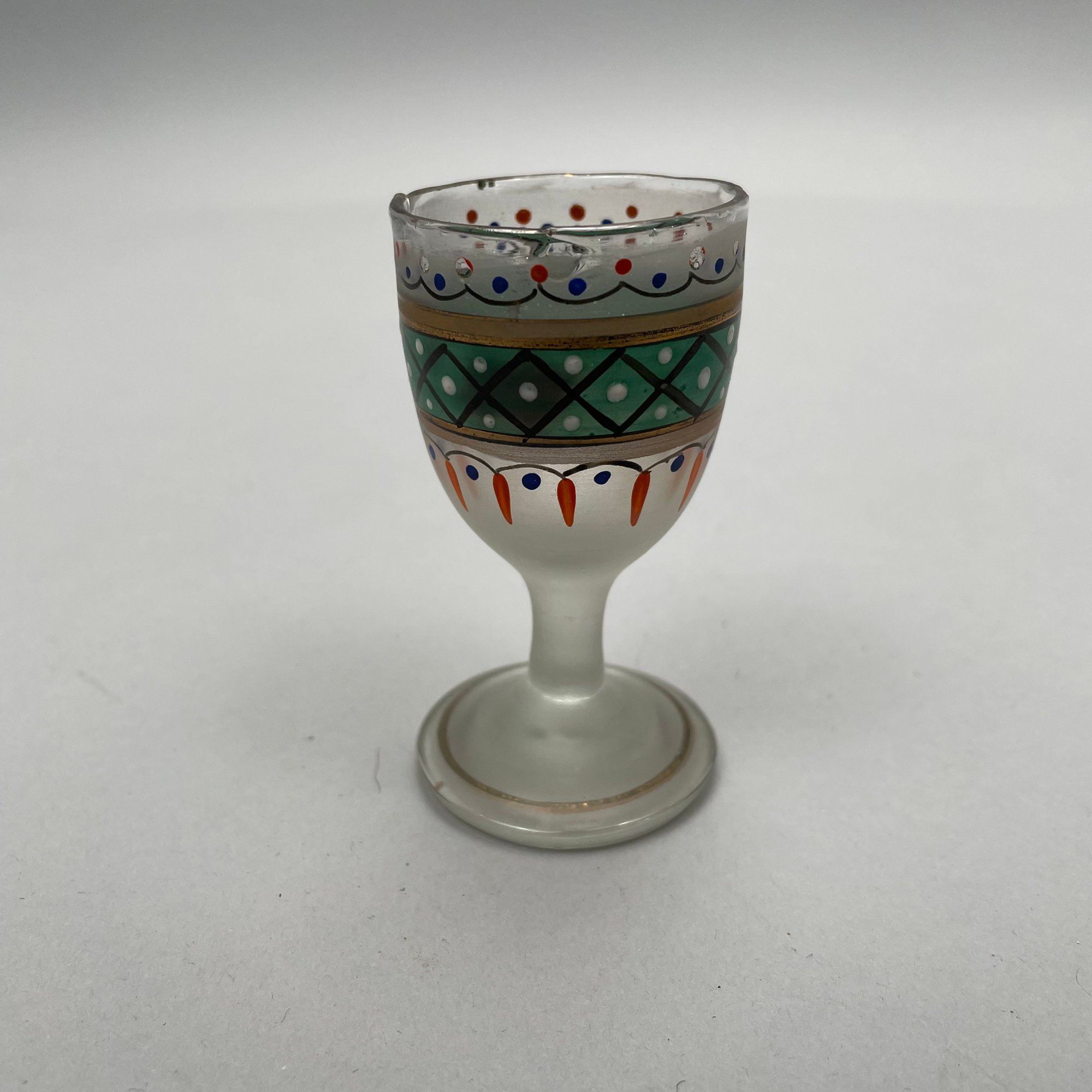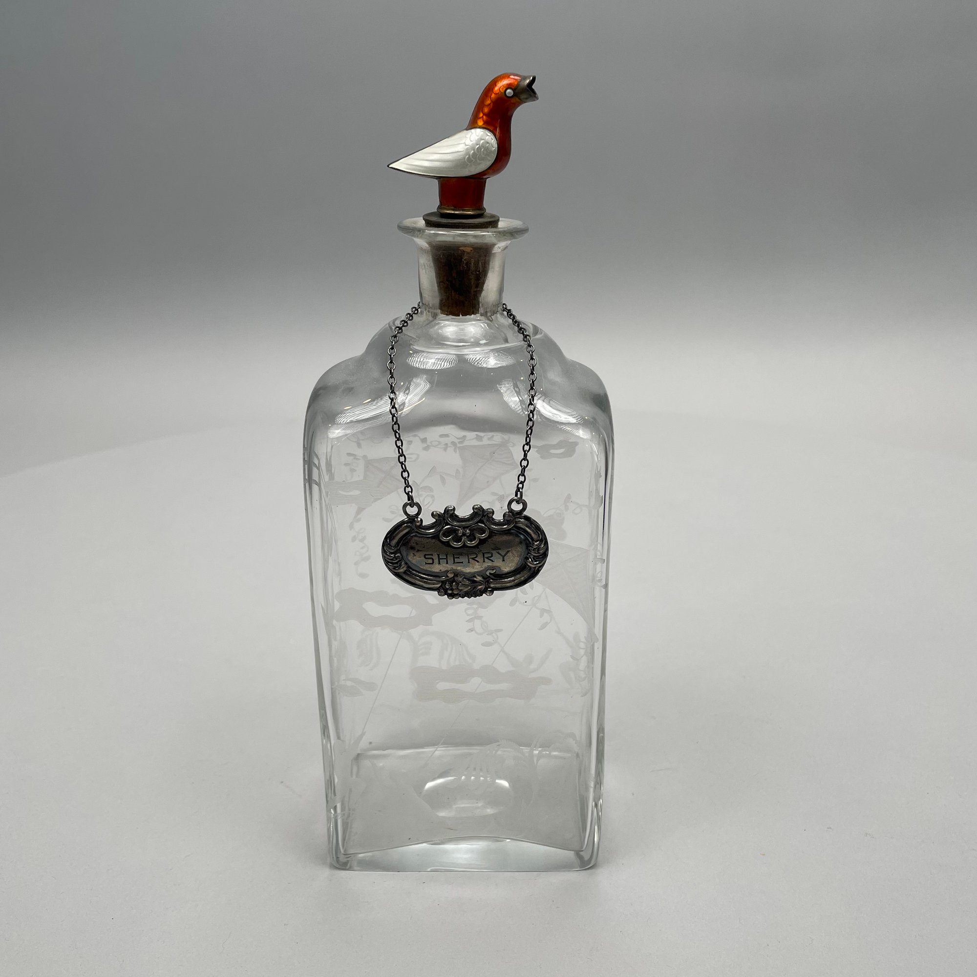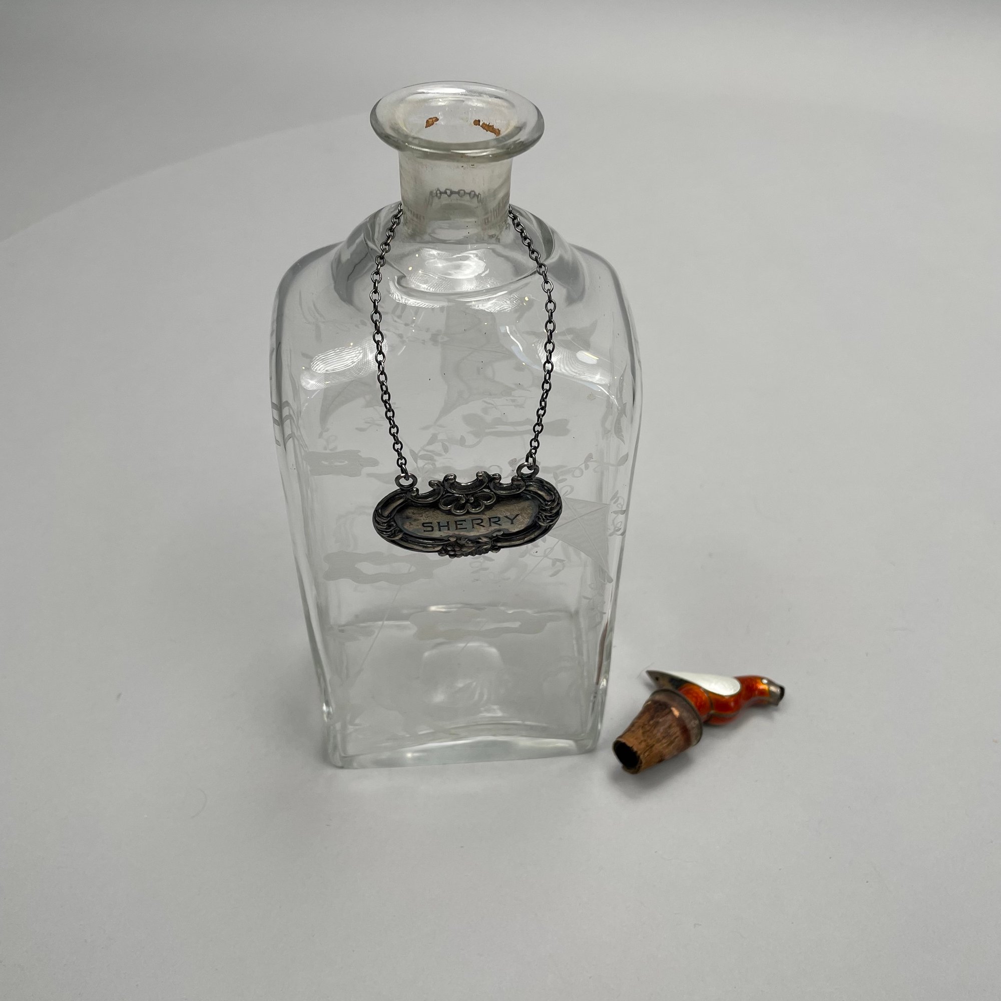 Four Glass Articles Pertaining to Drinking and a Ladle. Comprising an etched glass sherry decanter with "SHERRY" bottle tag and cloisonne bird stopper, an enamel-decorated sherry glass, a pair of cobalt blue glass wine rinsers, and a coconut ladle with wood handle.