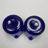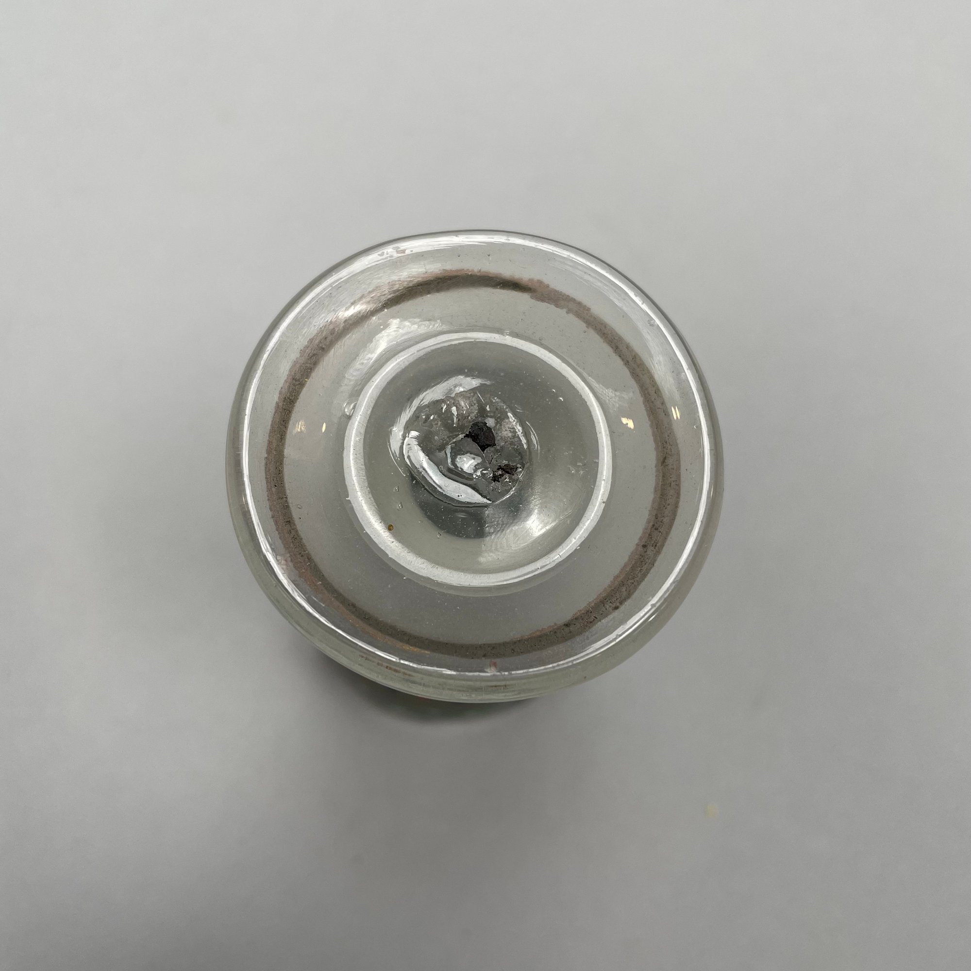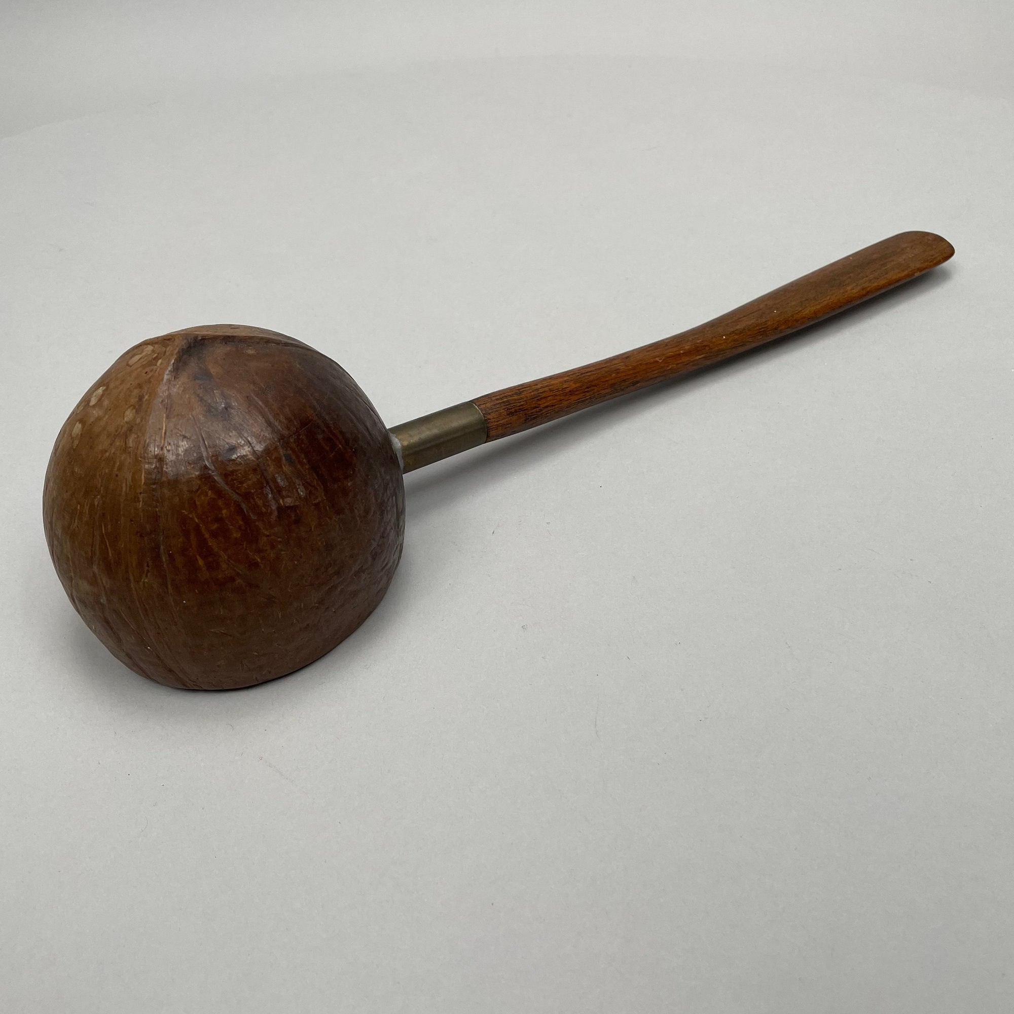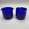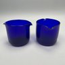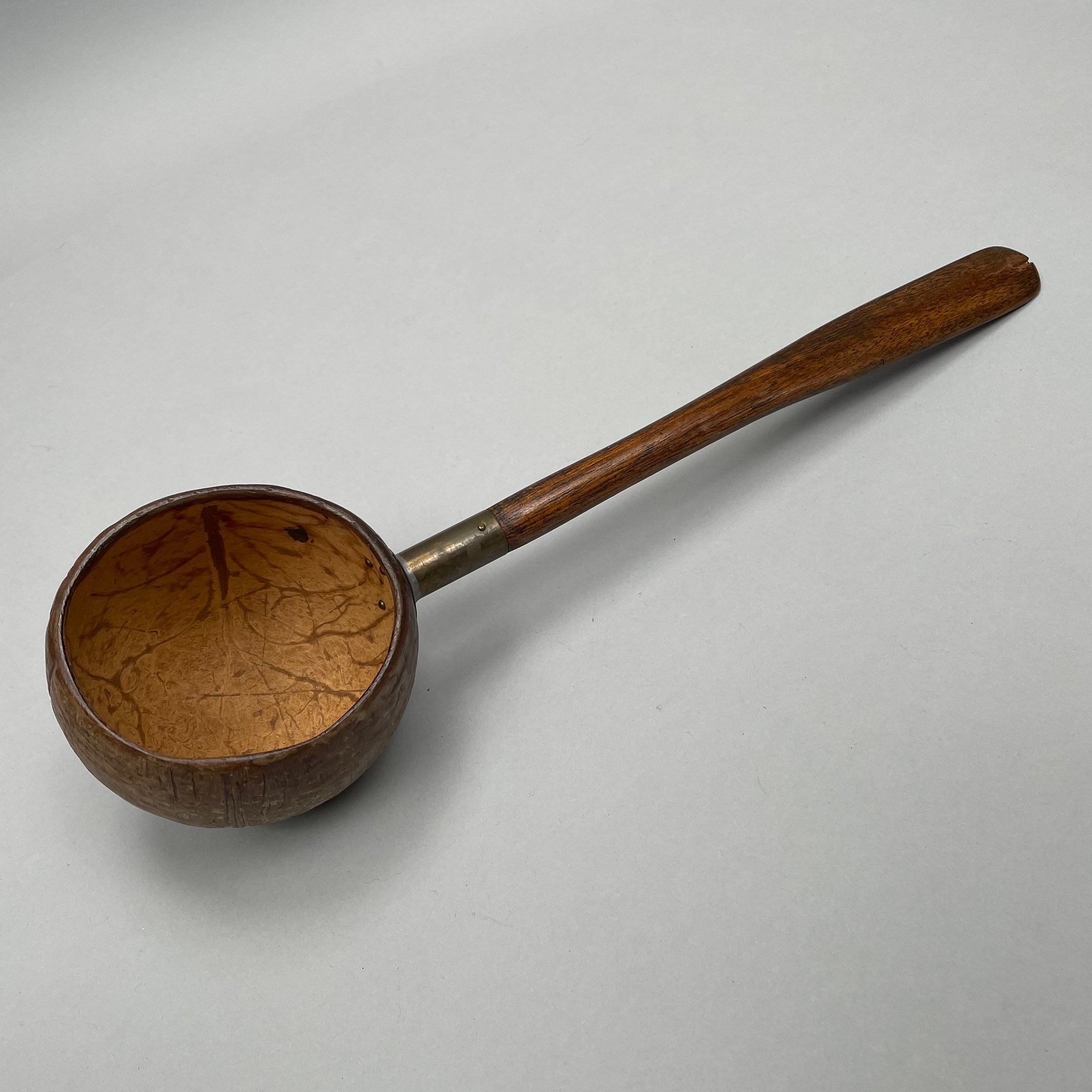 Four Glass Articles Pertaining to Drinking and a Ladle. Comprising an etched glass sherry decanter with "SHERRY" bottle tag and cloisonne bird stopper, an enamel-decorated sherry glass, a pair of cobalt blue glass wine rinsers, and a coconut ladle with wood handle.