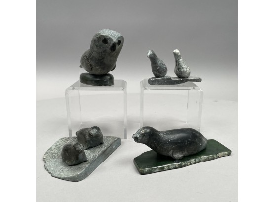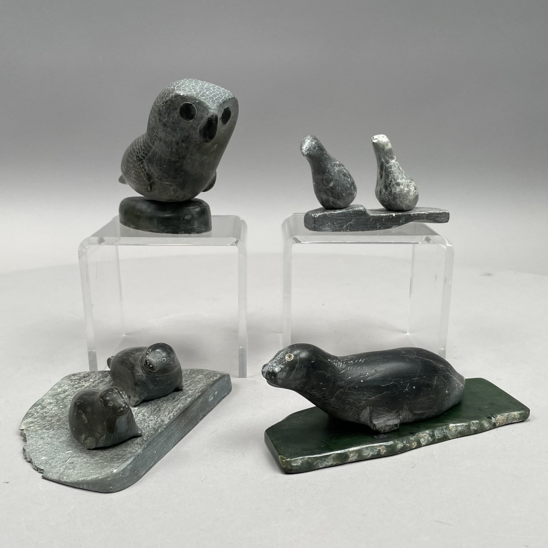 Comprising an owl, signed under the base "EEJiseak/ E7-91;"a seal, signed "IOLAT/ E-7/11, with malachite base; a pair of seal pups, signed indistinctly; and a pair of seagulls, signed "E7-1133/ E-r-4."