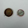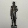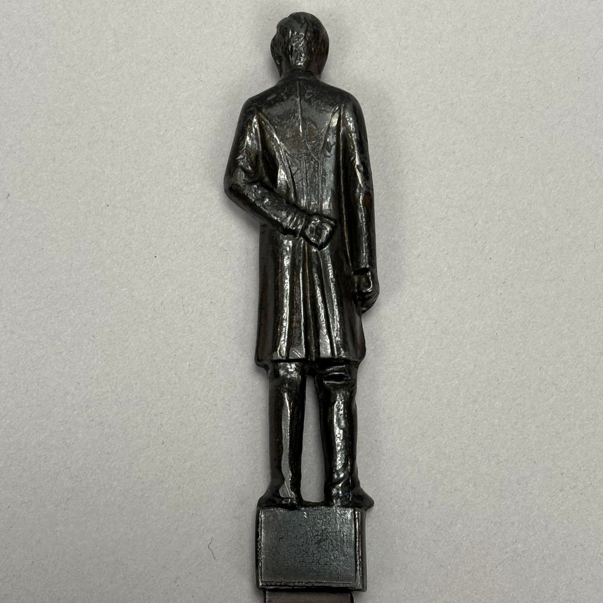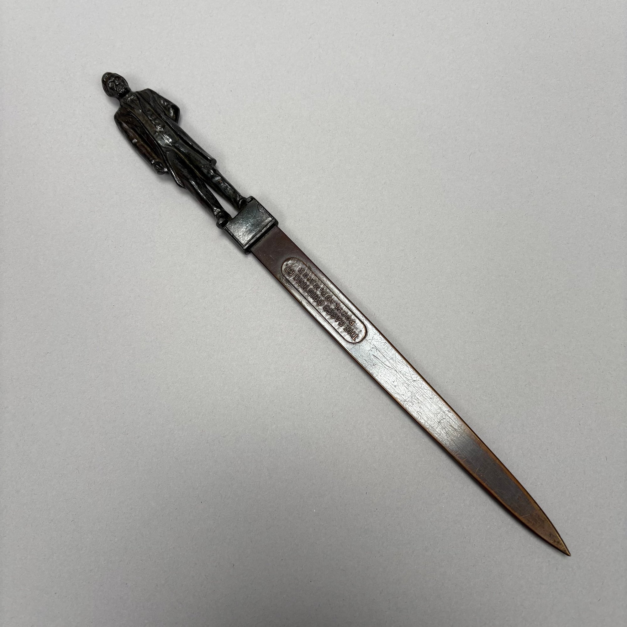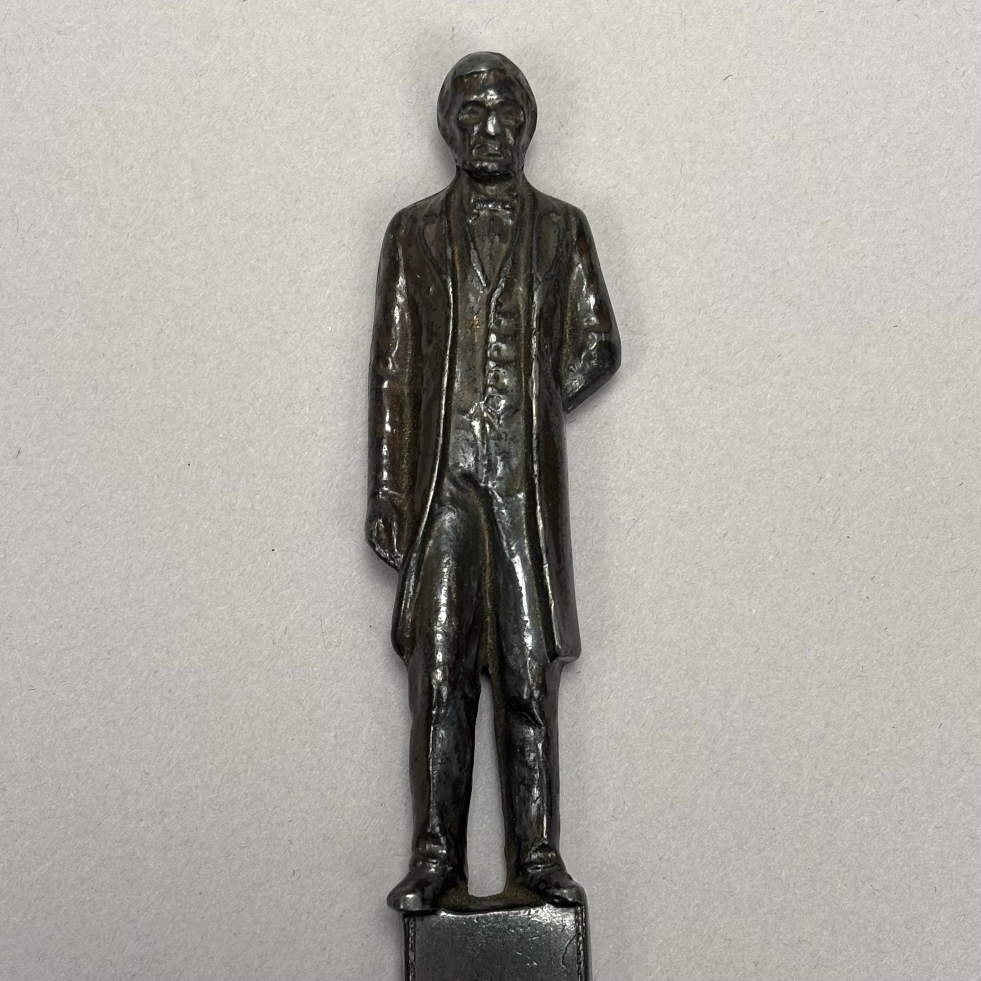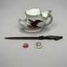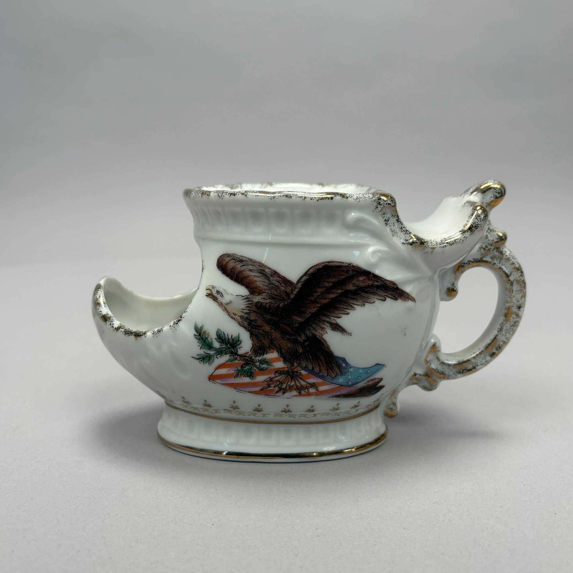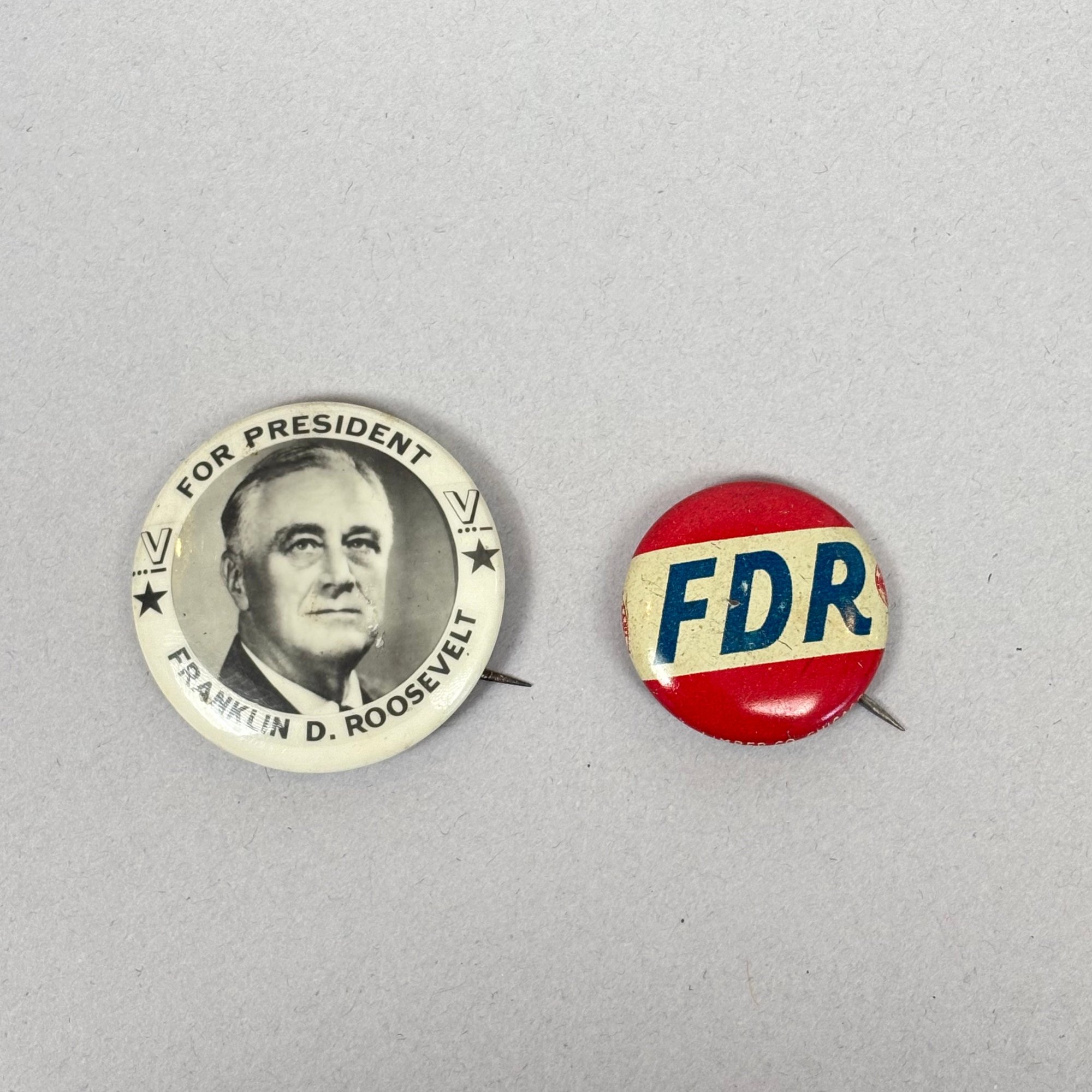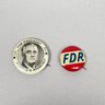 Four Items Pertainng to Americana and Presidents, Late 19th-20th Century. Comprising a Brandenburg porcelain shaving mug in the form of a coal scuttle, printed on one side with the American eagle, laurel branches, arrows and shield, and on the other with violets; an Abraham Lincoln patinated-metal letter opener, "THE CASCO PRINTING CO./ PORTLAND, MAINE;" and two Franklin Delano Roosevelt campaign buttons.
