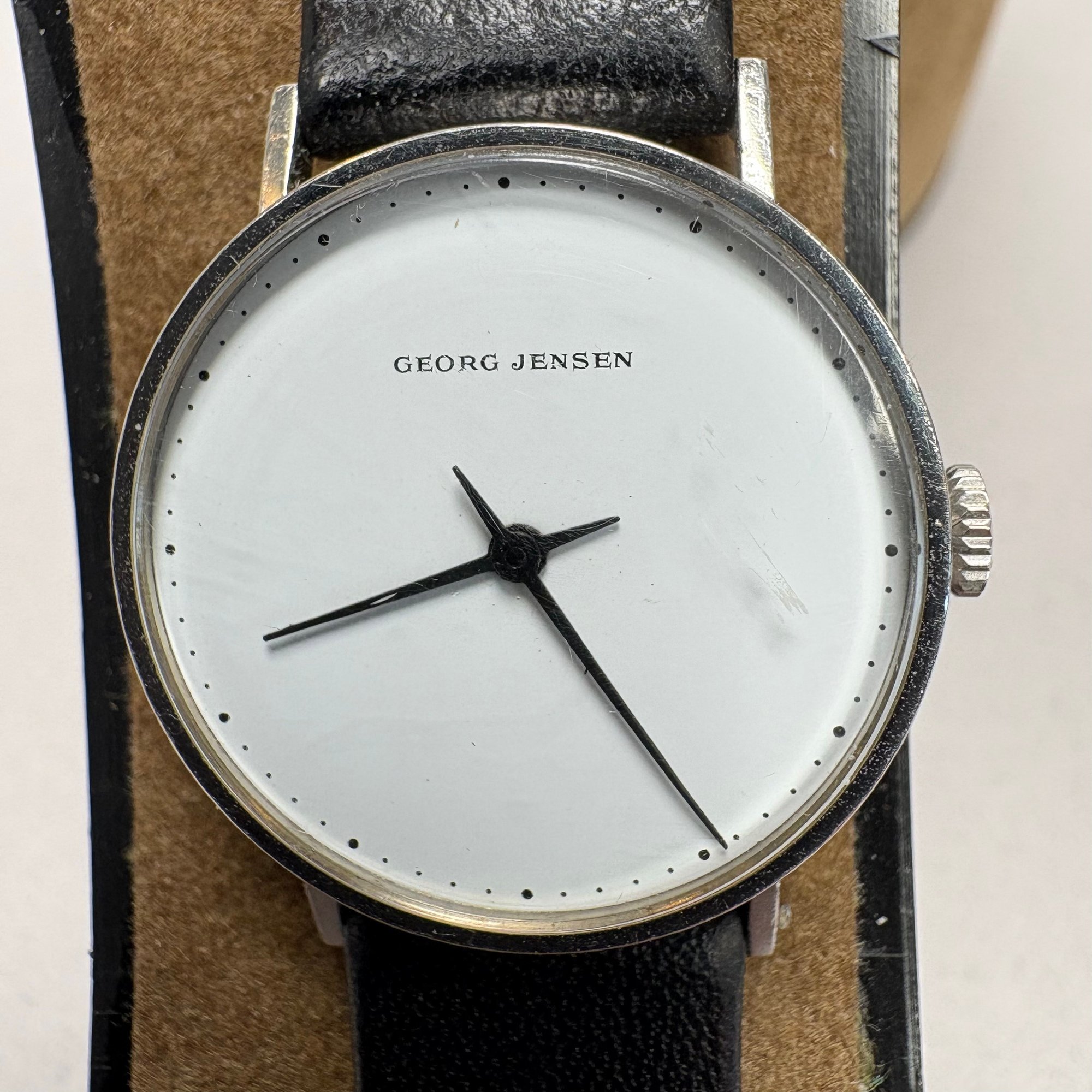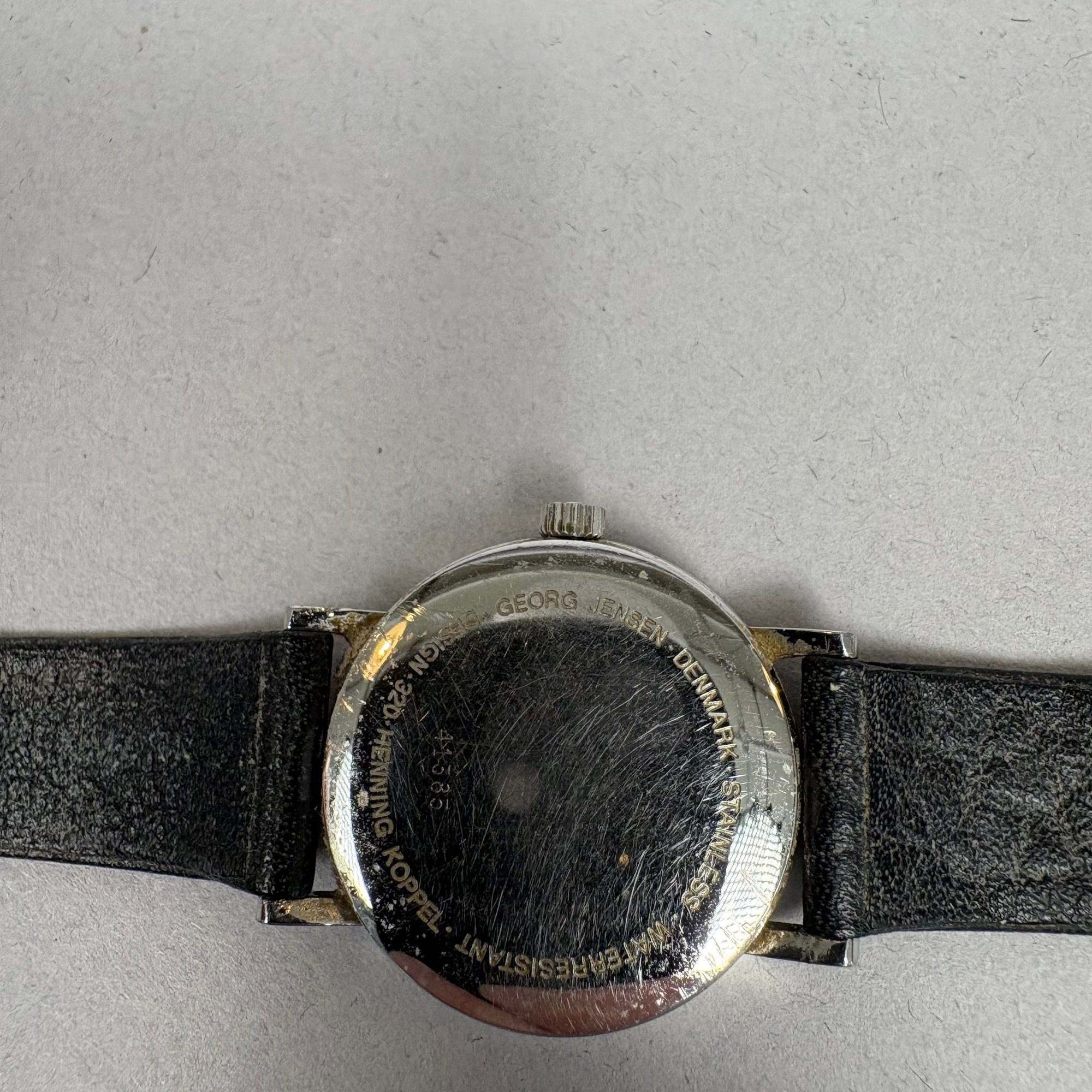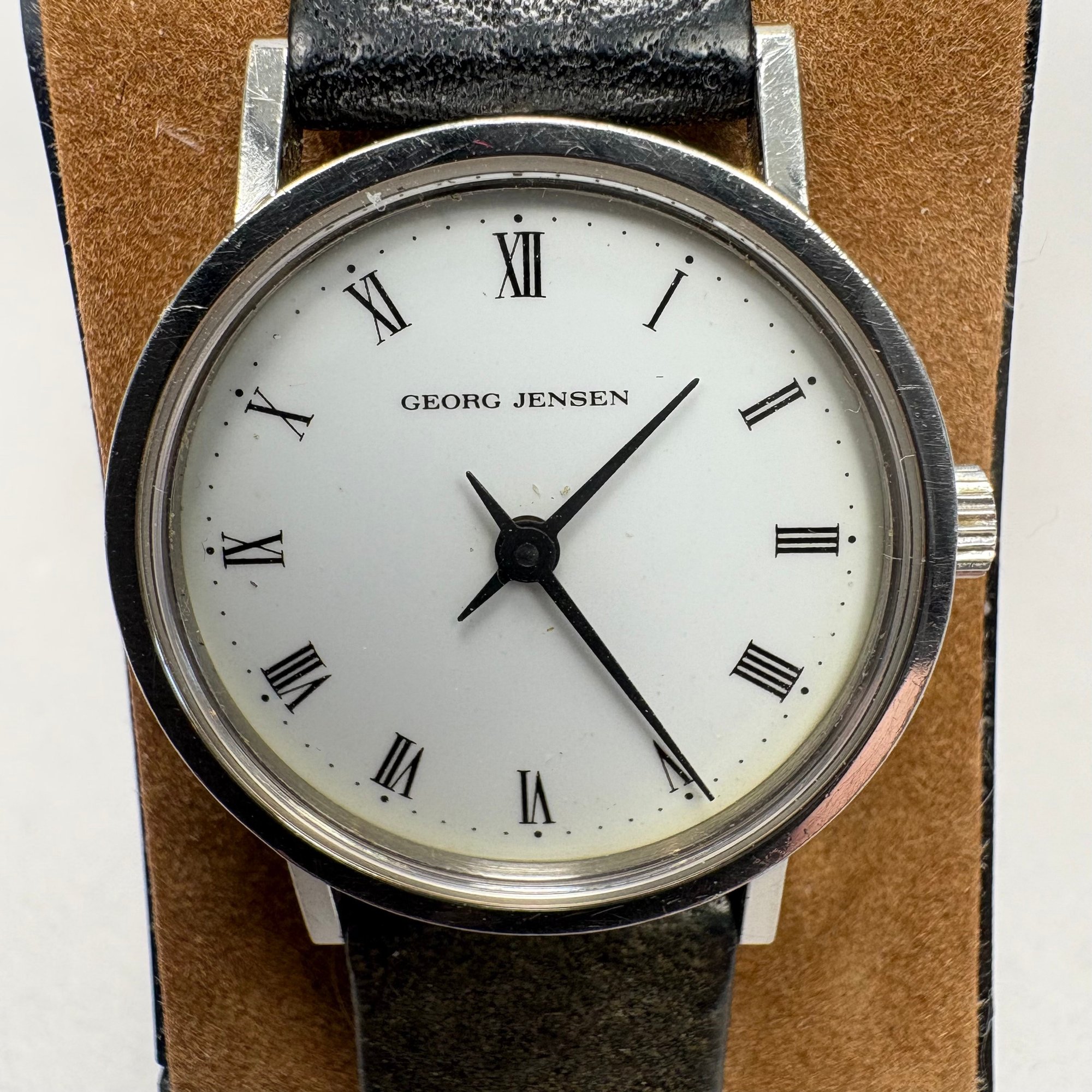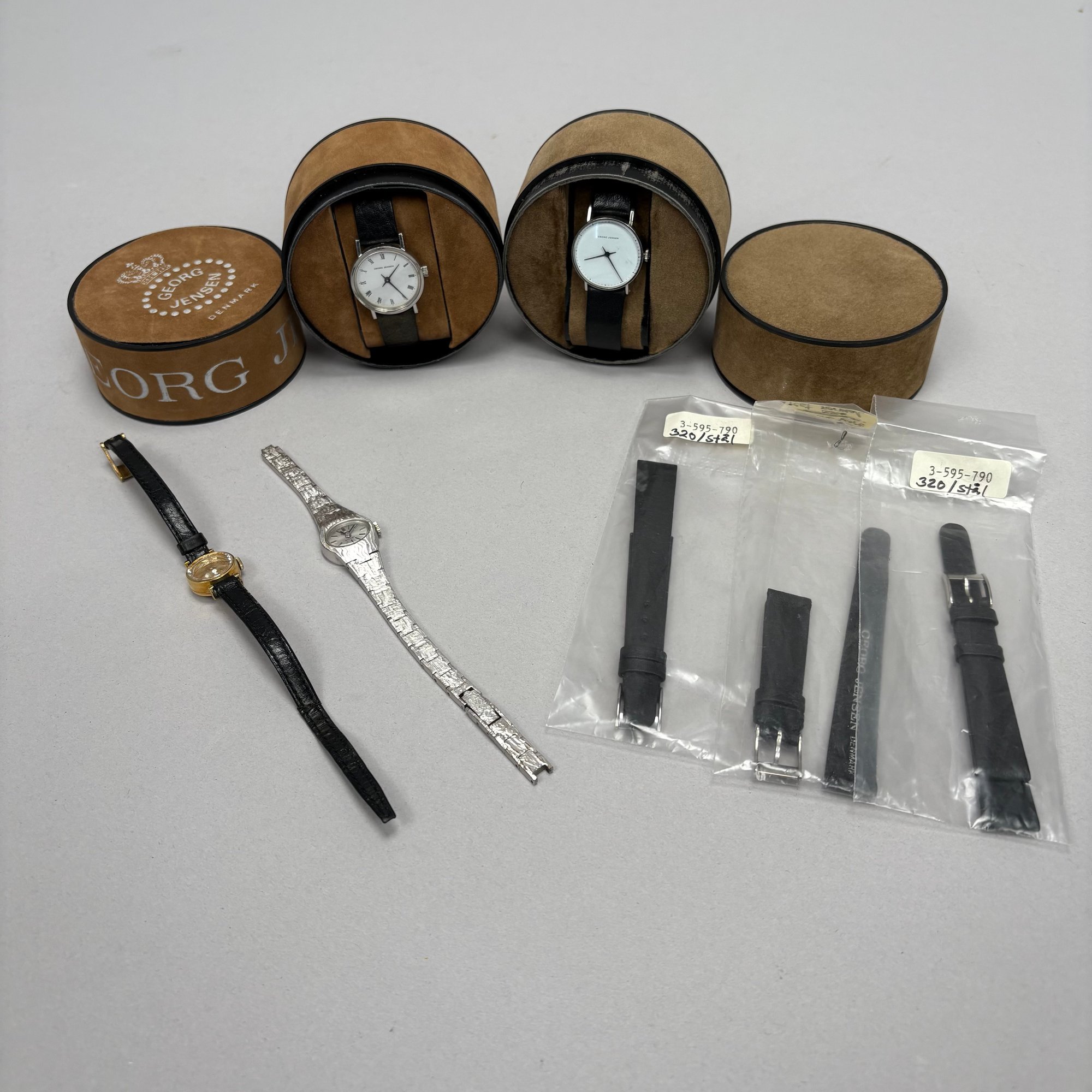Four Ladies Wrist Watches. Comprising two Georg Jensen wrist watches and three extra bands, each watch housed in a velvet circular box, one marked "GEORG JENSEN DENMARK;" a watch marked "Girard Perregaux;" and a watch marked "TISSOT/ STYLIST/ SWISS MADE," with fitted box.