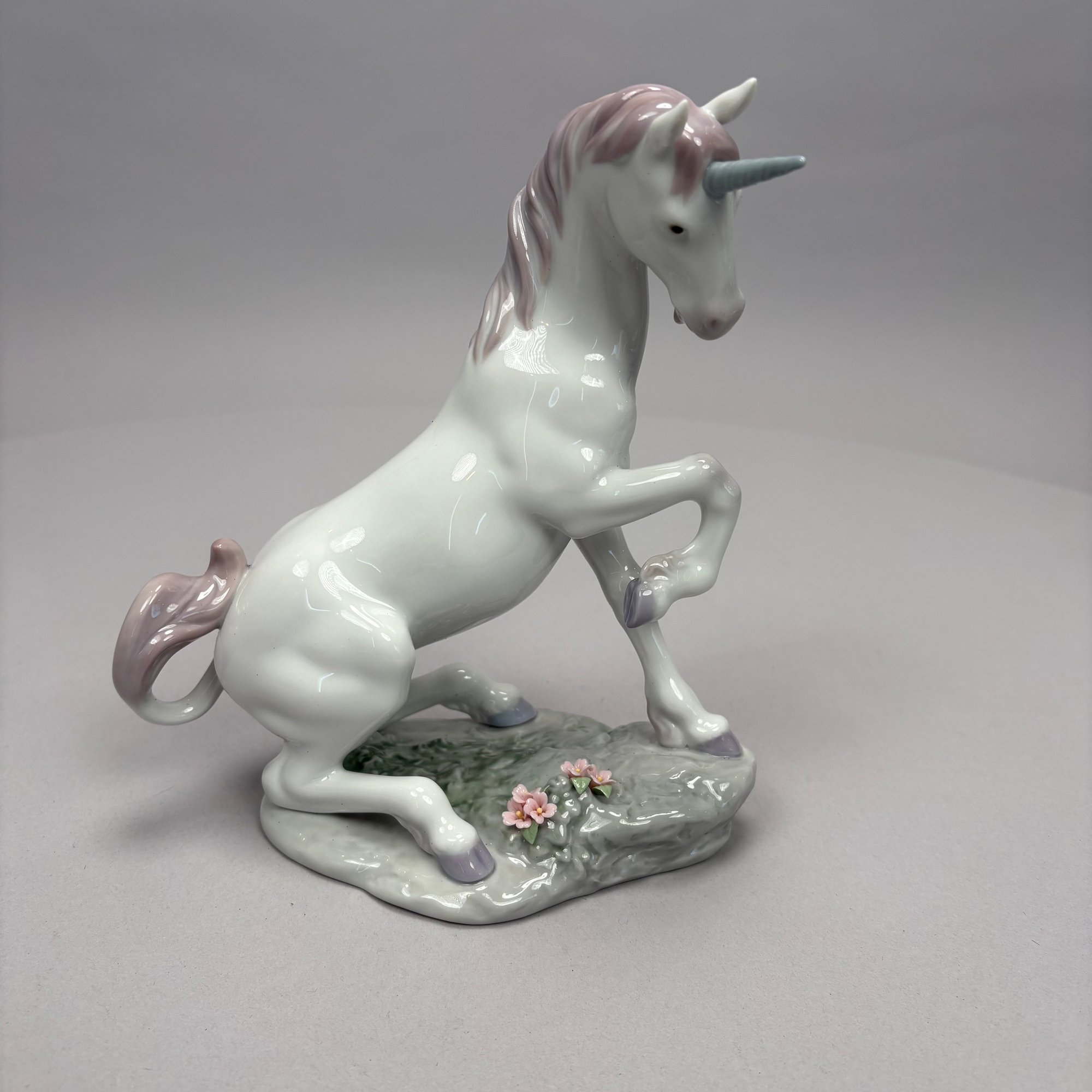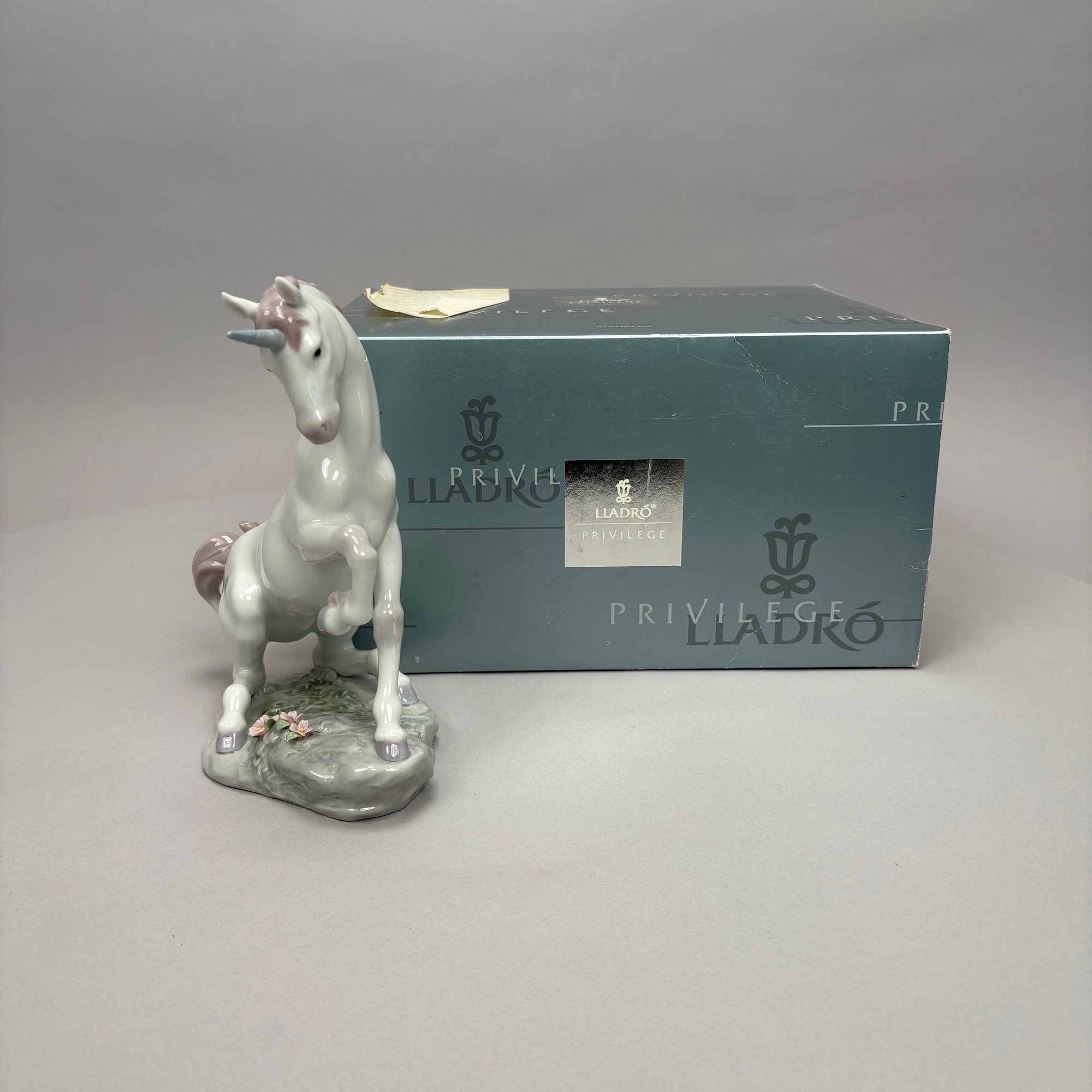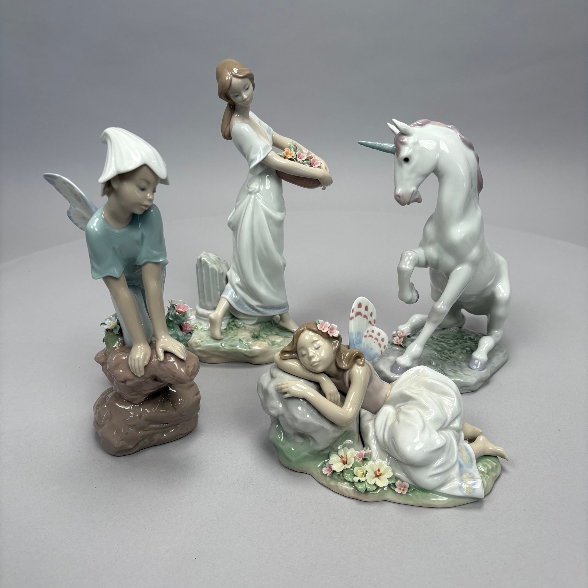 Comprising a Lladro Privilege #01007697 "Magical Unicorn" figure, a #01007704 "Gardens of Athens" figure, a #7690 "Prince of the Elves" figure, and a #010.07694 "Princess of the Fairies" figure; each housed in the original box.