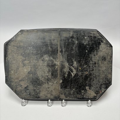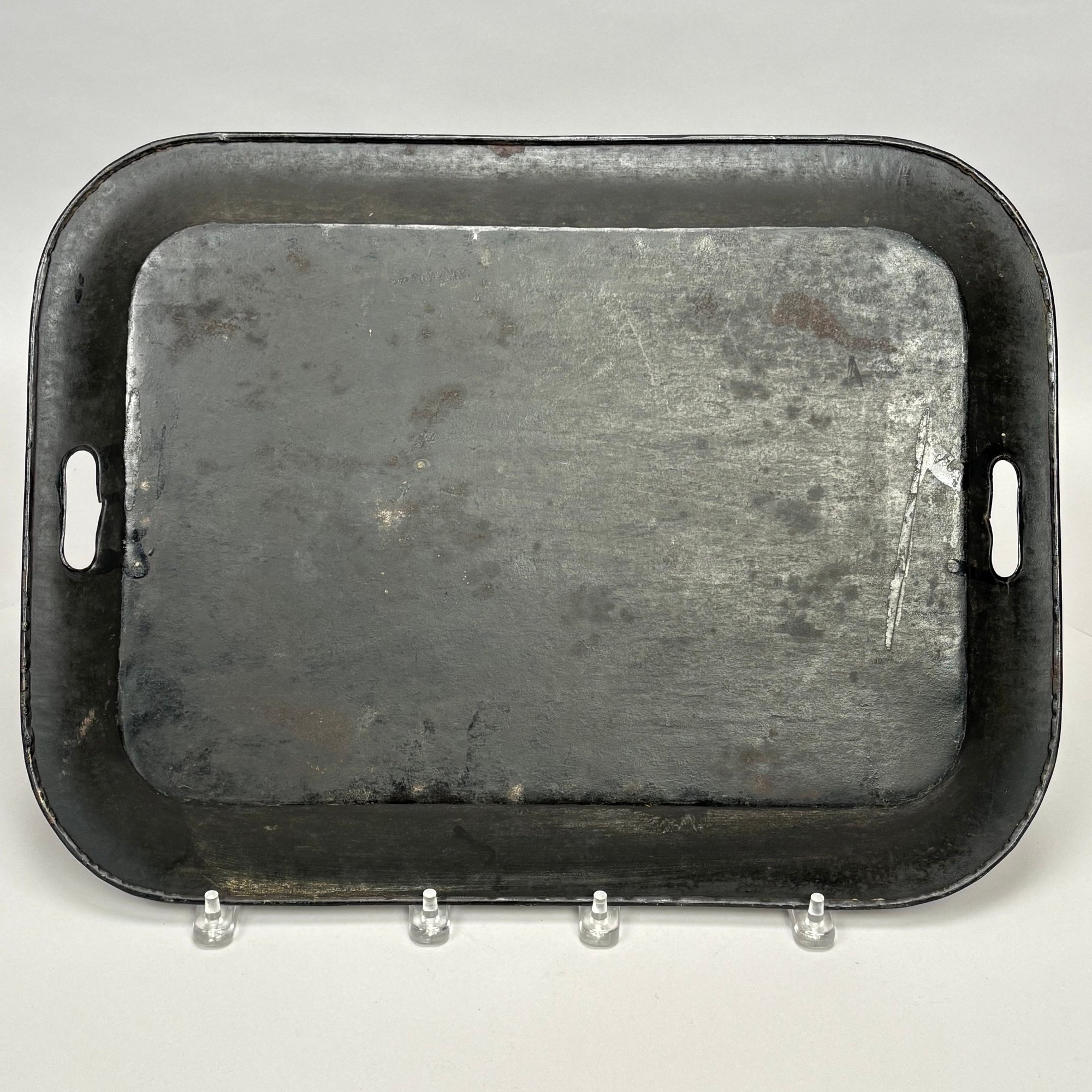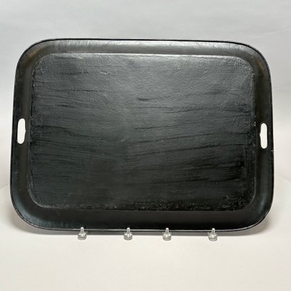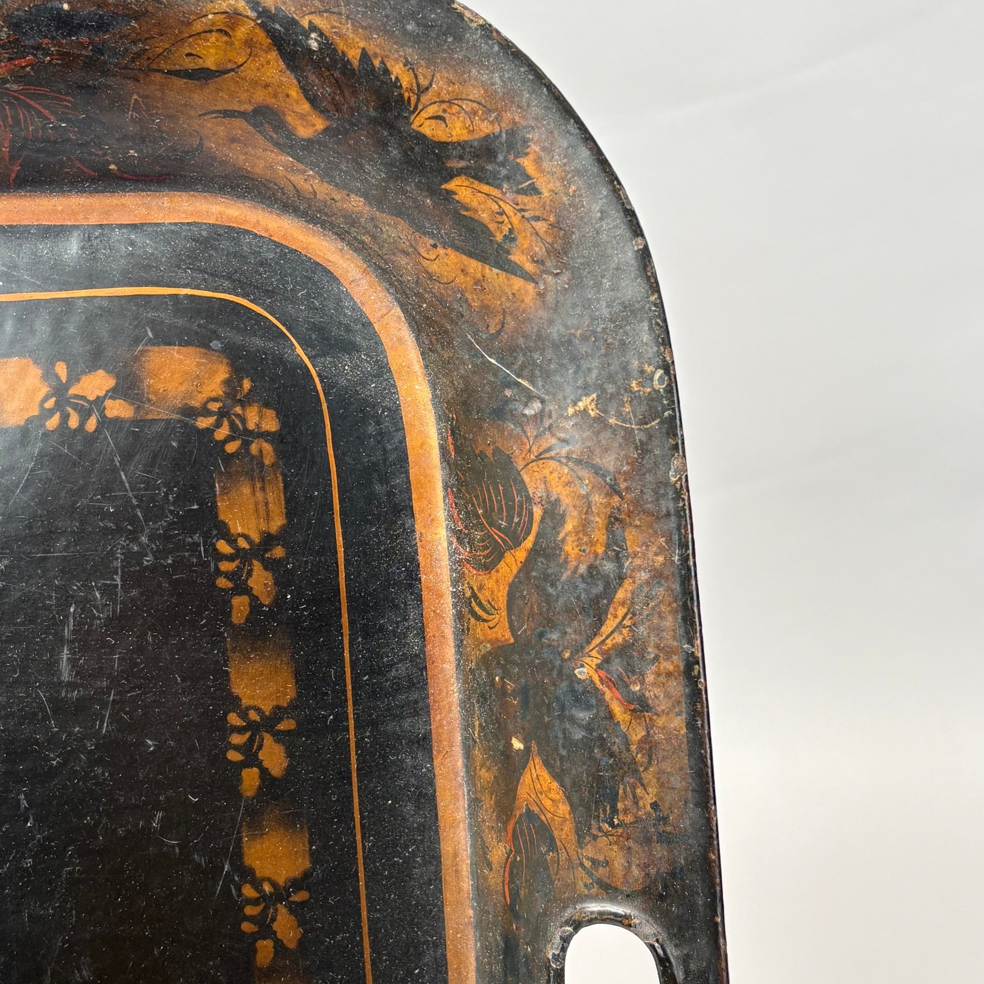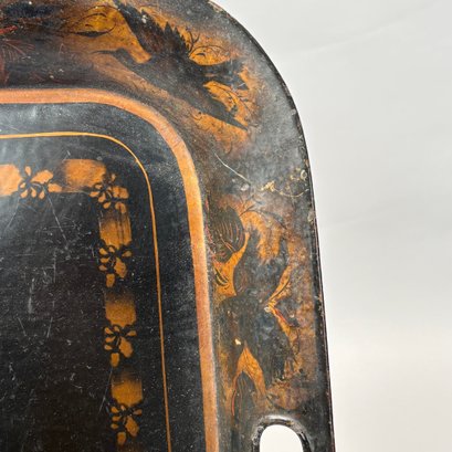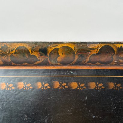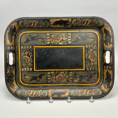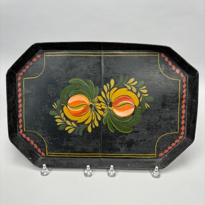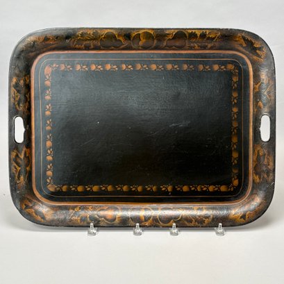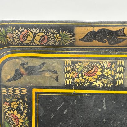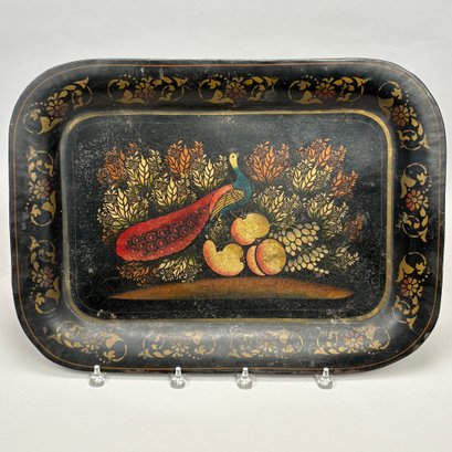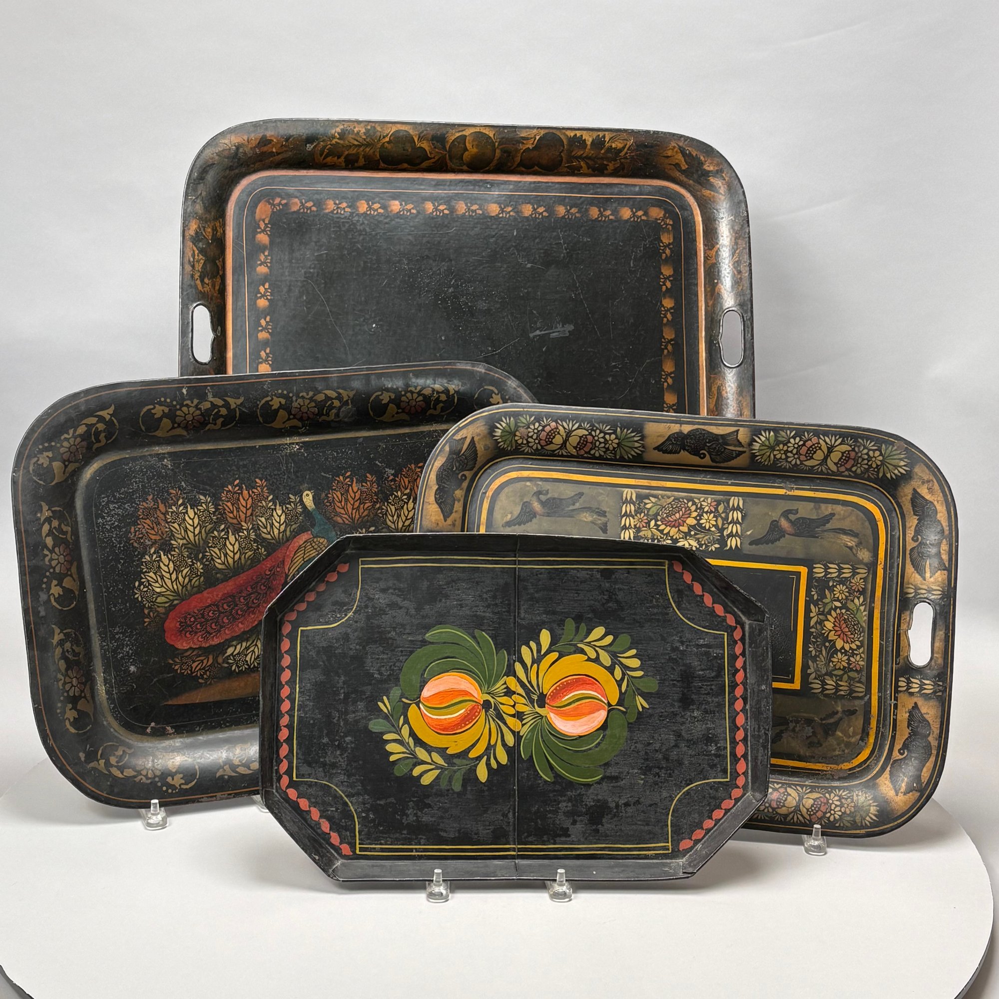 Four Painted and Stencilled Tin Trays, Late 19th-20th Century. Variously painted and stencilled with flowers, fruit, leaves and peacocks.