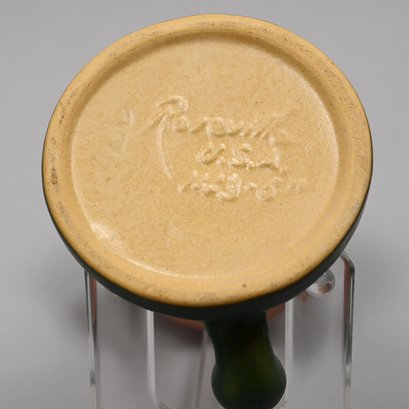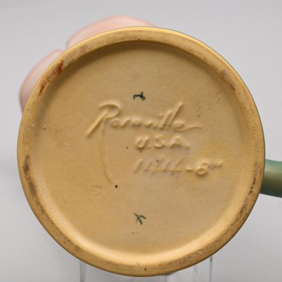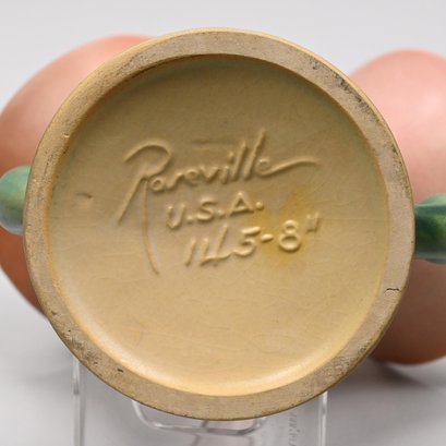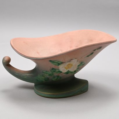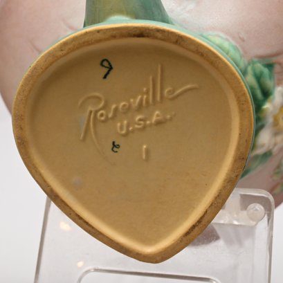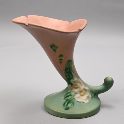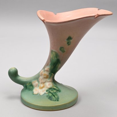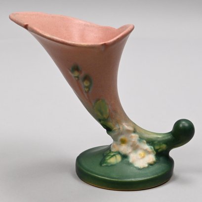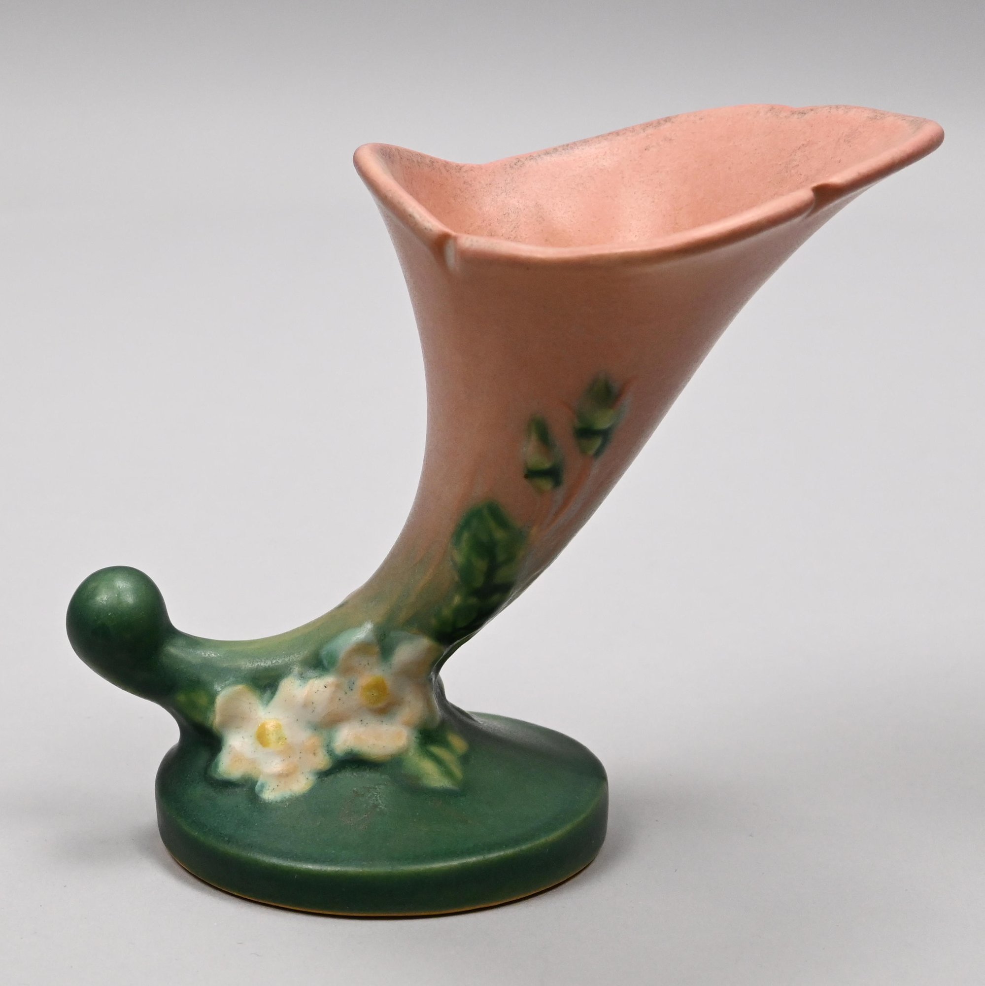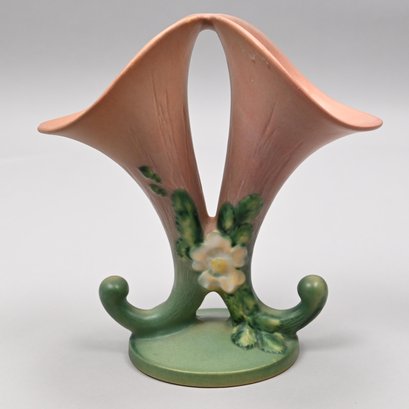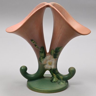 Four Roseville Pottery 'White Rose' Vases, Zanesville, Ohio, Introduced in 1940. In Roseville's 'Coral' glaze, comprising a #1 cornucopia vase with attached flower frog, a #143-6 vase, a #144-8 vase and a #145-8 double vase, each marked "Roseville/ U.S.A." with the above listed shape numbers in raised letters.