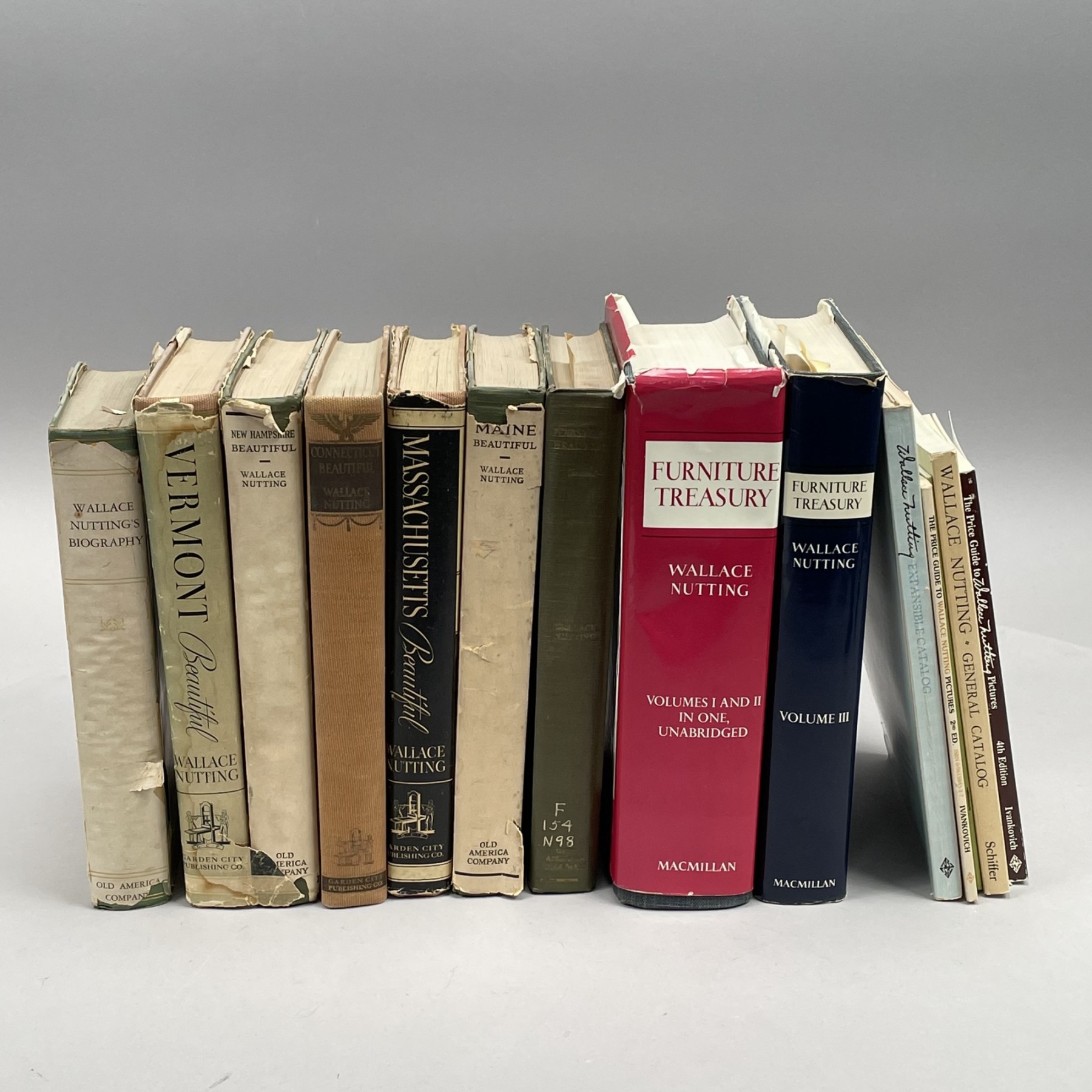 Comprising "Wallace Nutting's Biography." Framingham, MA: Old America Company, 1936; "Vermont Beautiful," "New Hampshire Beautiful," "Connecticut Beautiful," "Massachusetts Beautiful," "Maine Beautiful," "Pennsylvania Beautiful," "Furniture Treasury," Vols. I and II, and Vol. III; and five catalogs including "The Wallace Nutting Expansible Catalog."
