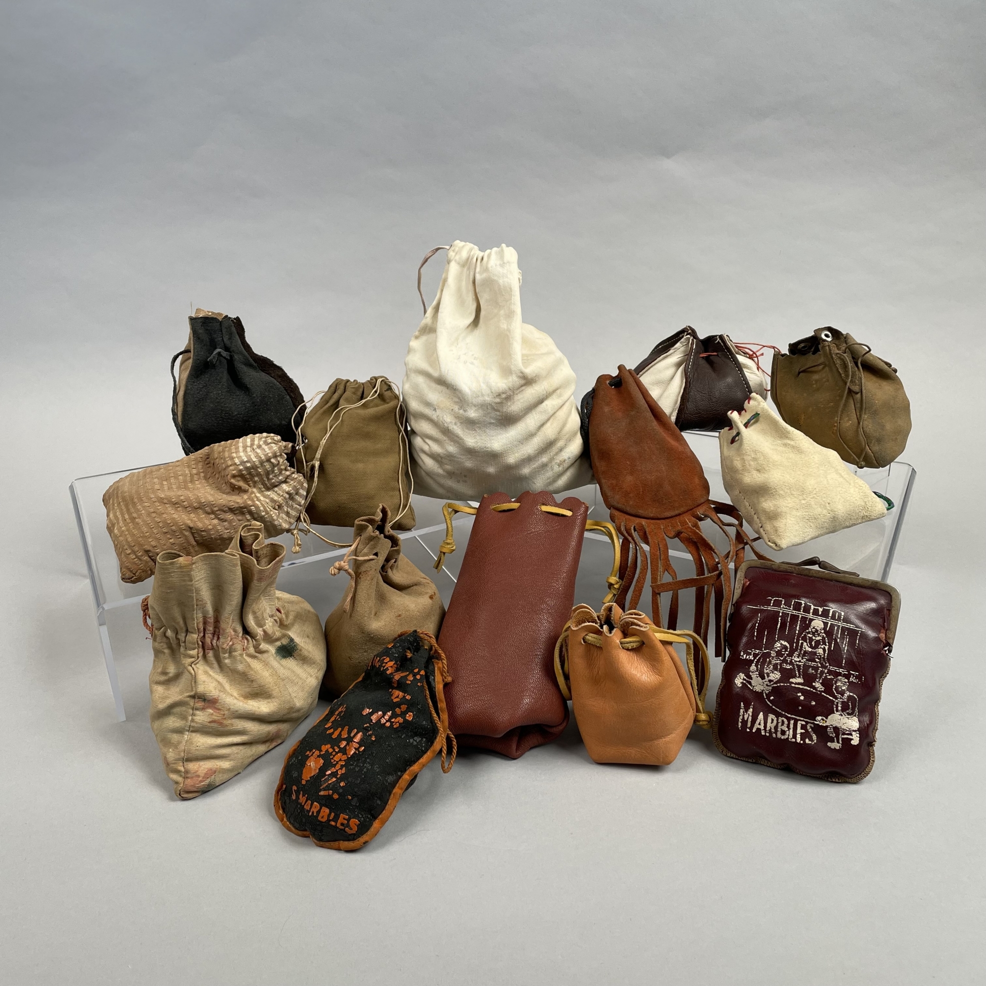 Including a "GLASS MARBLES" cloth bag, and a Naugahyde "MARBLES" purse printed in white with a view of three children shooting marbles.