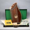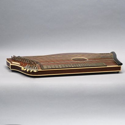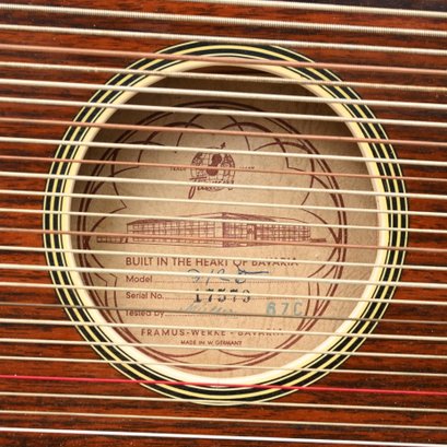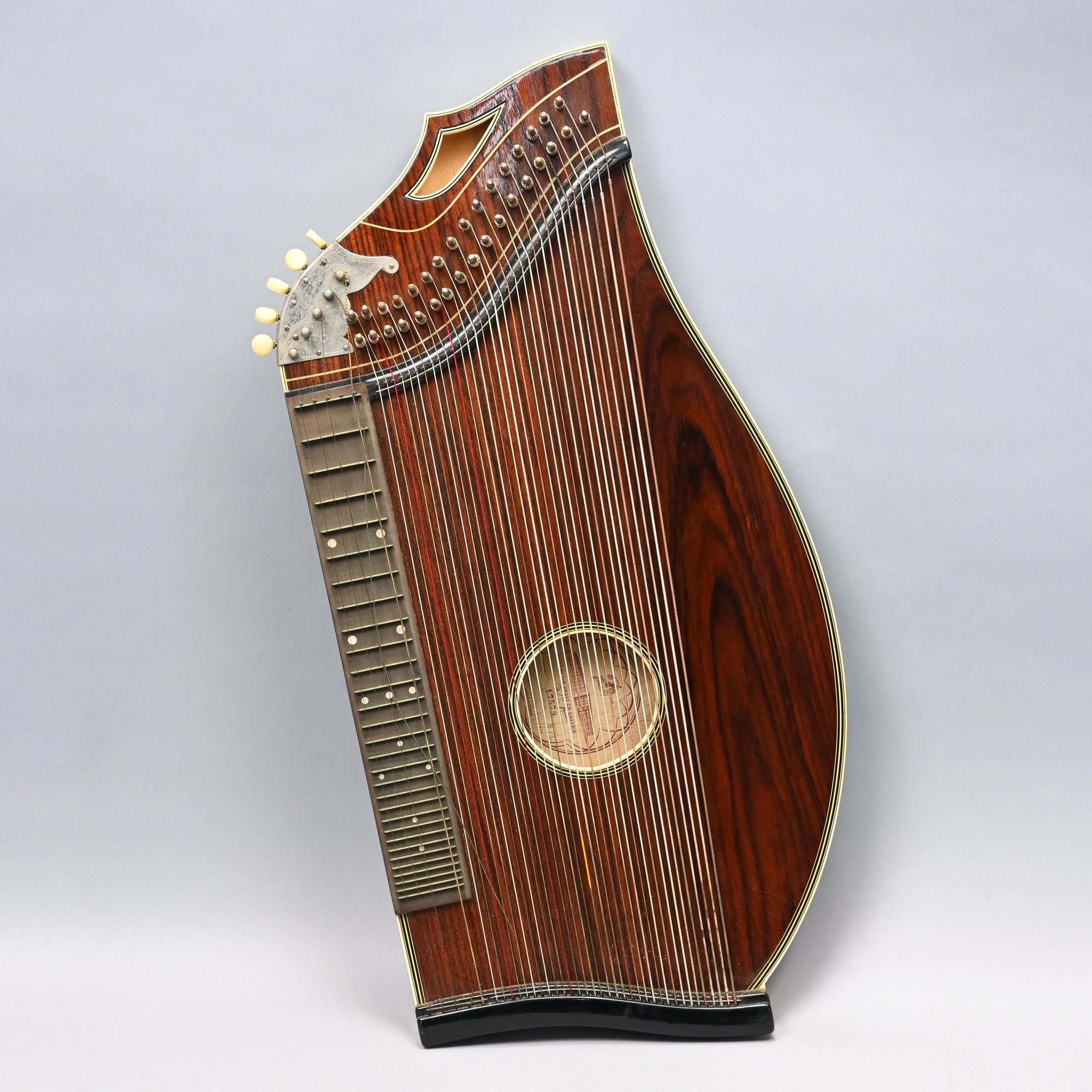 Framus Rosewood Model 7/20 Aerial-Resonance 38-String Zither, Germany, 1967. Affixed with a plate on the interior printed and handwritten "Serial No 17579, Tested by (Richard) "Muller, and 67C," together with four Bell Brand Concert Zither strings B, C, C# and G#, a Goldfuchs G string, five Lyric steel strings A, B, D, E and F#, and a Singvogel D string, one tuning wrench, two diagrams of a Zither with 35 strings, and three instruction books; housed in a hard-sided instrument case.