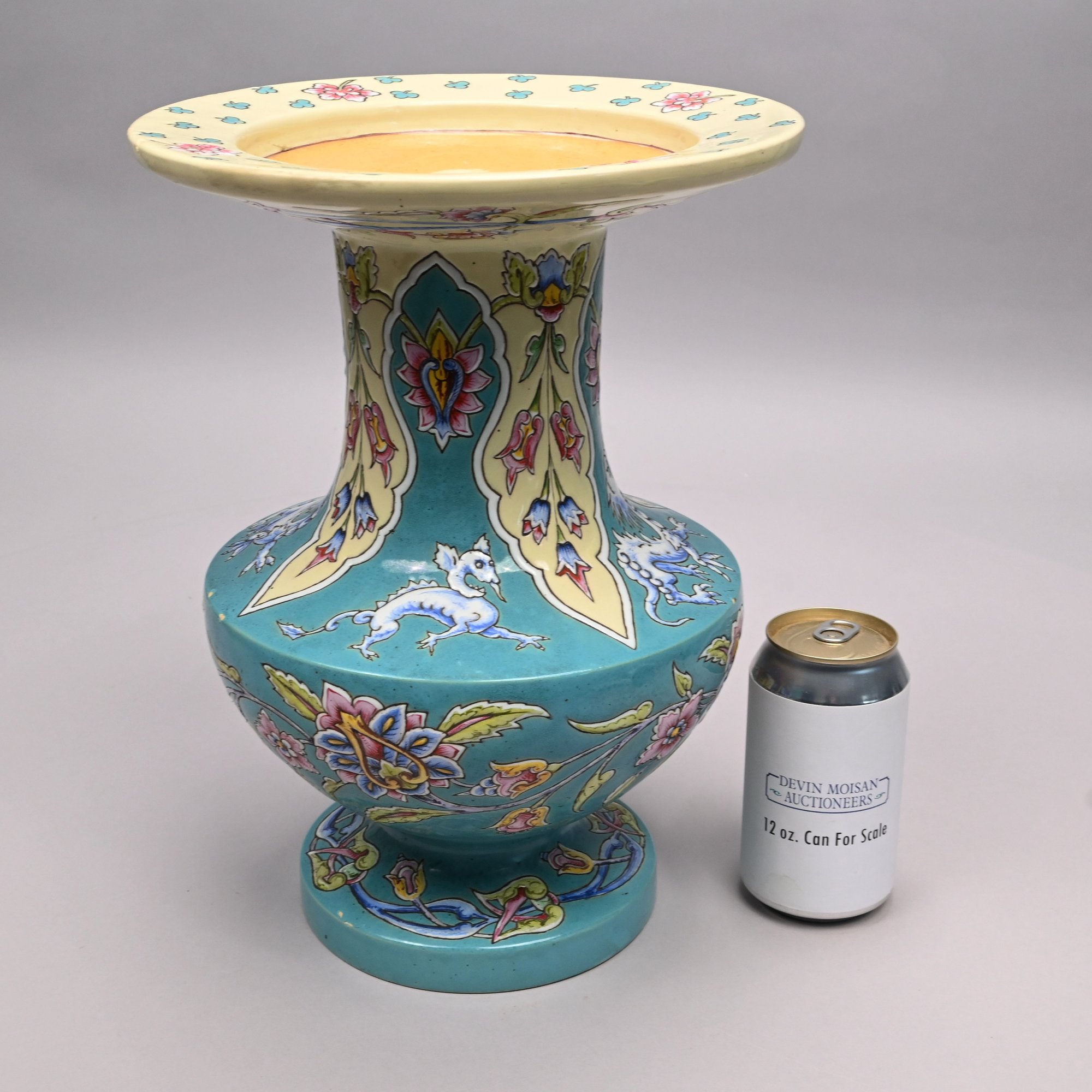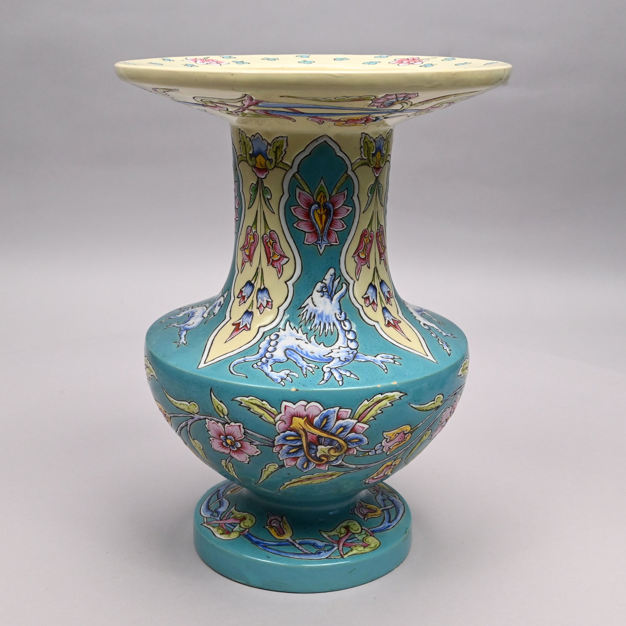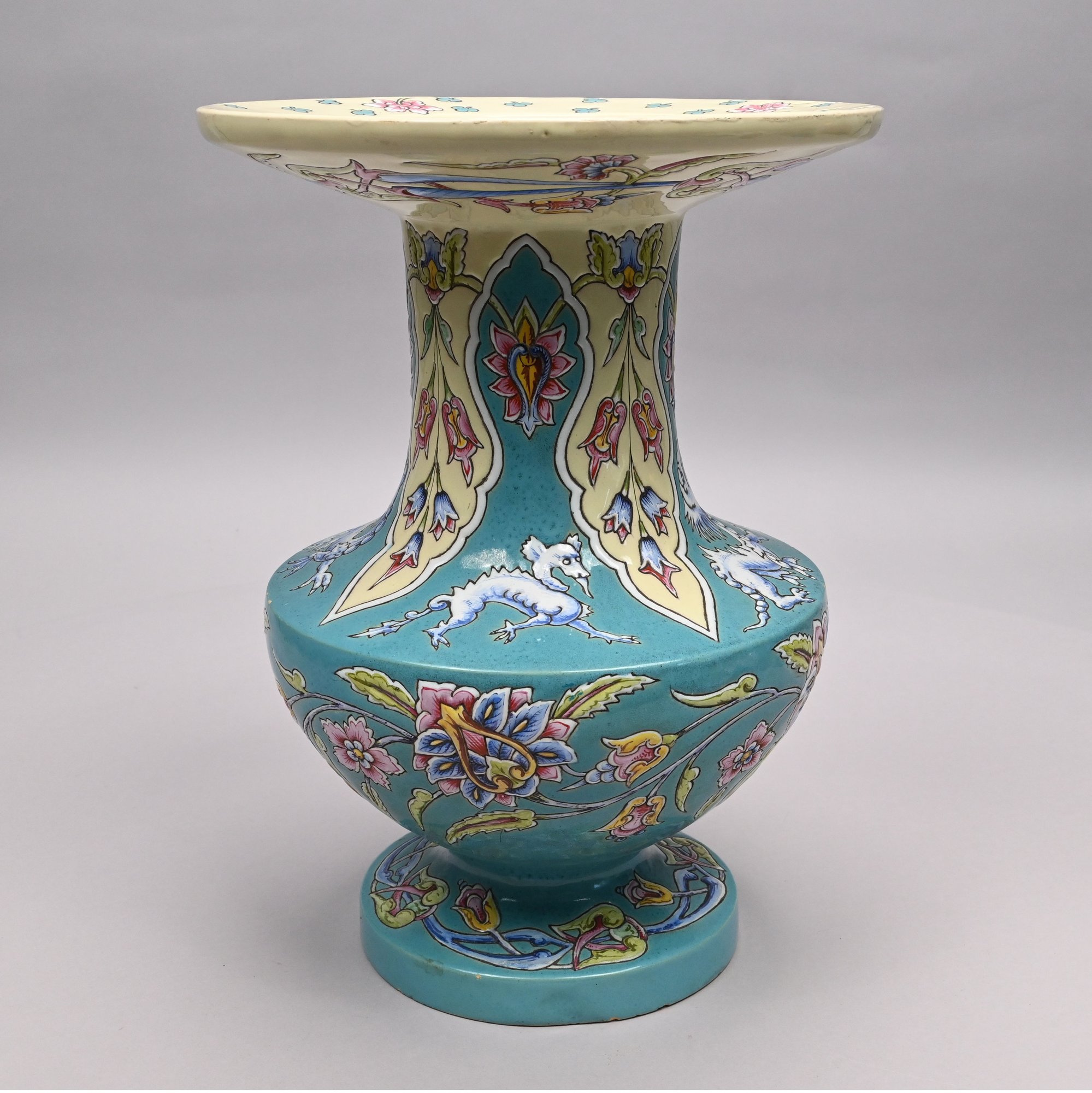 French Enamelled Faience Vase, Attributed to Eugene-Victor Collinot, Circa 1860s. Decorated in Persian style, the everted pale yellow rim enamelled with four flowers and scattered leaves, above the elongated neck reserved with pale yellow lappet panels, each enamelled with foliate devices suspending flower stems, reserved on the turquoise blue ground decorated with blossoms above grotesque creatures, all within wide bands of flowering vines, unmarked.