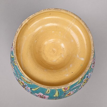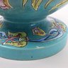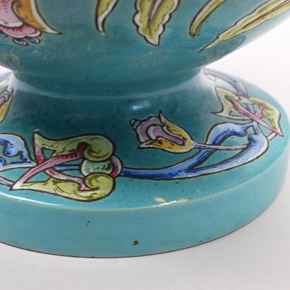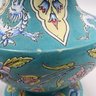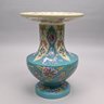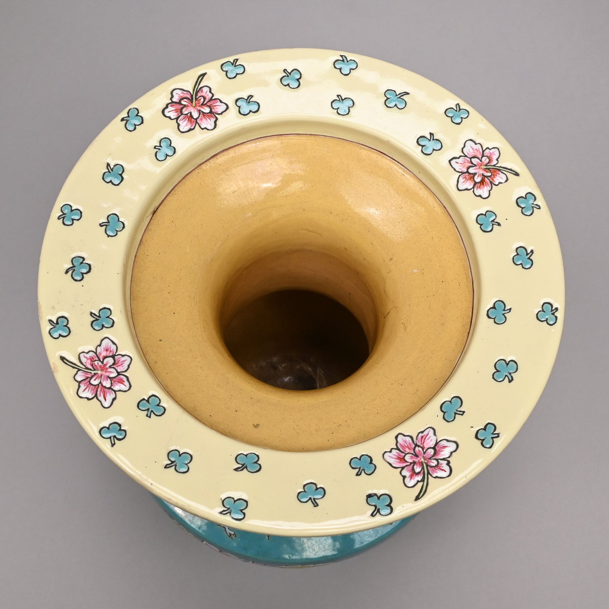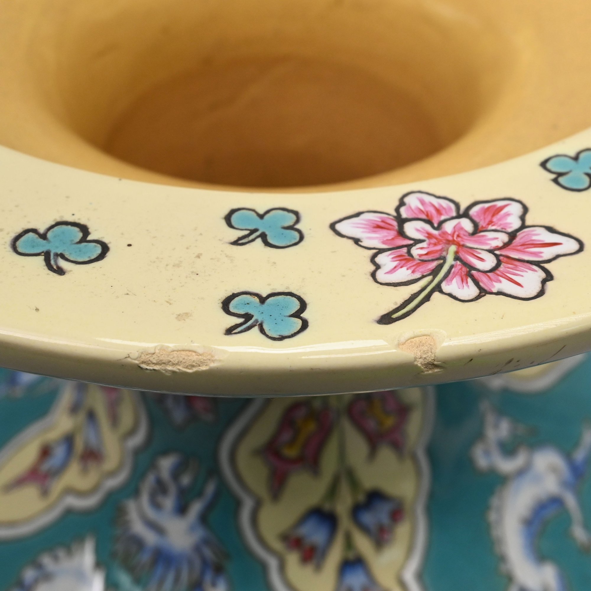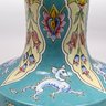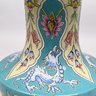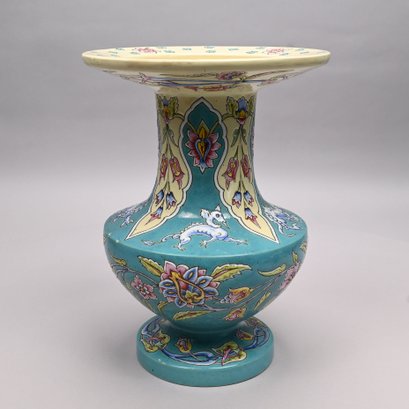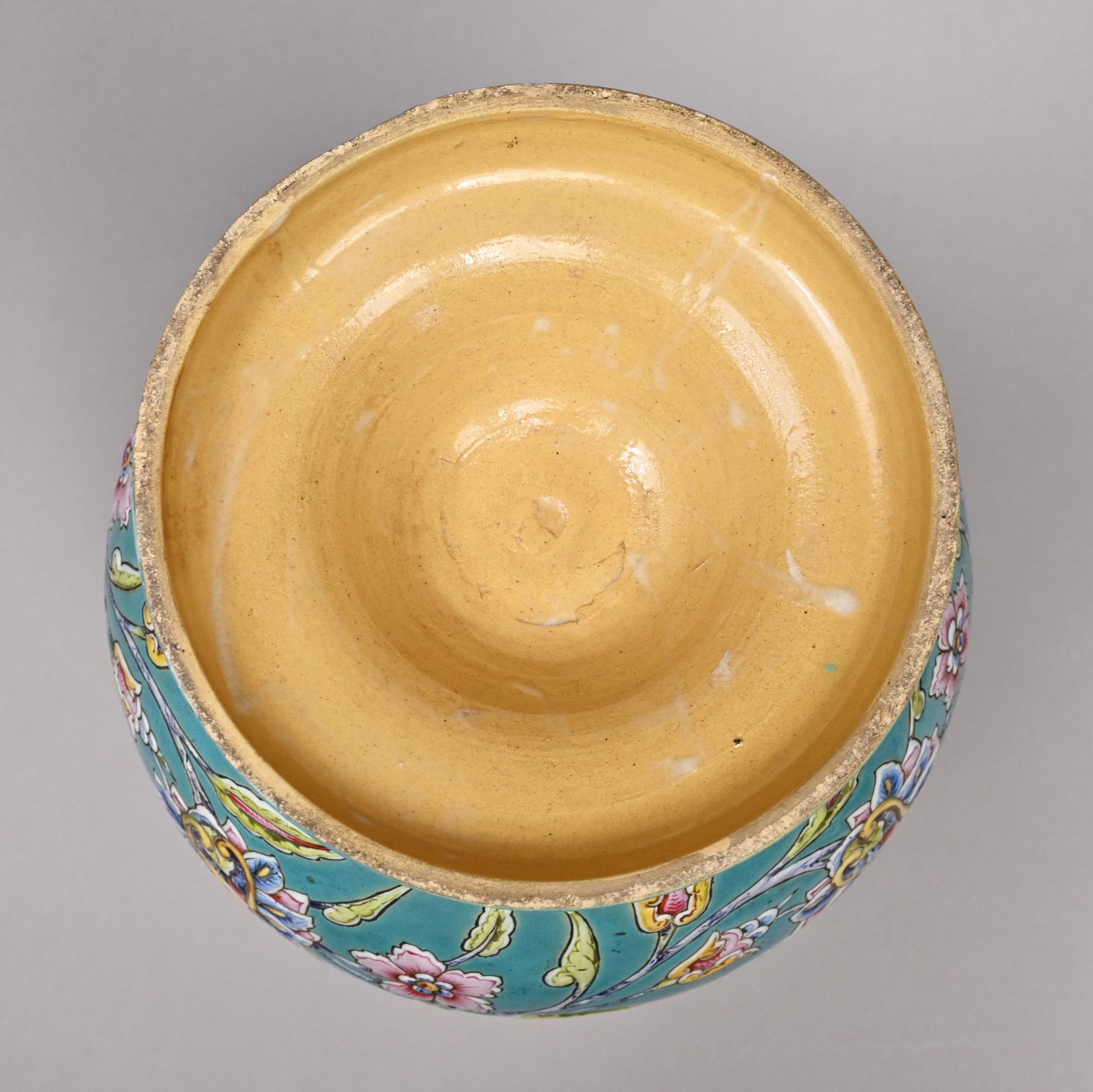 French Enamelled Faience Vase, Attributed to Eugene-Victor Collinot, Circa 1860s. Decorated in Persian style, the everted pale yellow rim enamelled with four flowers and scattered leaves, above the elongated neck reserved with pale yellow lappet panels, each enamelled with foliate devices suspending flower stems, reserved on the turquoise blue ground decorated with blossoms above grotesque creatures, all within wide bands of flowering vines, unmarked.