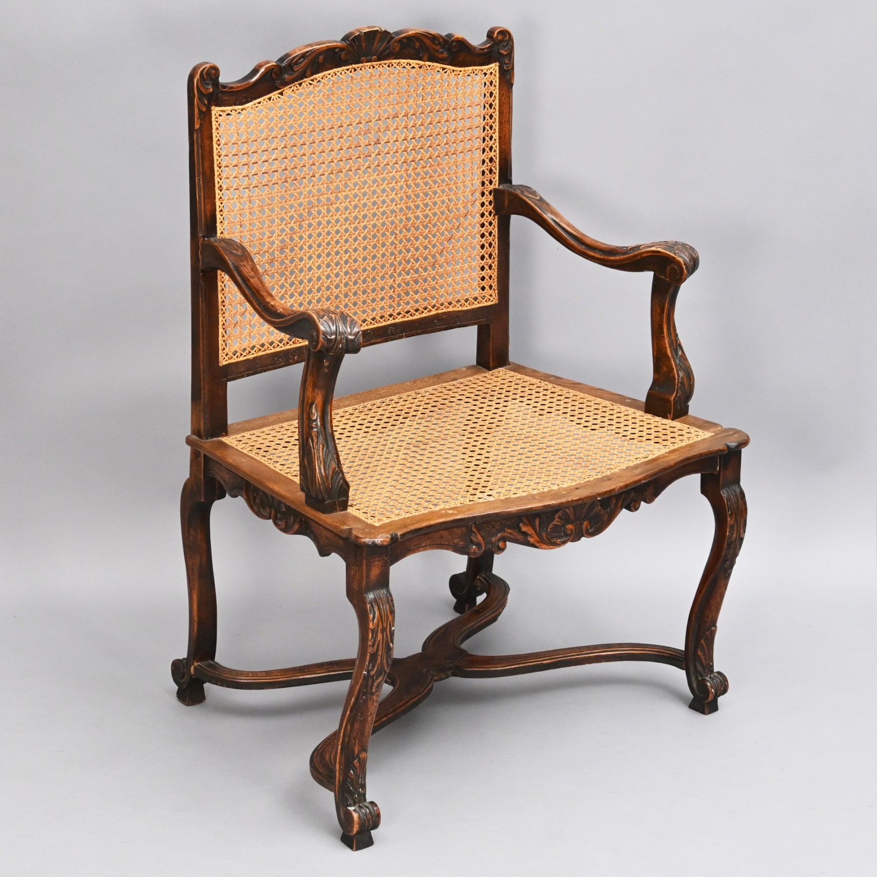 The shell carved crest rail over a caned back flanked by shaped arms with shell carved handholds, above a serpentine front seat, raised on cabriole legs joined by an X-stretcher terminating in scrolled feet. H: 38 in.; W: 26 in.; D: 21 in.