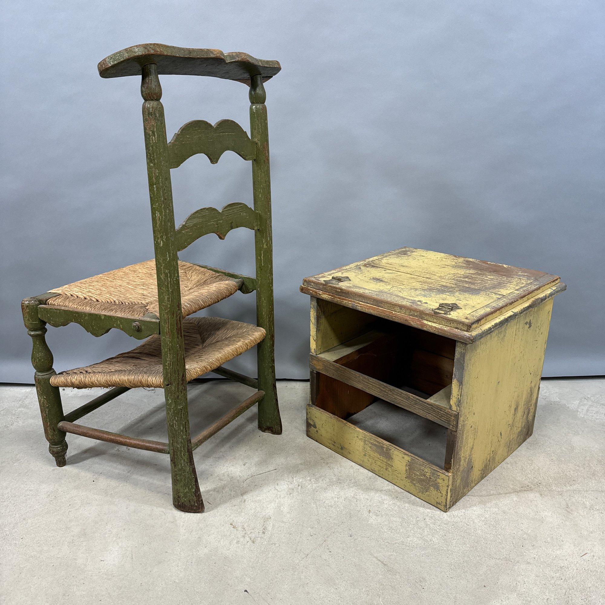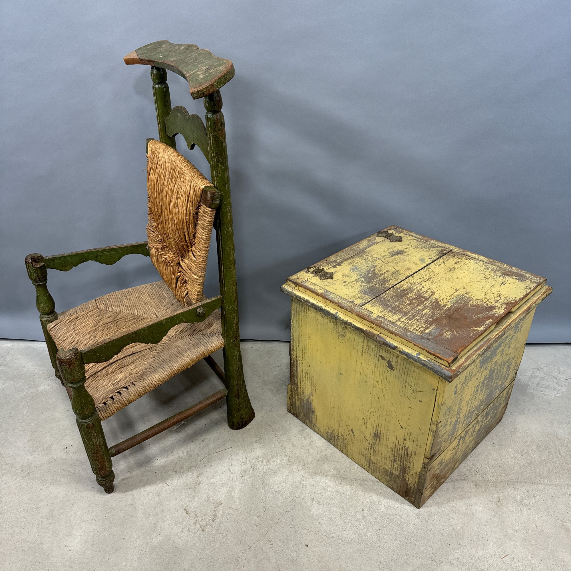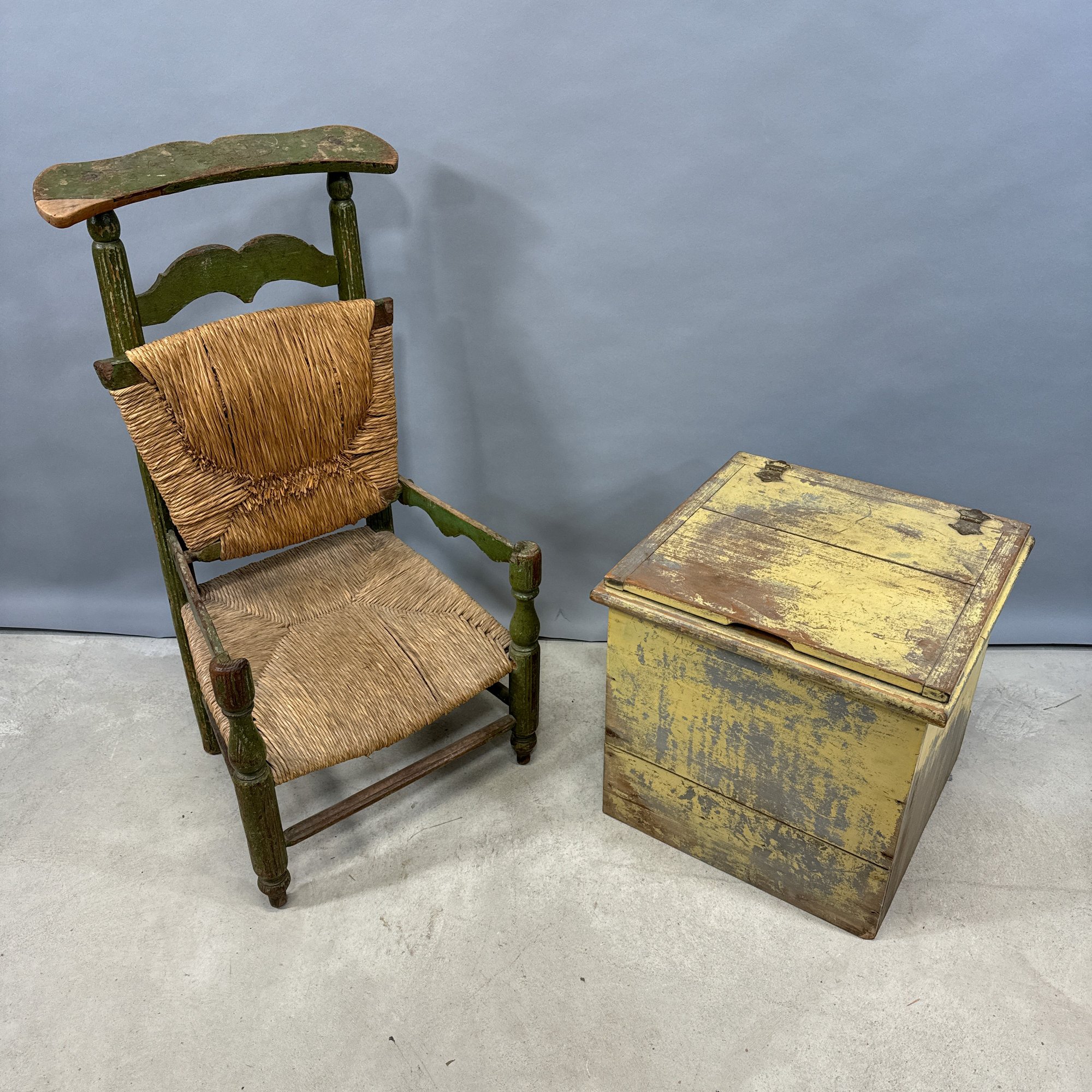 French Painted Convertible Chair and a Commode. The chair with rush seat and back, the commode in yellow paint.