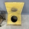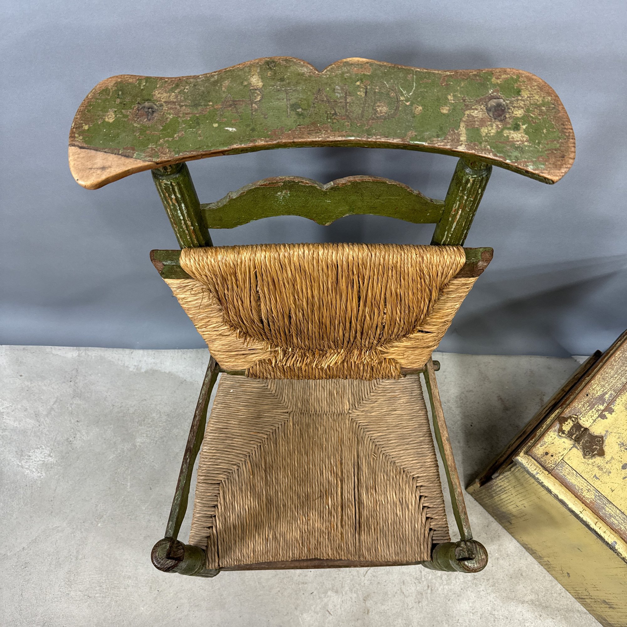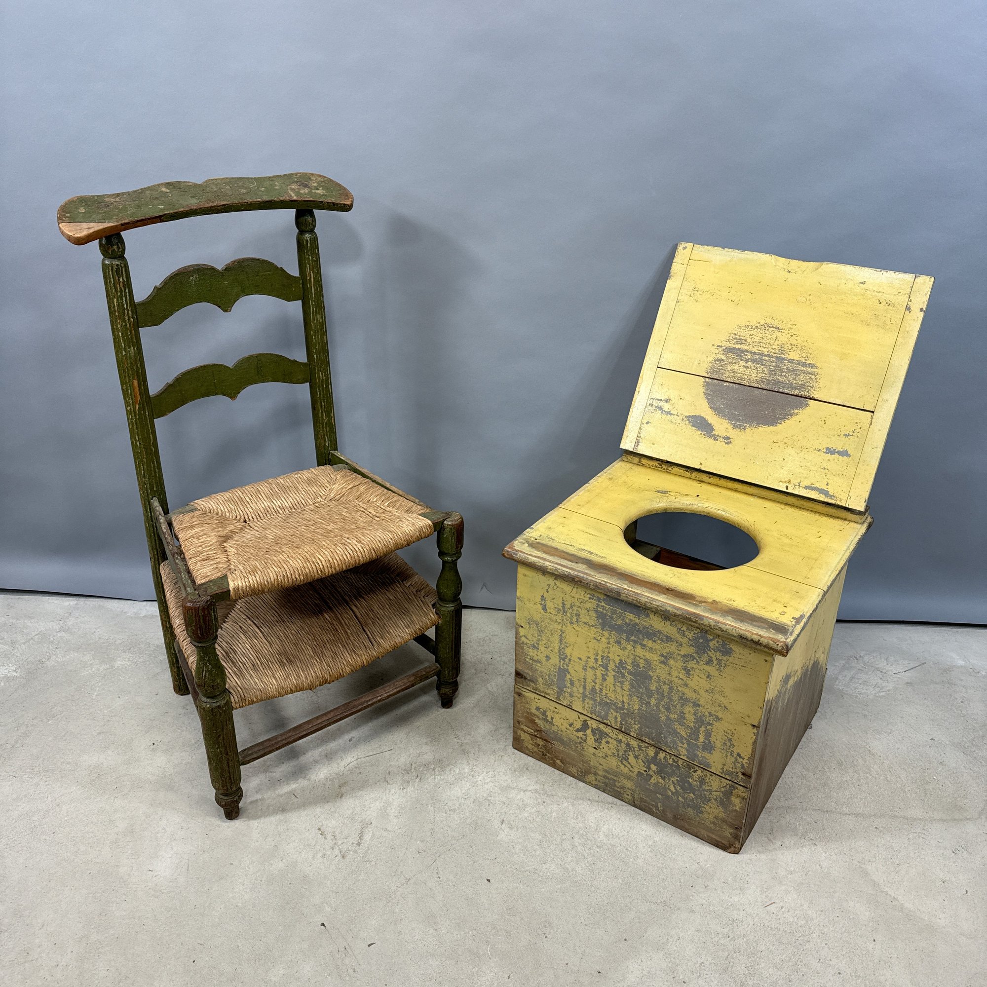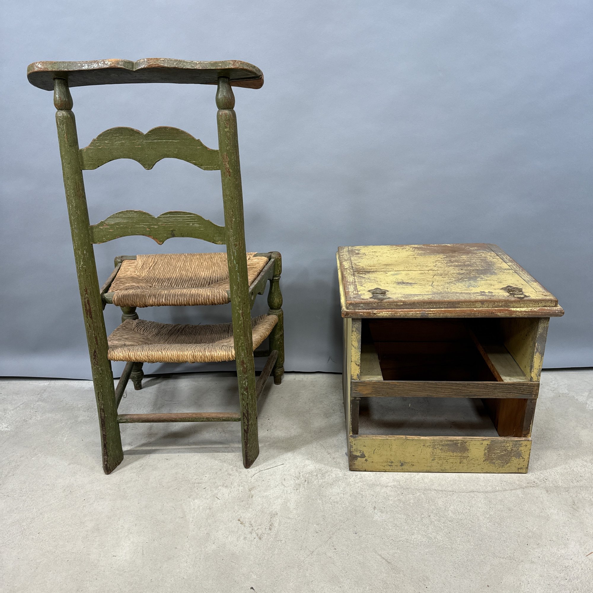 French Painted Convertible Chair and a Commode. The chair with rush seat and back, the commode in yellow paint.