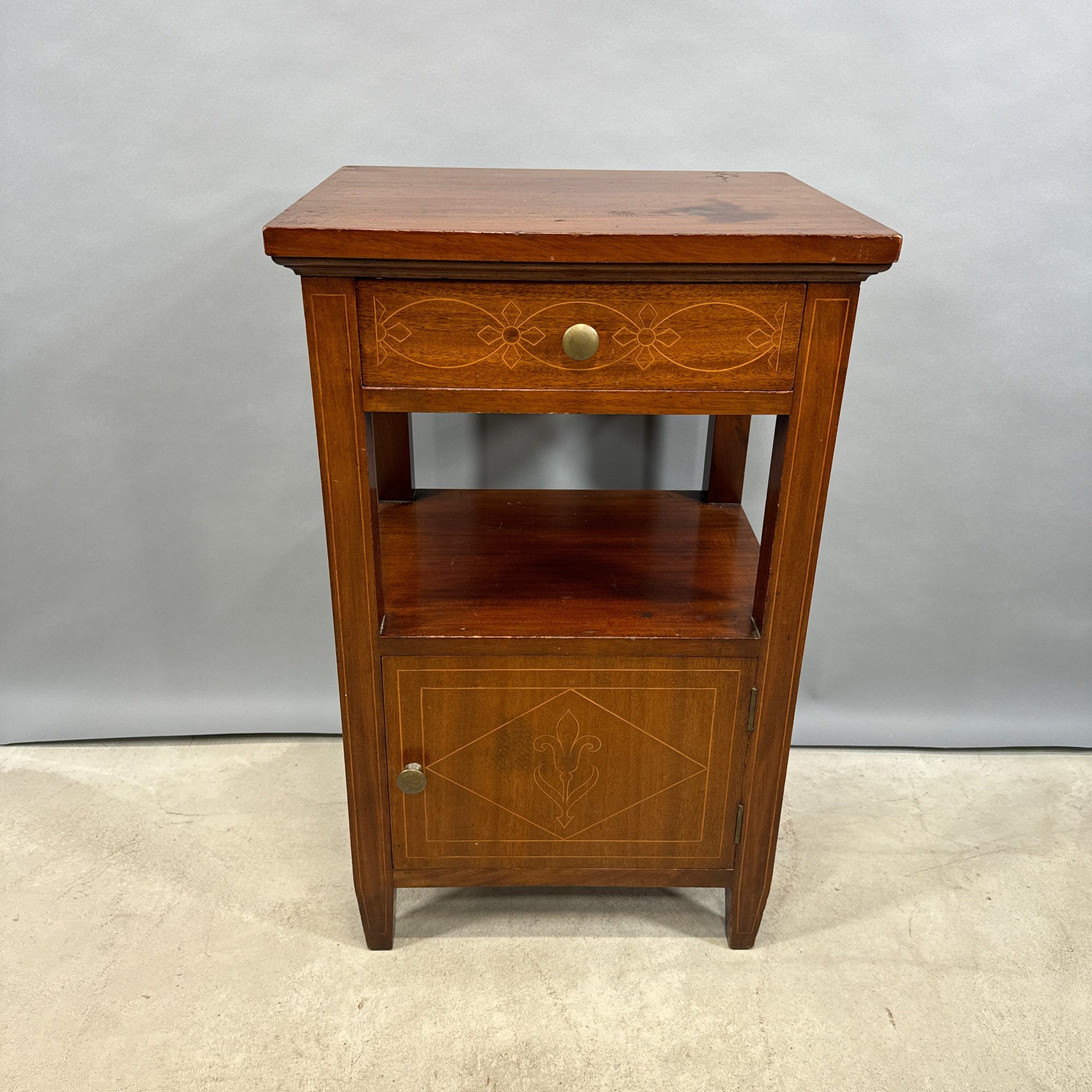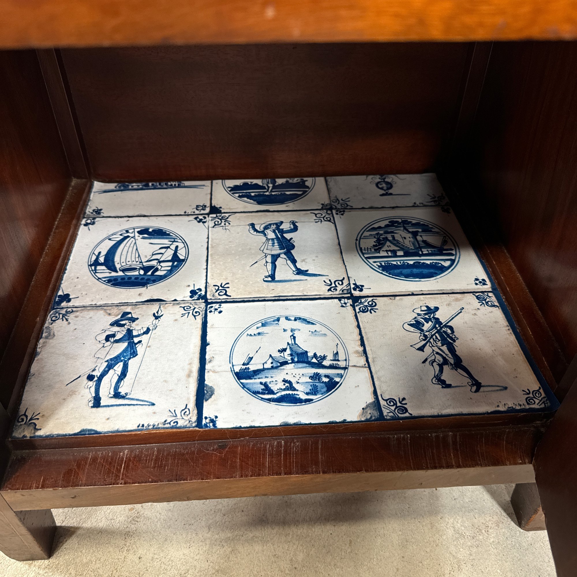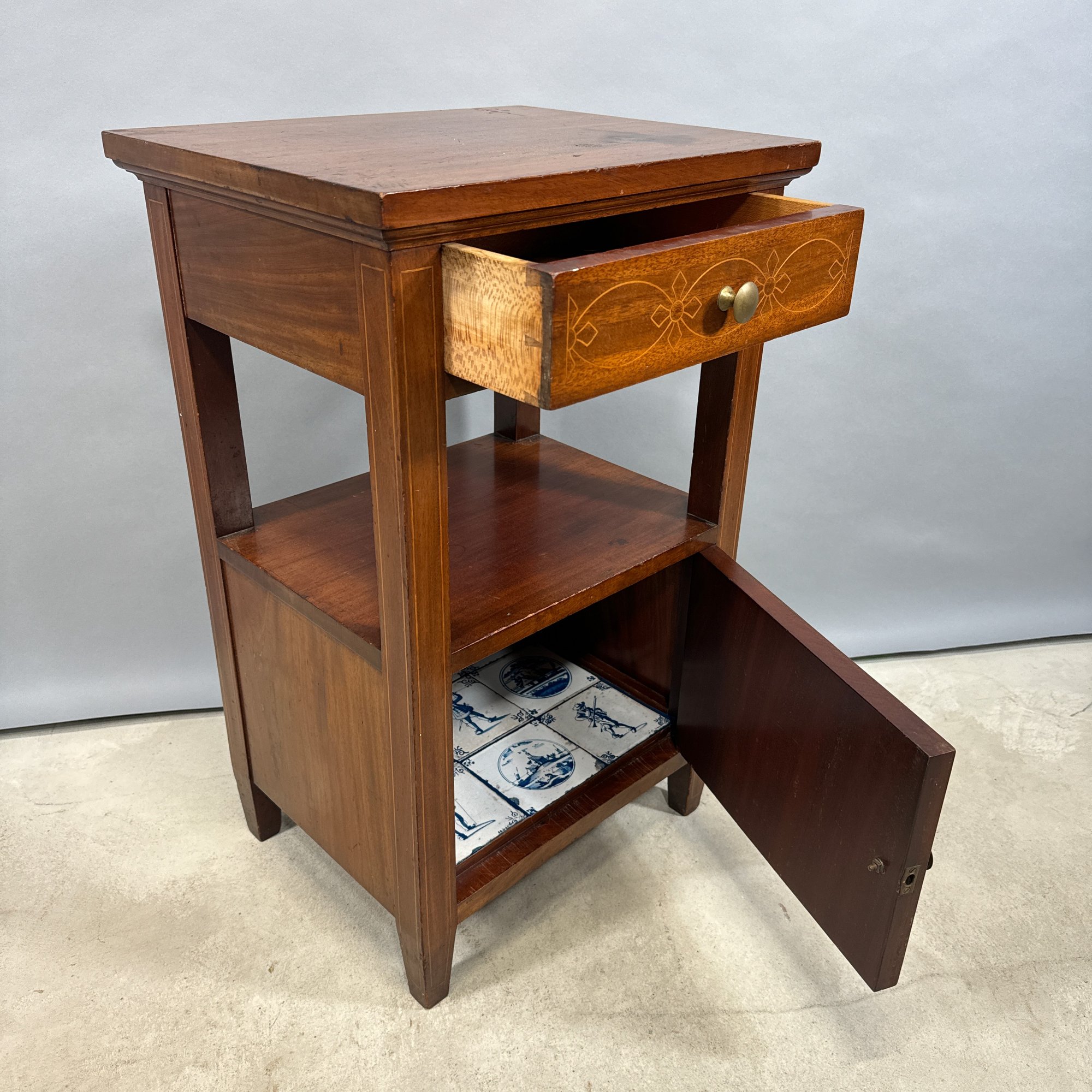 French Provincial Style Inlaid Mahogany Side Table. The rectangular top above a drawer, shelf and cupboard fitted with six Delft blue and white tiles.