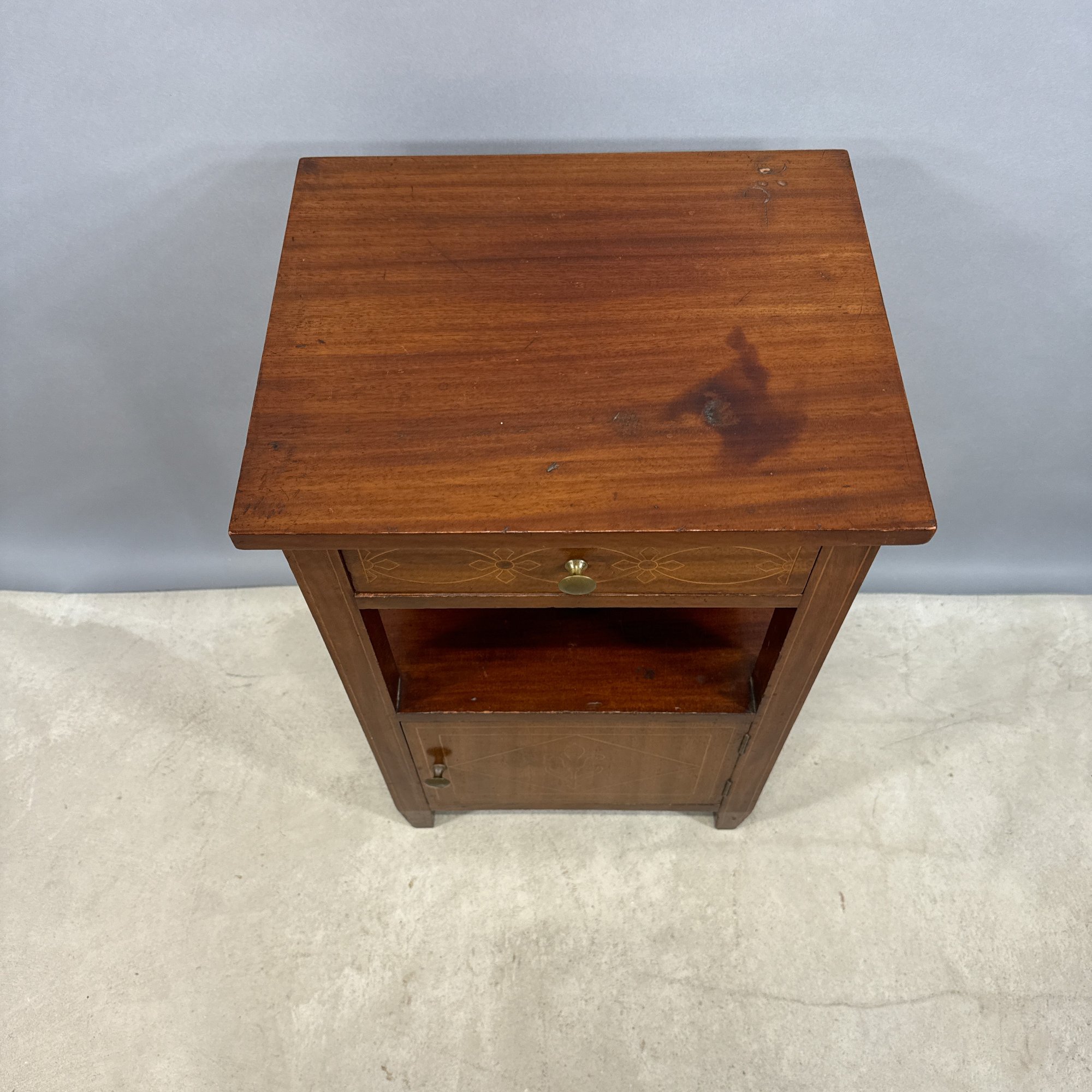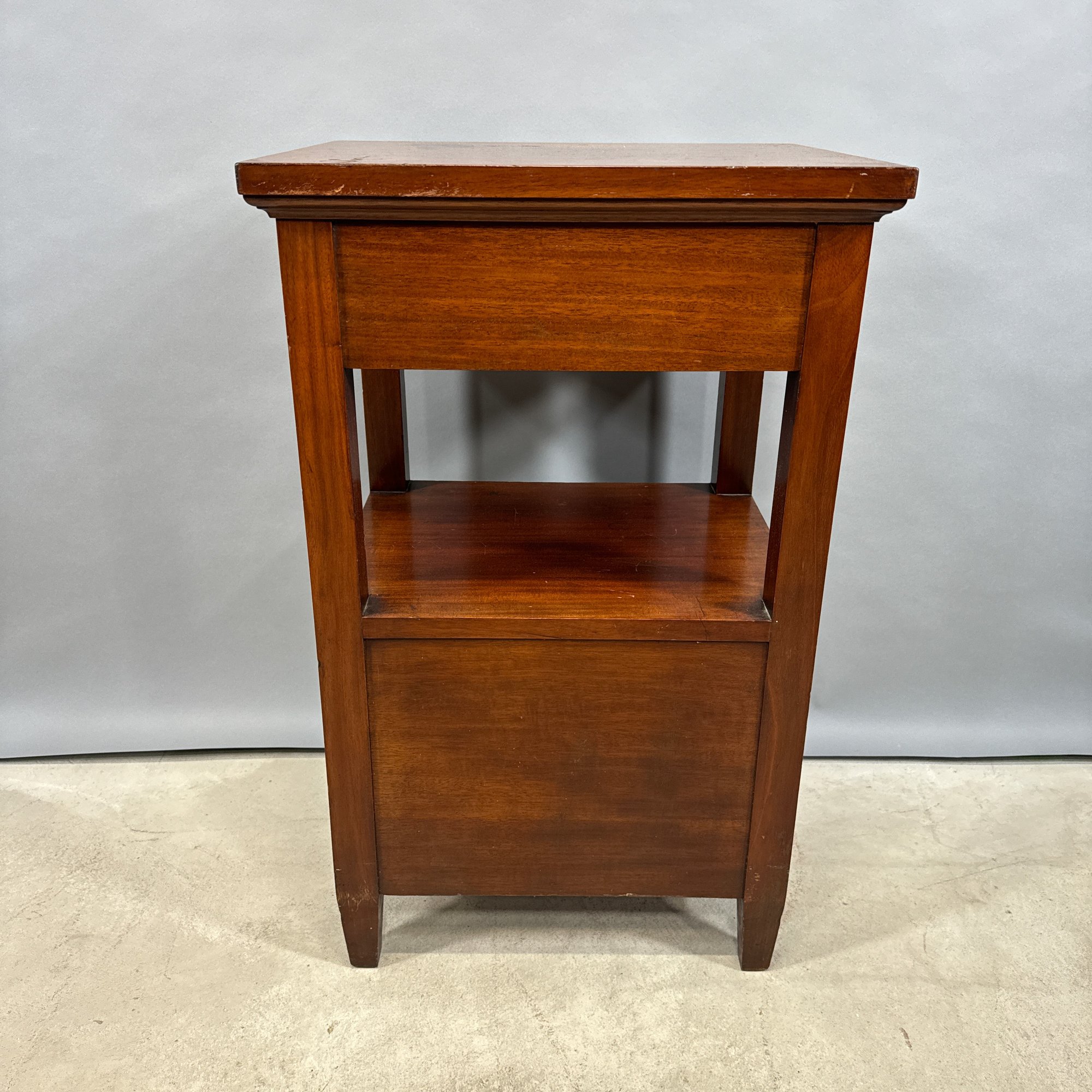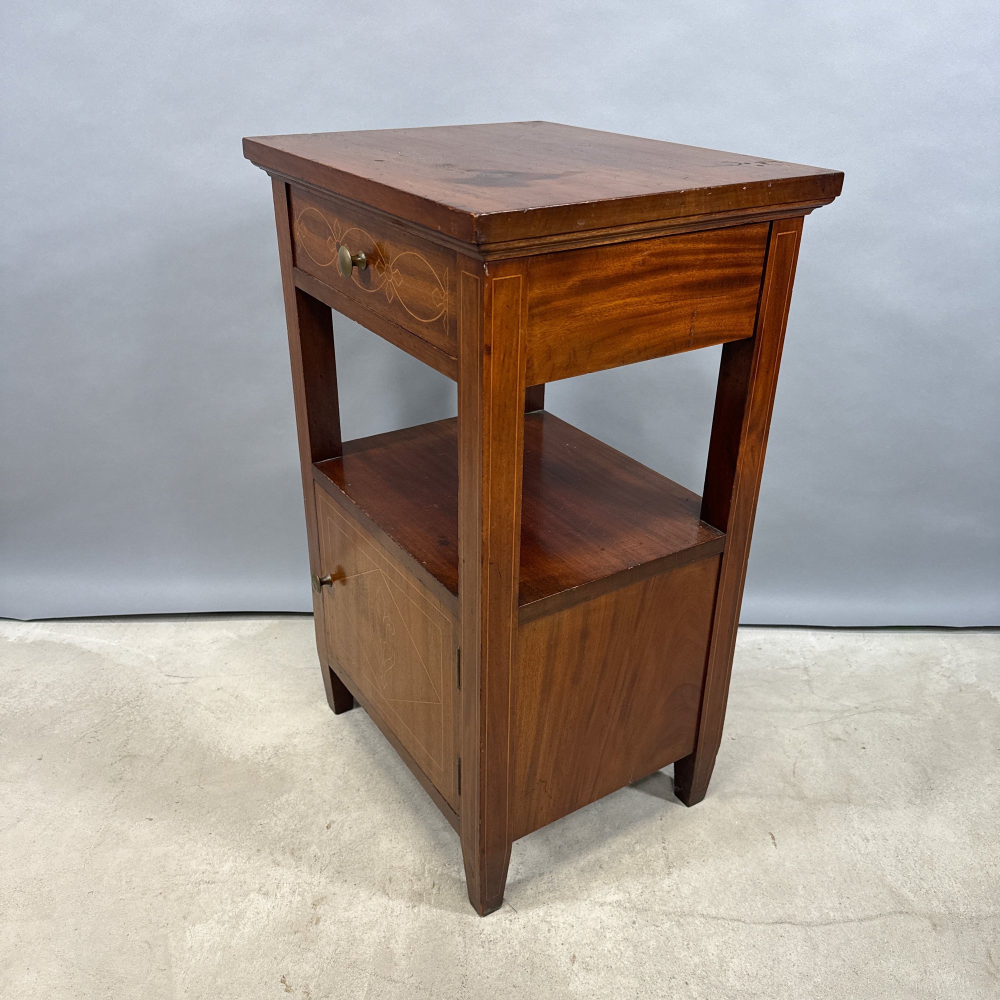 French Provincial Style Inlaid Mahogany Side Table. The rectangular top above a drawer, shelf and cupboard fitted with six Delft blue and white tiles.