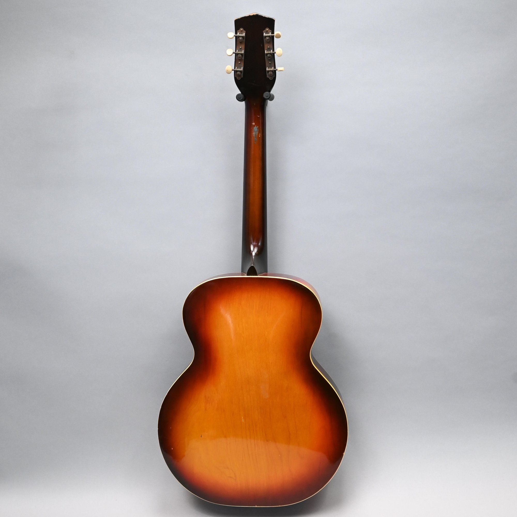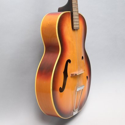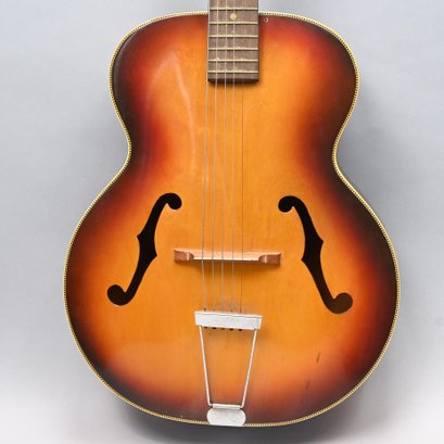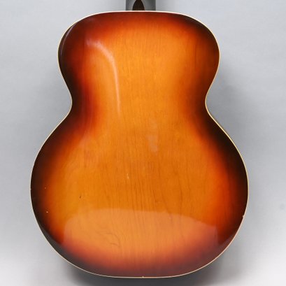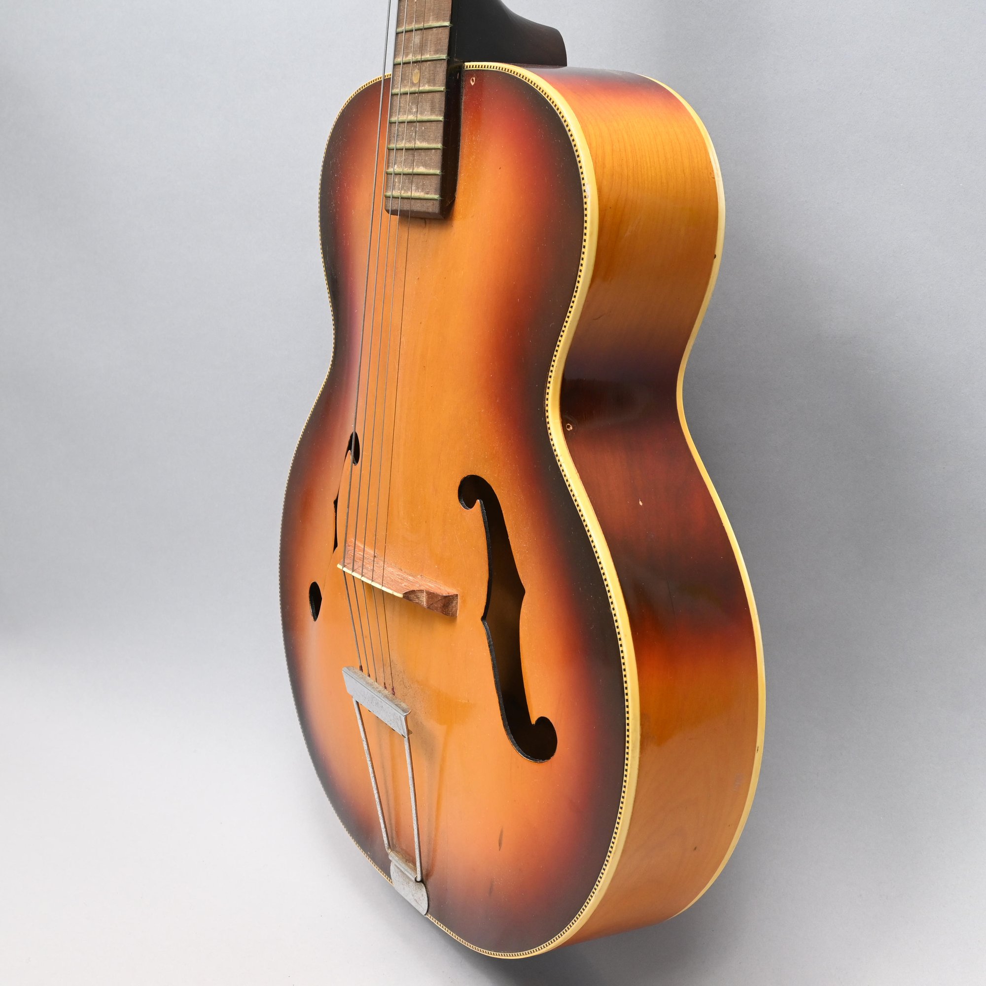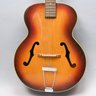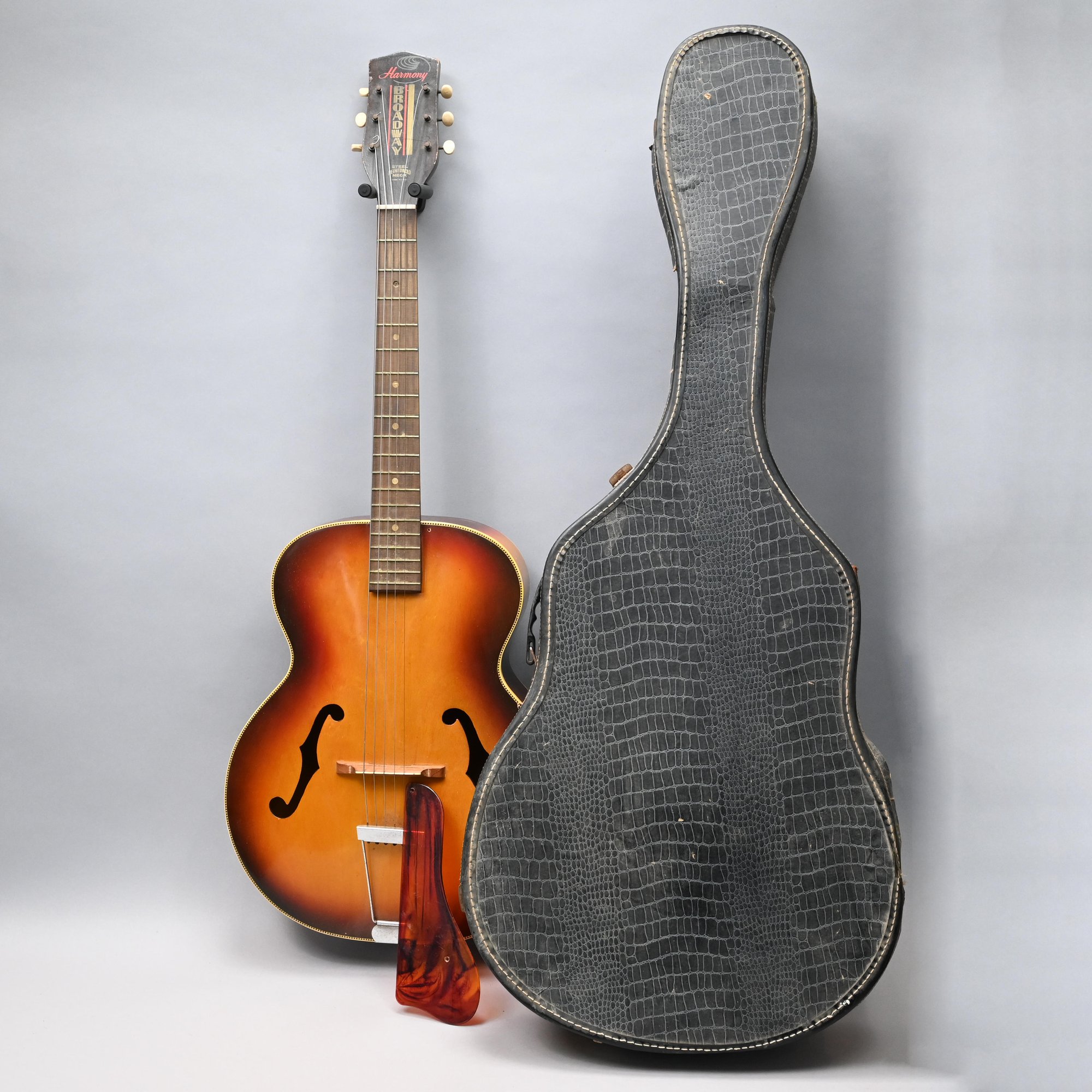 Harmony Broadway Model S65 Birch 'Sunburst' Archtop Six-String Acoustic Guitar. 20 frets, steel reinforced neck, with pickguard; housed in a hardshell case.