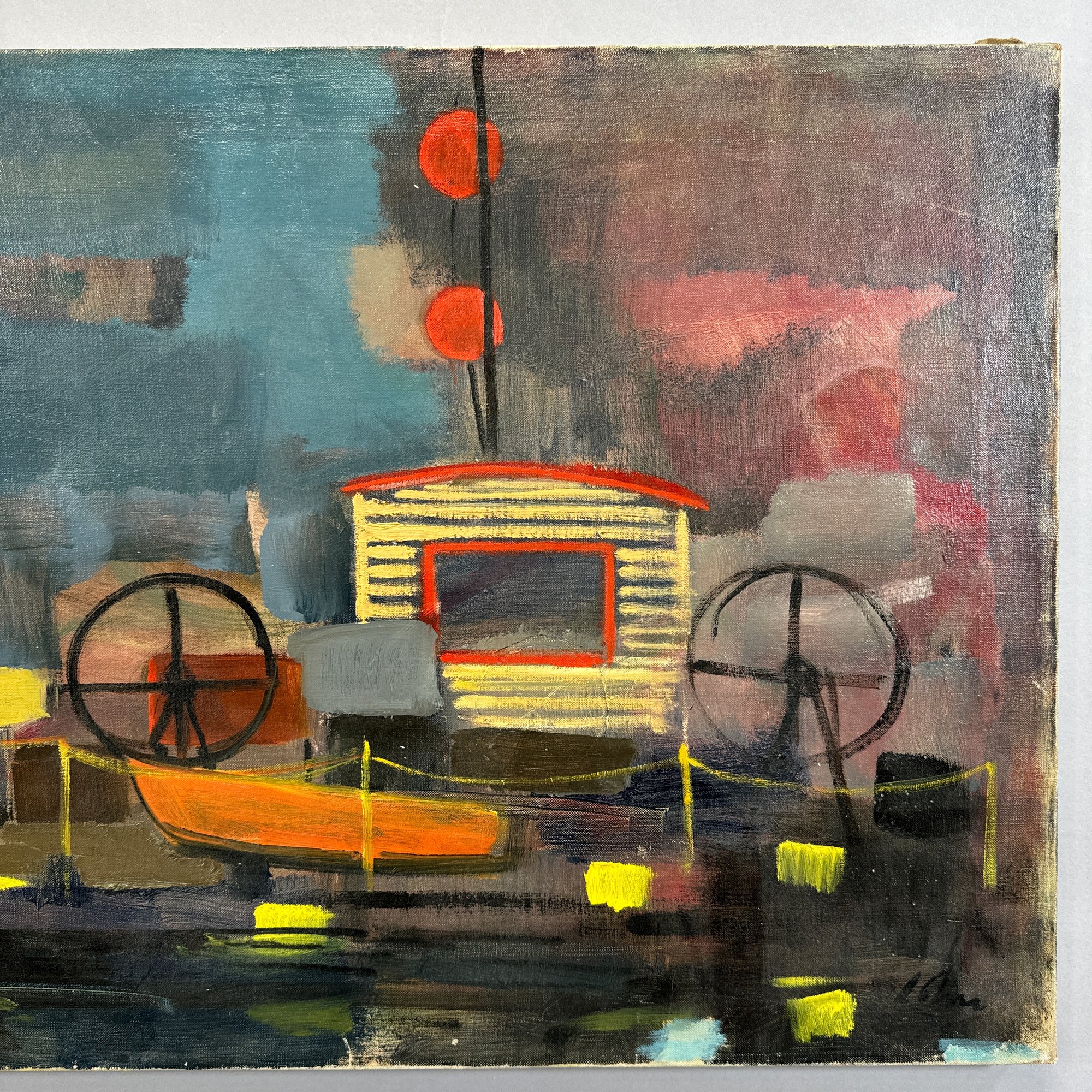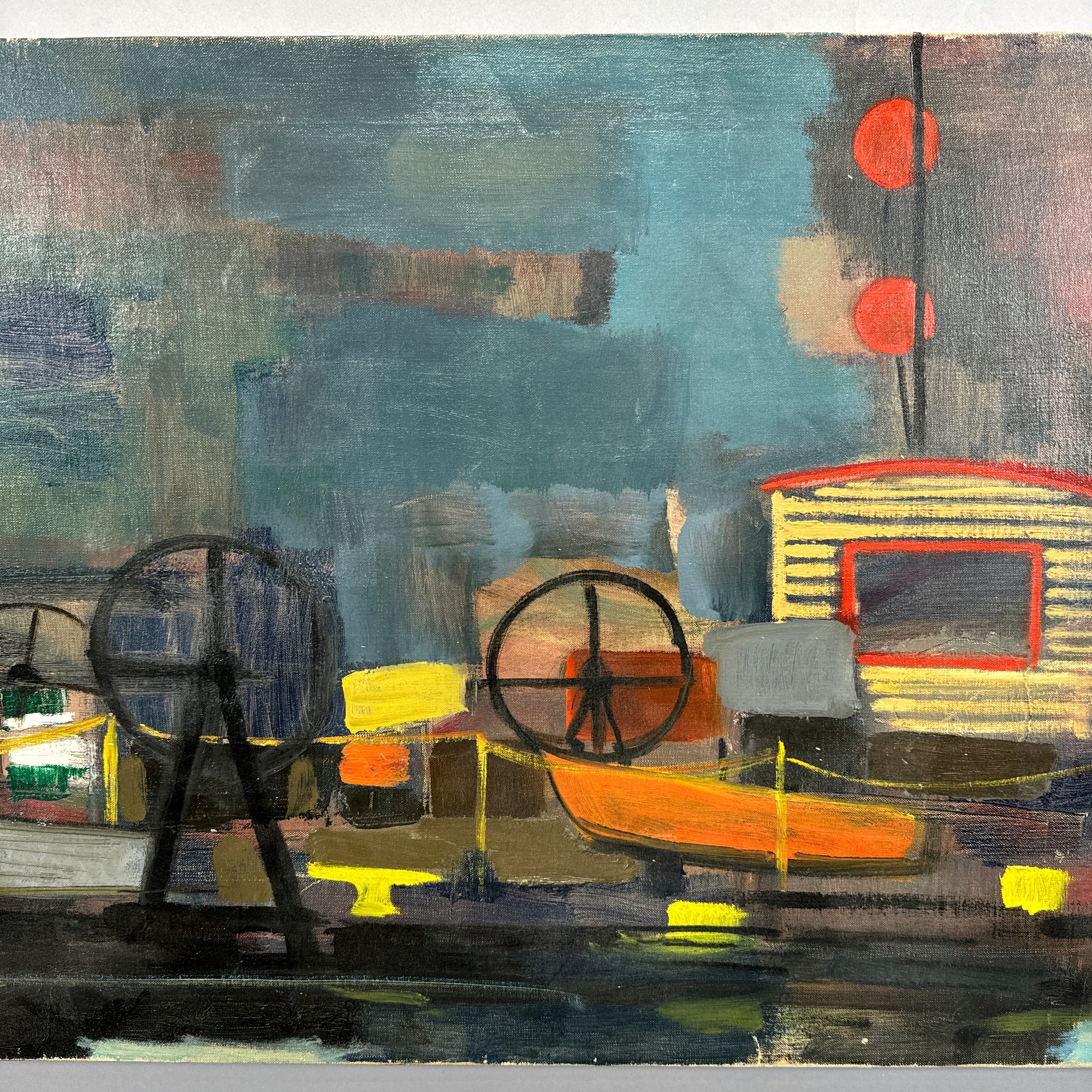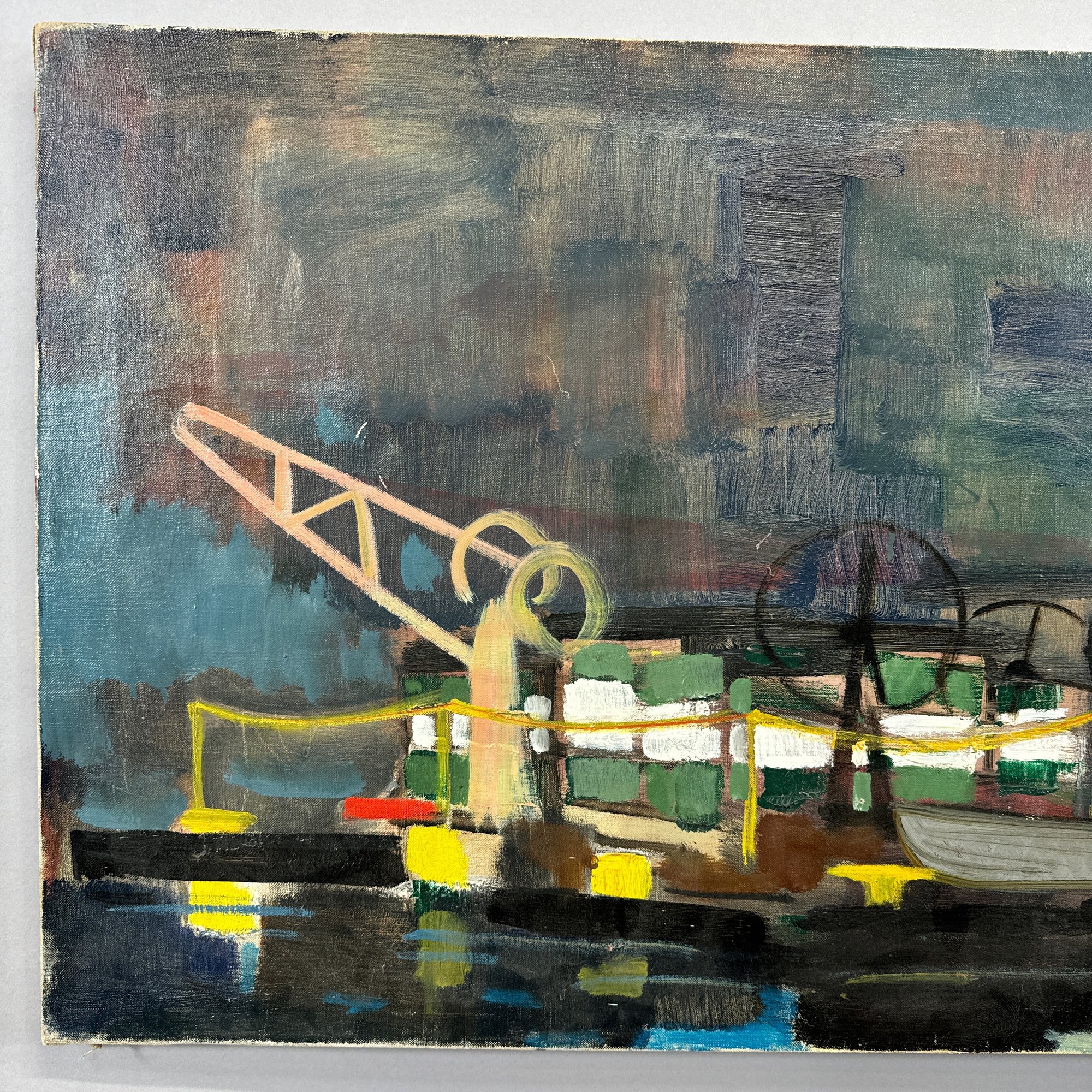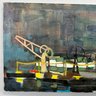 Harold Cohn (1908, Detroit, Michigan-1982, Michigan). Working Dock in Harbor, 1950s-1960s. Oil on canvas, signed "R. Cohn" lower right.