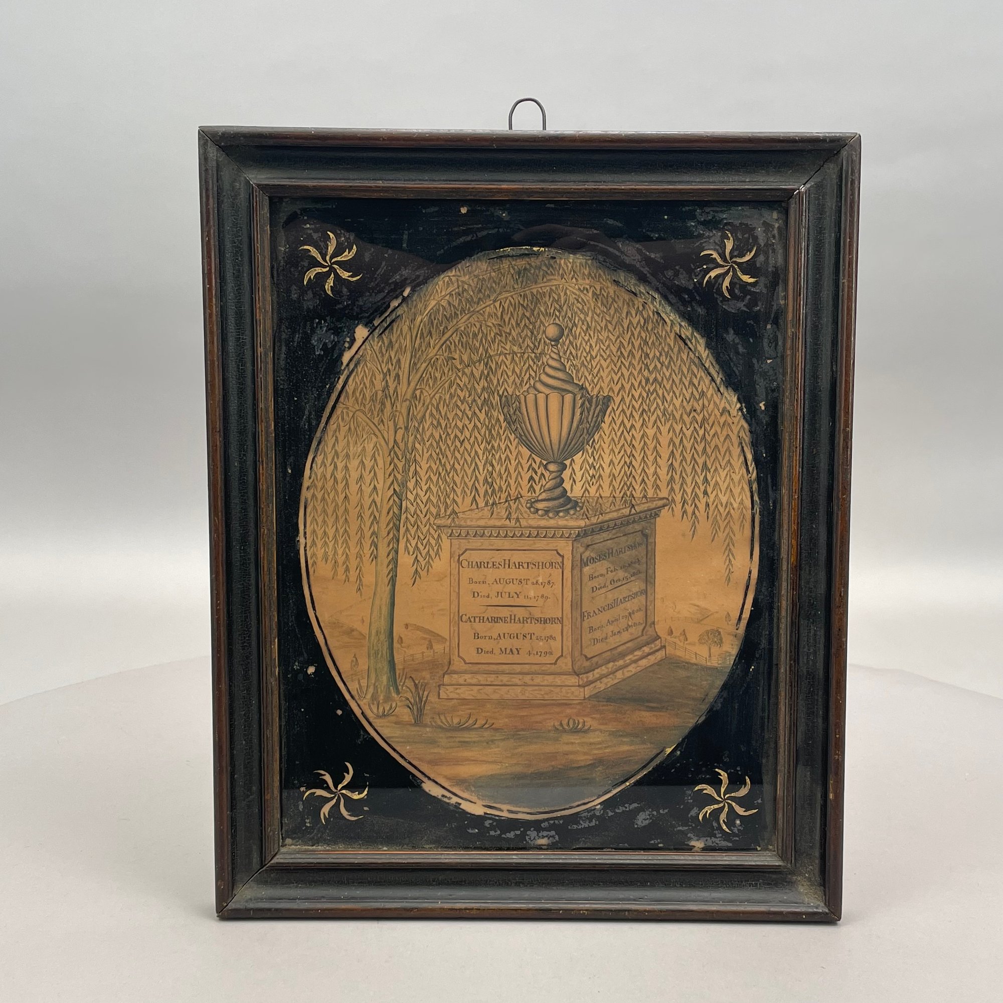 Hartshorn Family Mourning Picture, 1780-1810. Depicting a monument with the names of Charles (1787-1789), Catharine (1780-1790), Moses (1803-1803) and Francis (1800-1810), mounted under an eglomise mat.