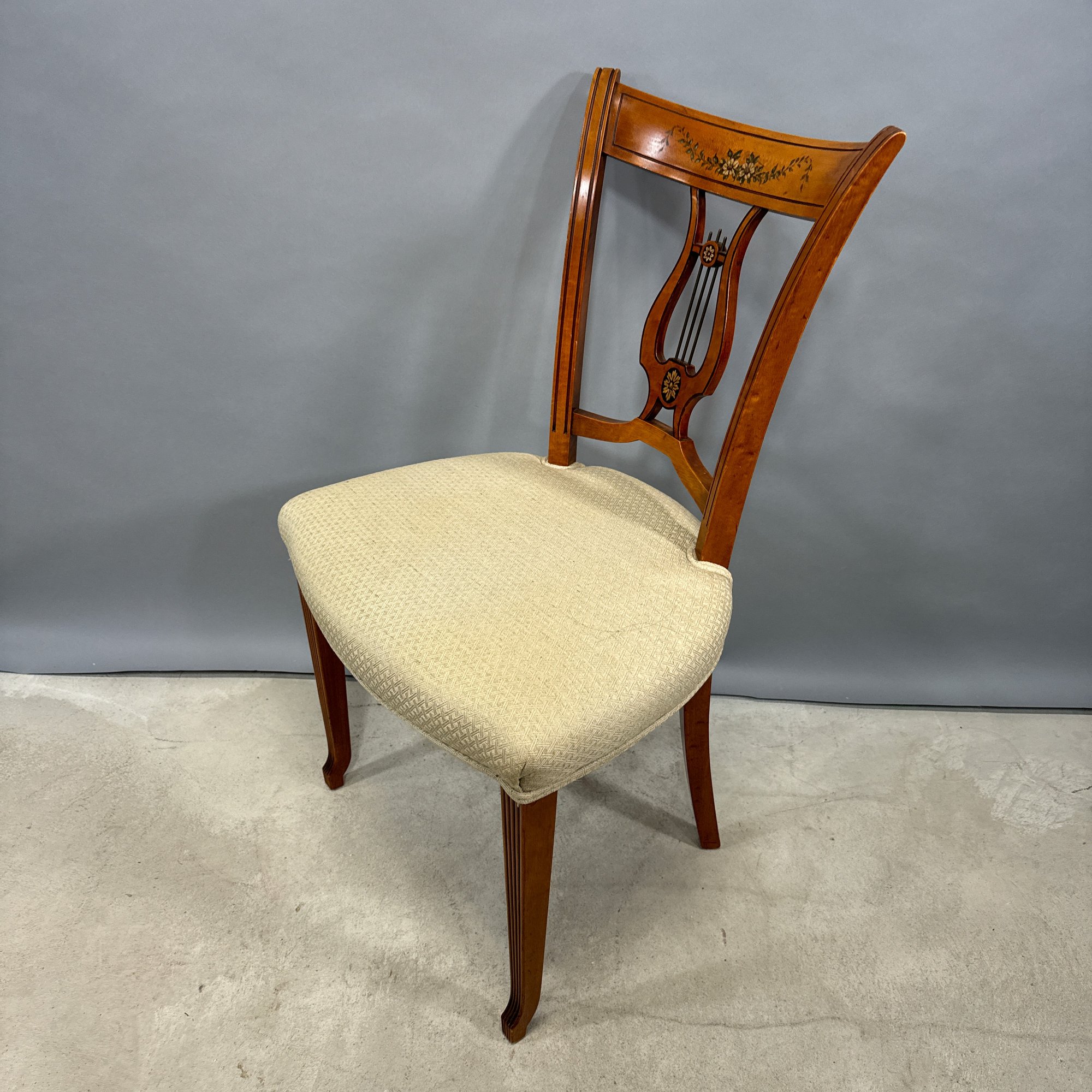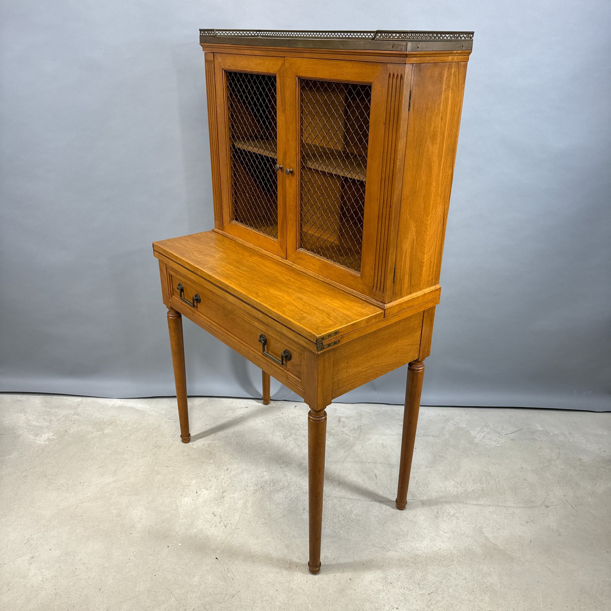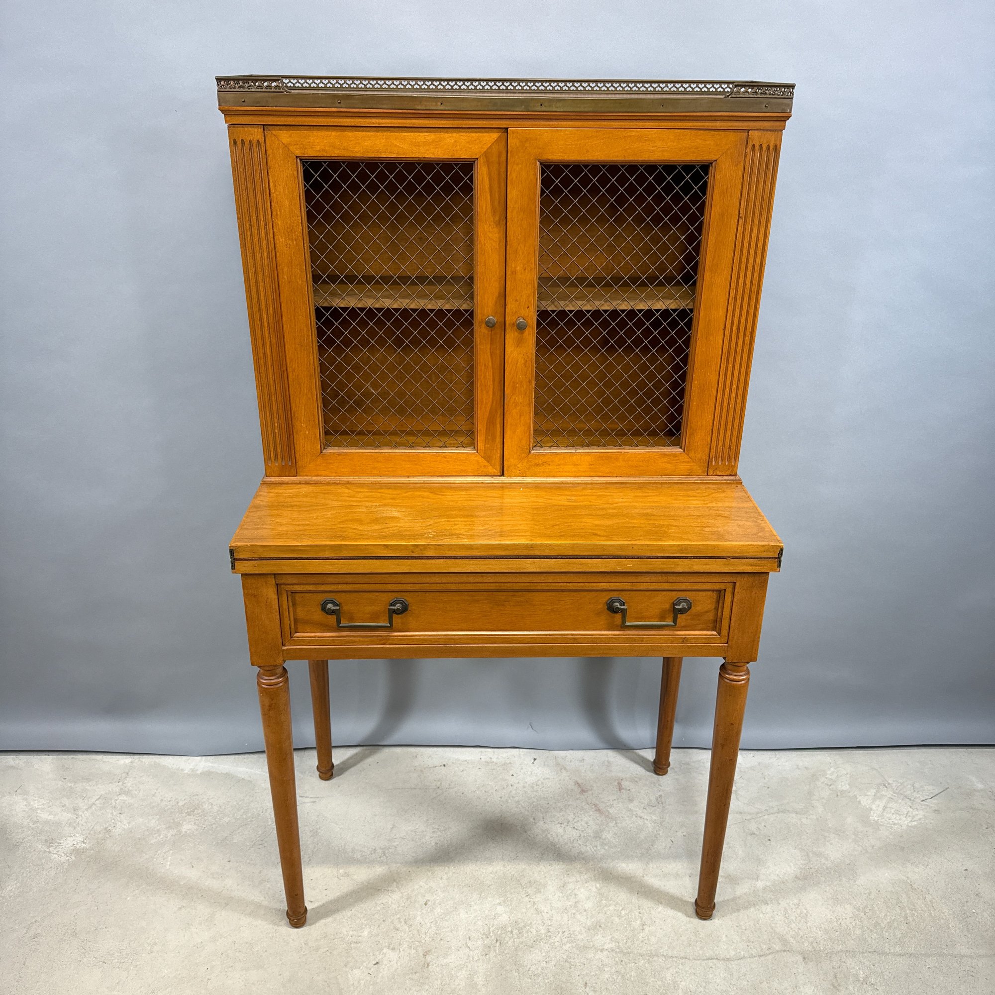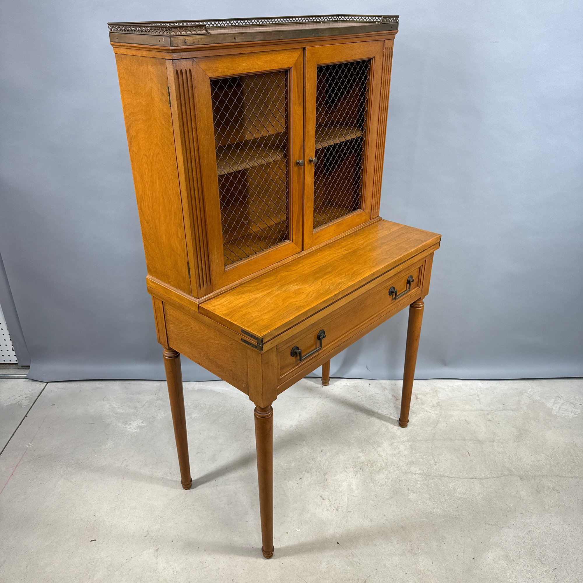 Hepplewhite Style Mahogany Desk and Bookcase, and a Classical Style Mahogany Side Chair. The desk with brass gallery rail above a bookcase, fold-out writing surface and drawer, raised on columnar legs; the chair with tablet crest above a lyre splat, over-upholstered seat and raised on slightly curved legs.