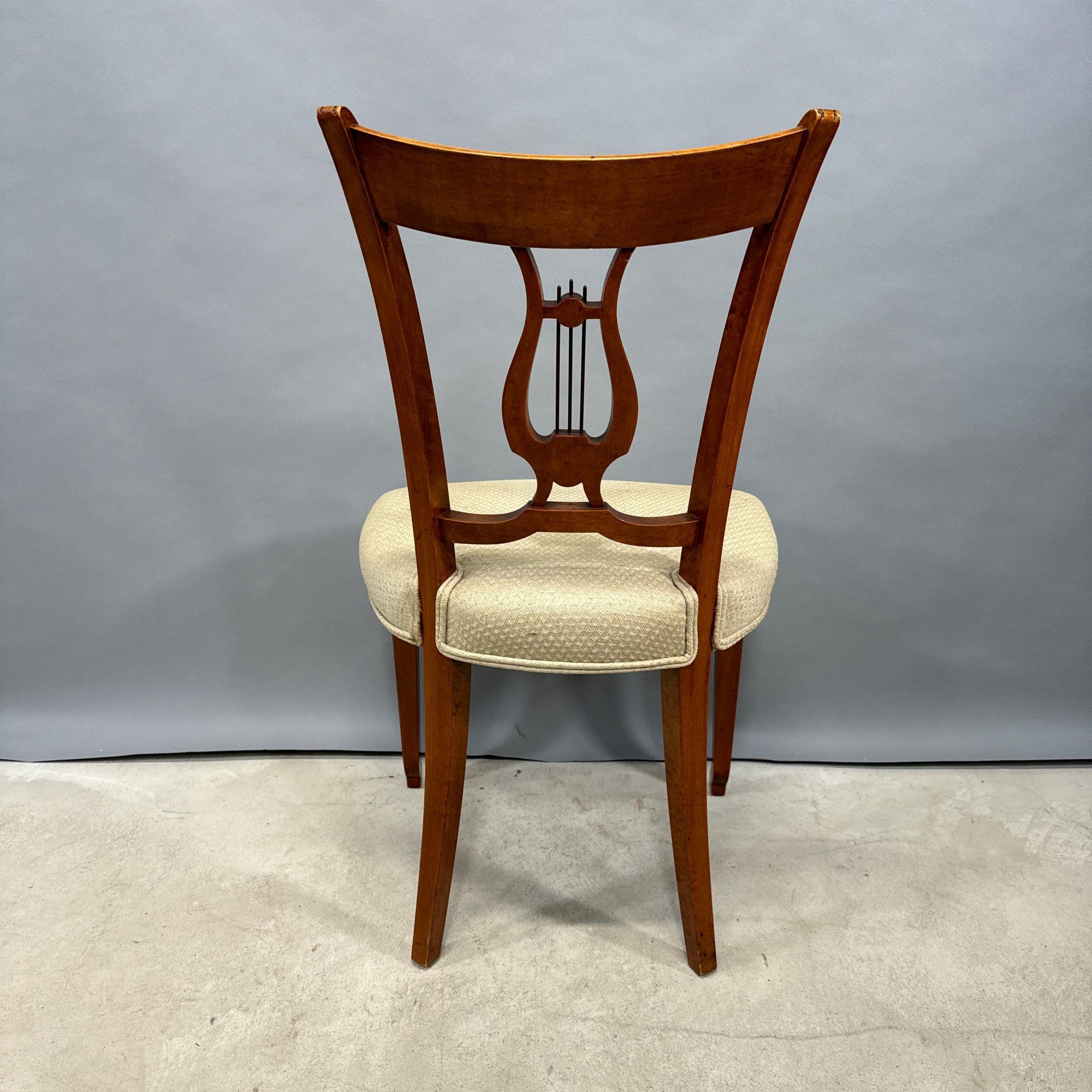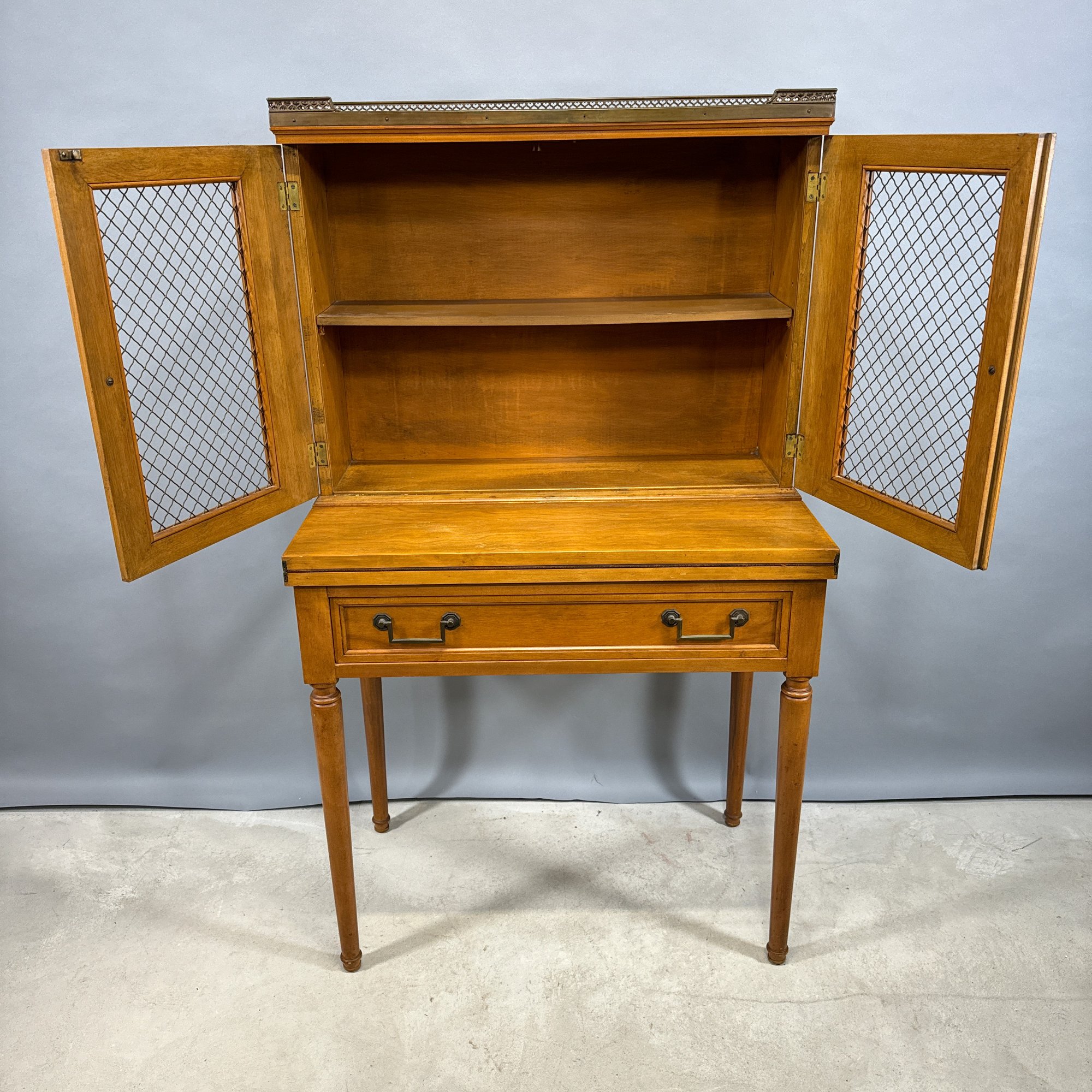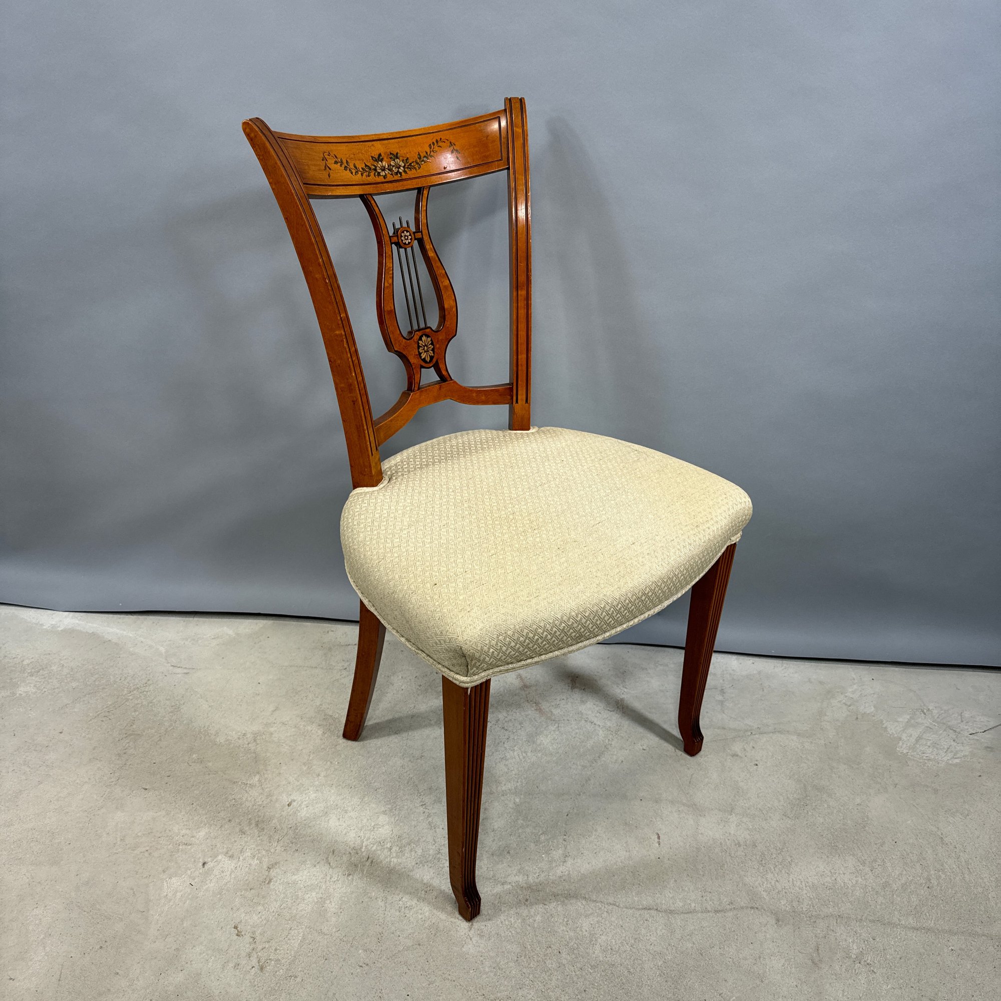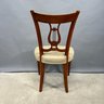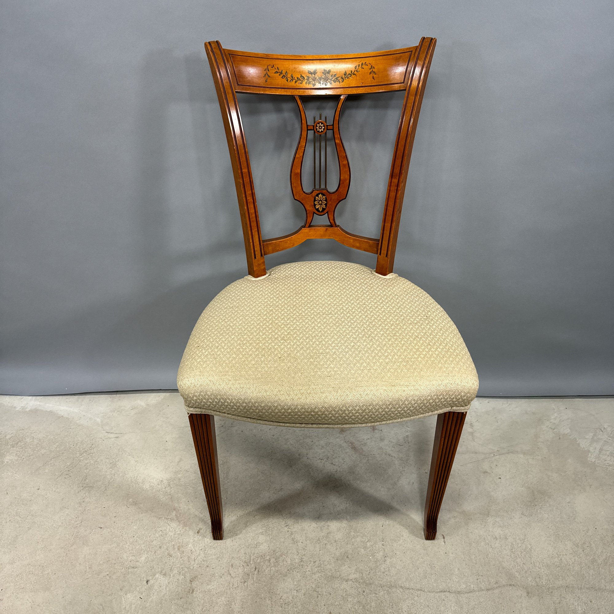 Hepplewhite Style Mahogany Desk and Bookcase, and a Classical Style Mahogany Side Chair. The desk with brass gallery rail above a bookcase, fold-out writing surface and drawer, raised on columnar legs; the chair with tablet crest above a lyre splat, over-upholstered seat and raised on slightly curved legs.