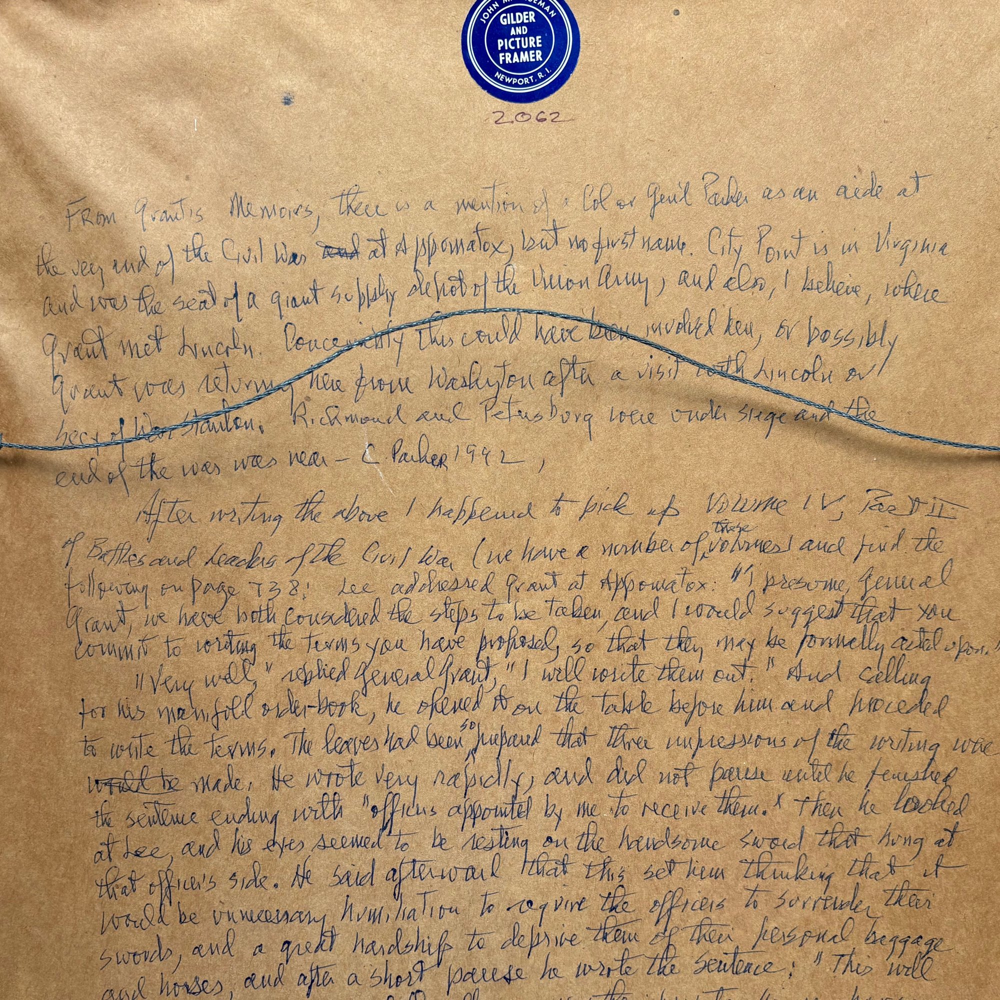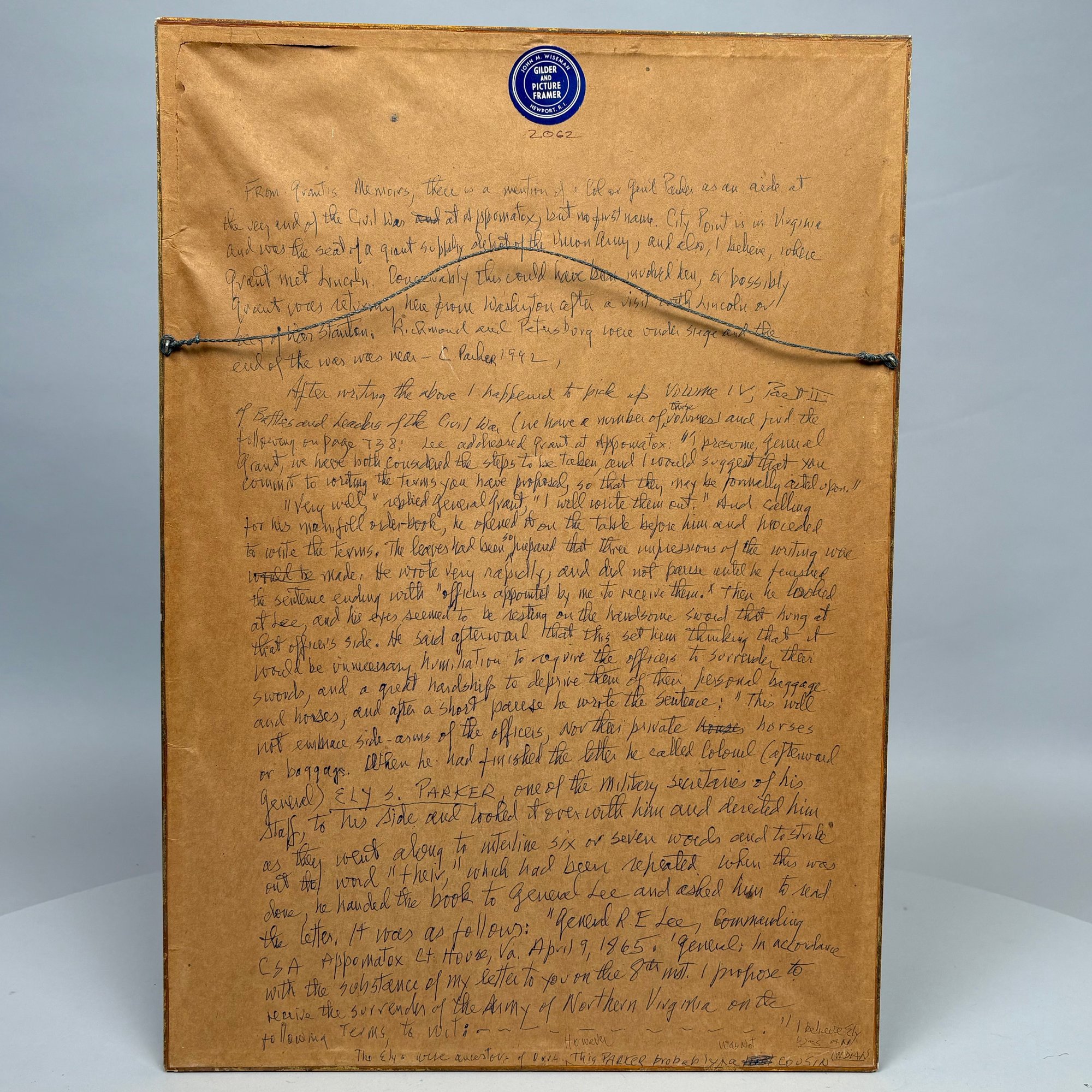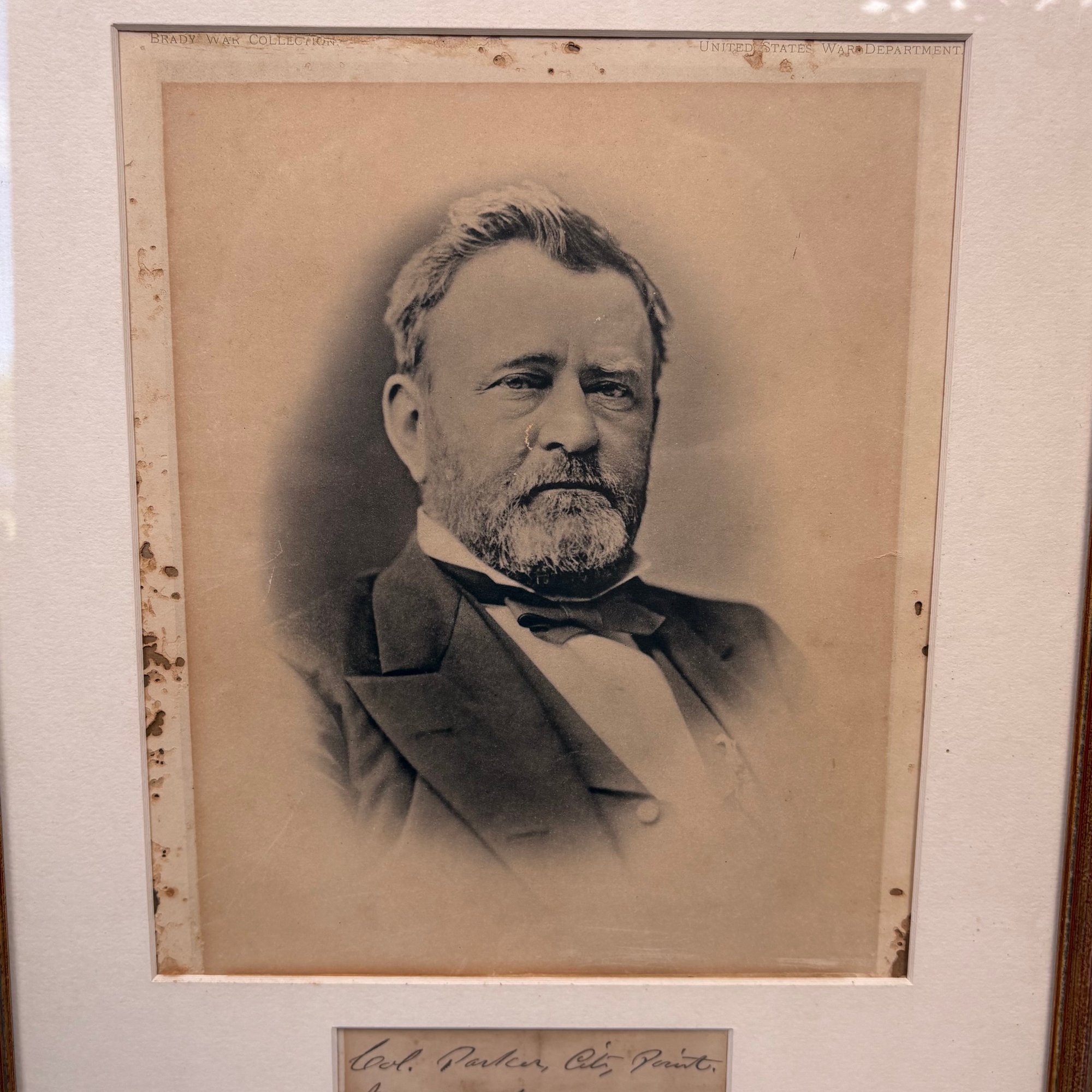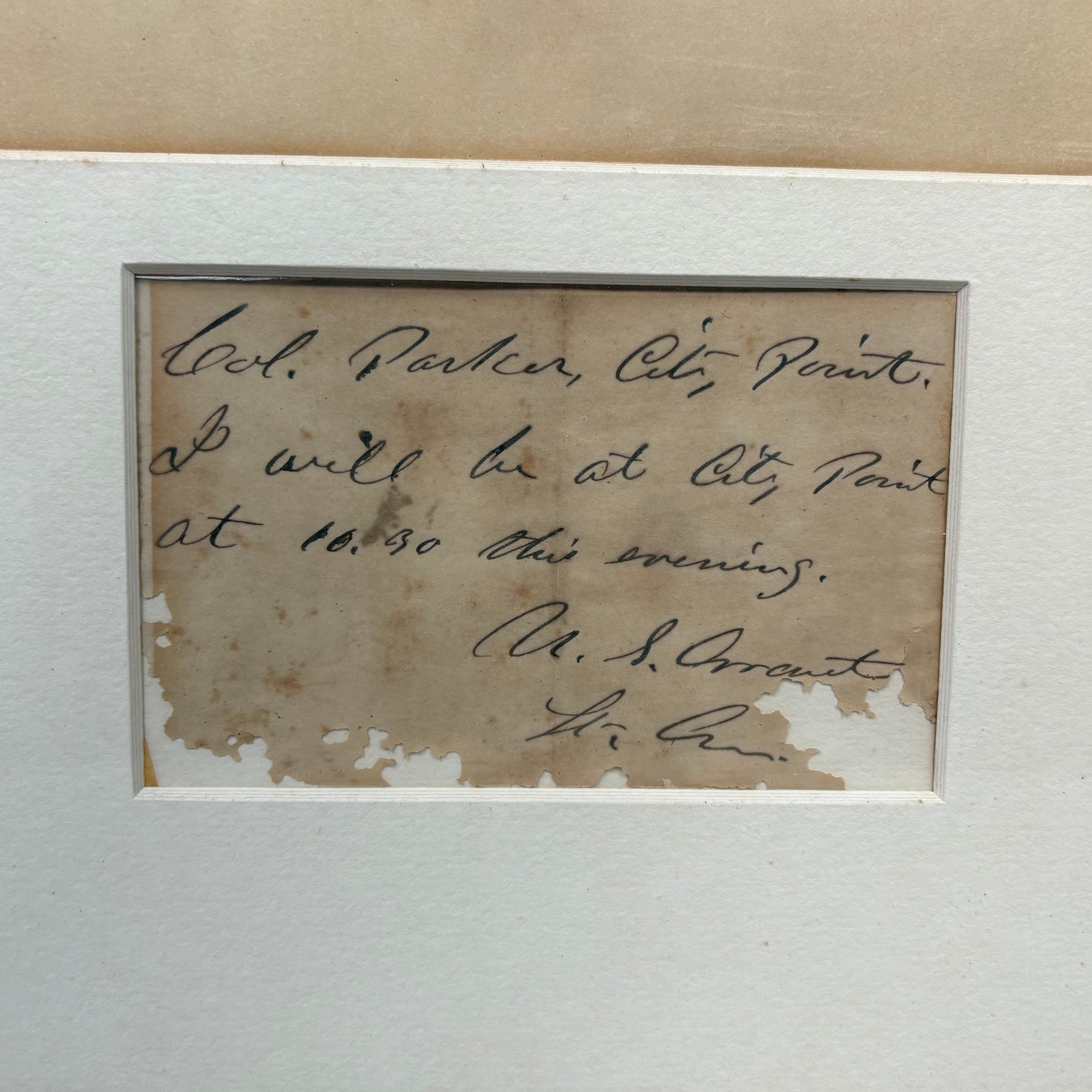 Photographic Print Depicting Ulysses S. Grant with Signature, Rank and Note. The note penned to Colonel Ely Parker. handwritten "Col. Parker, City Point. I will be at City Point at 10:30 this evening. U.S. Grant, Lt. Col."
