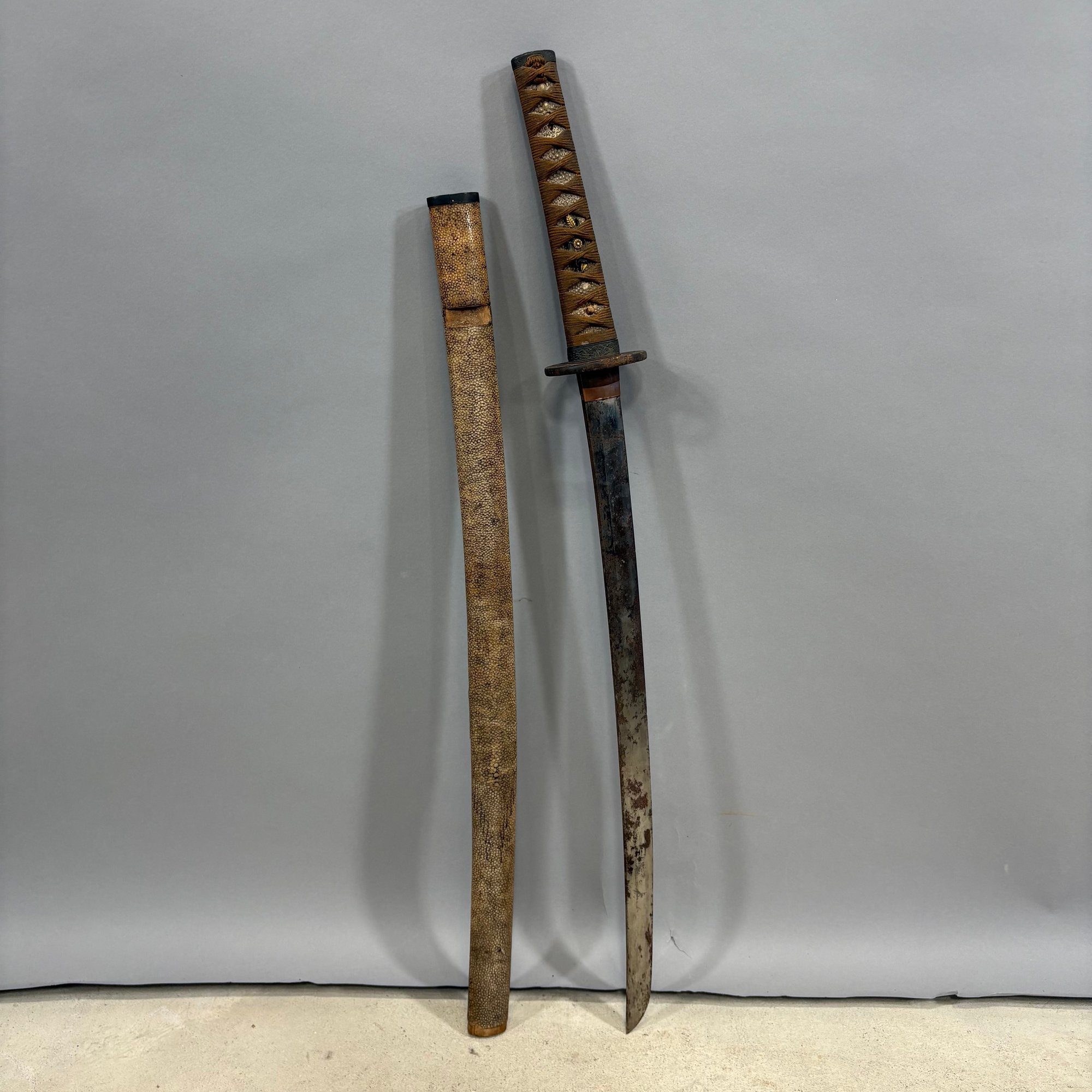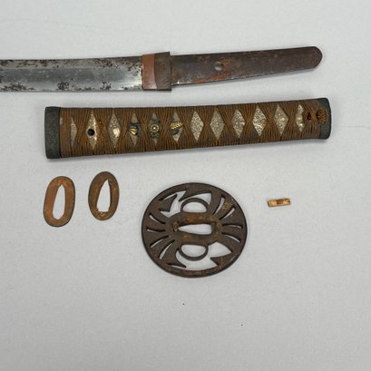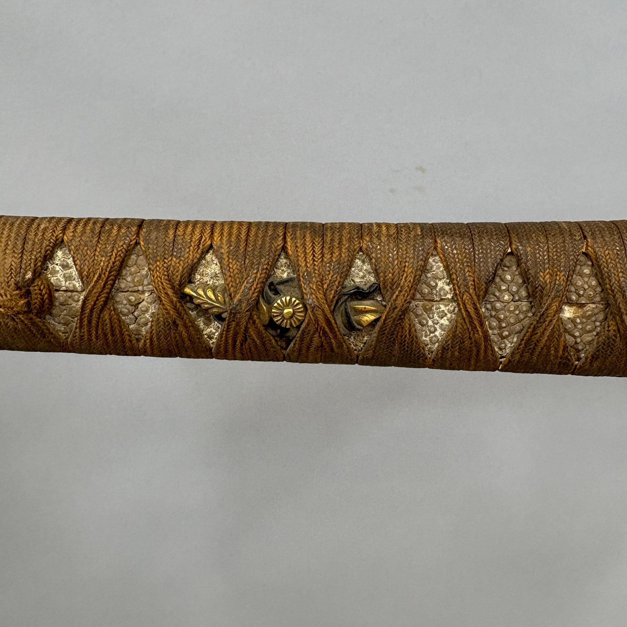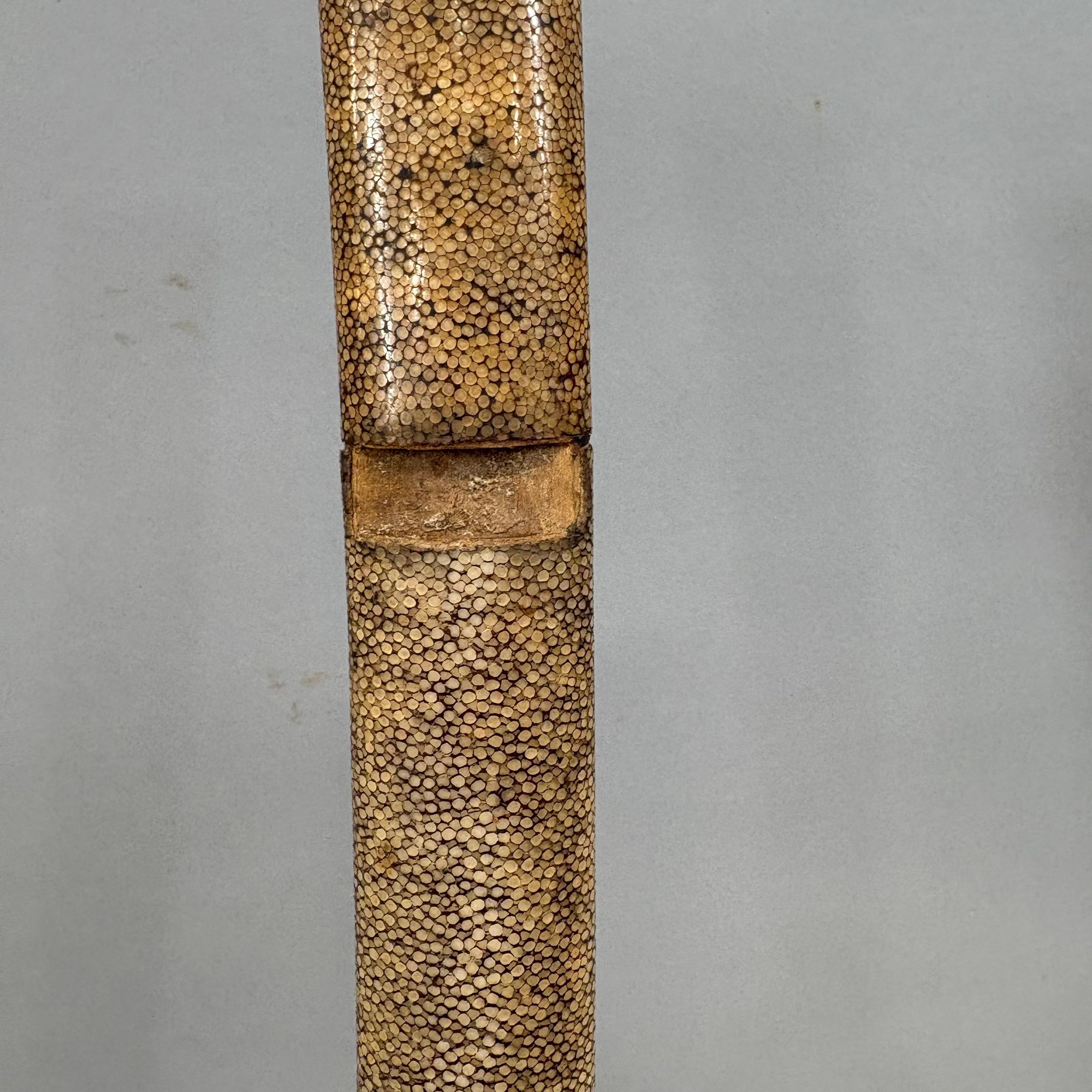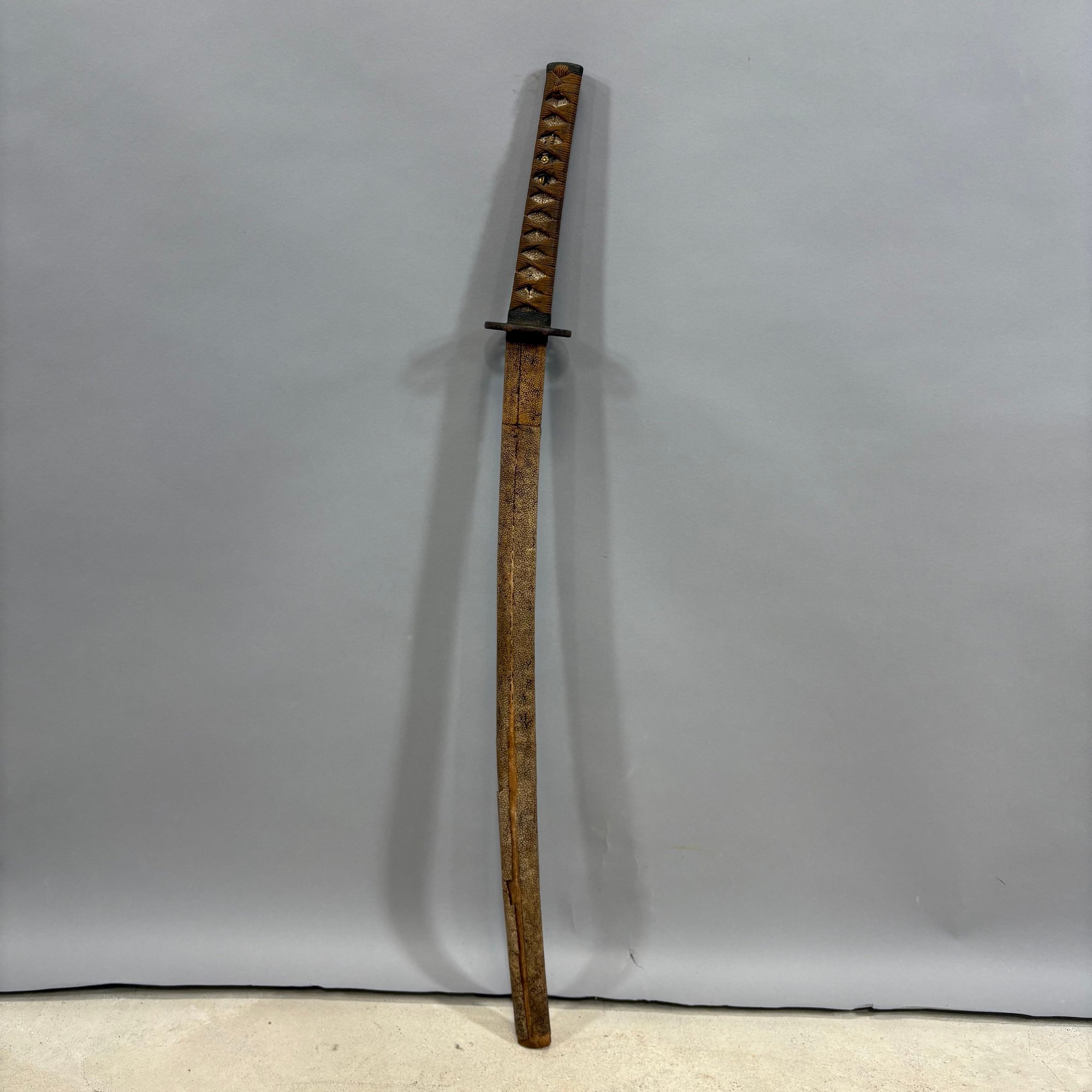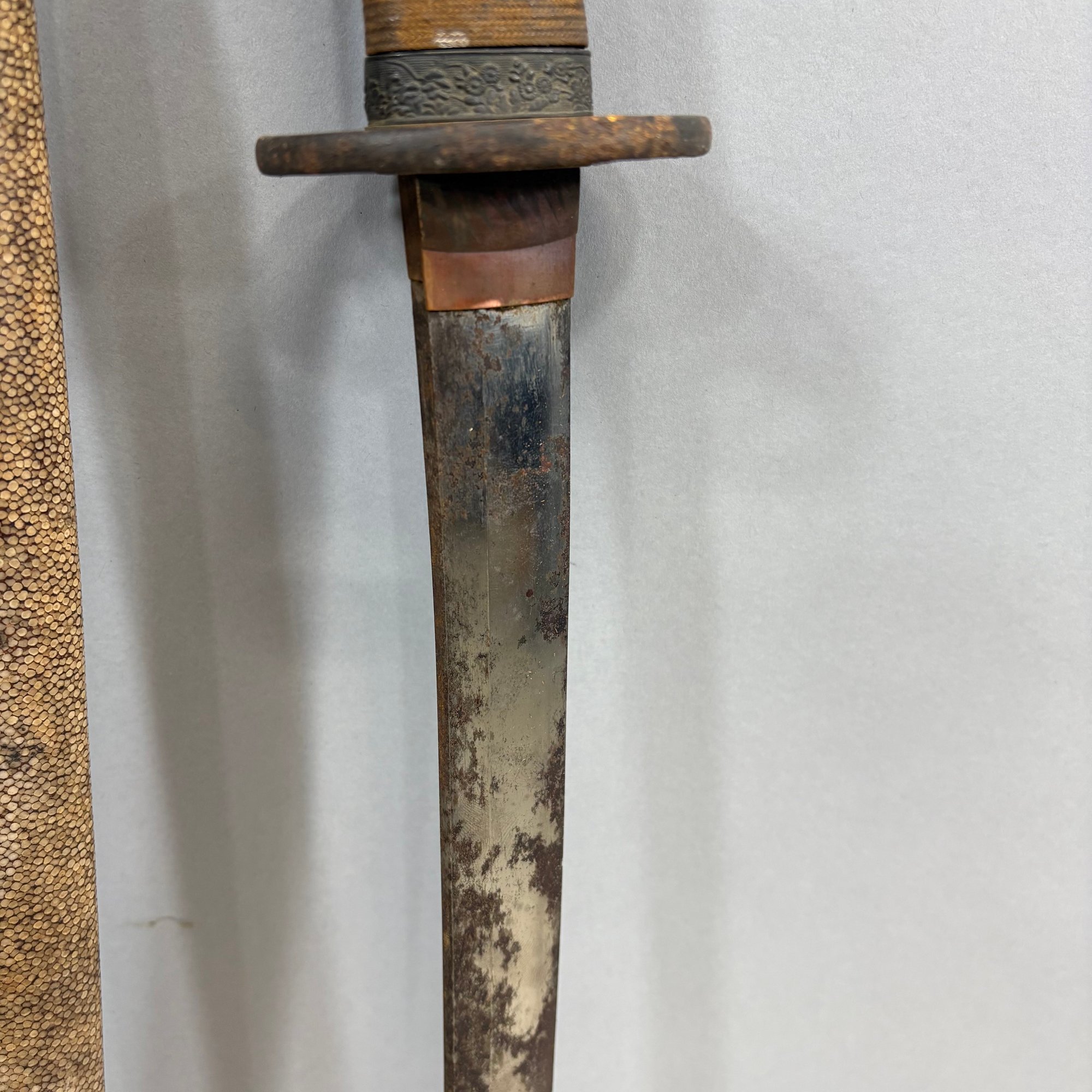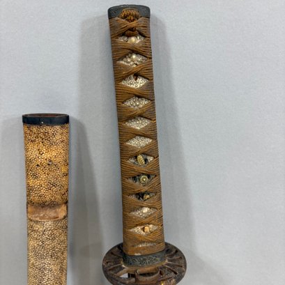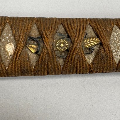 Japanese Wakizashi Samurai Sword with Ray Skin Saya. Wood tsuka wrapped with ray skin (samegawa) and silk or cotton gold cord (ito) enclosing floral menuki, pierced tsuba.