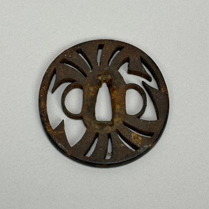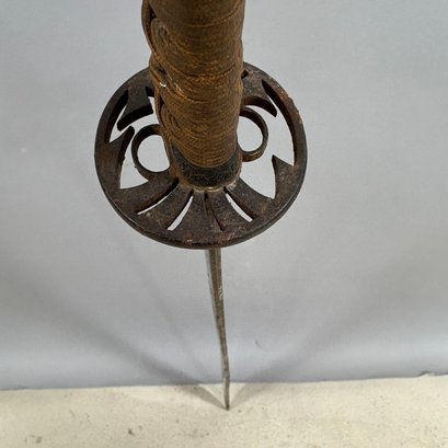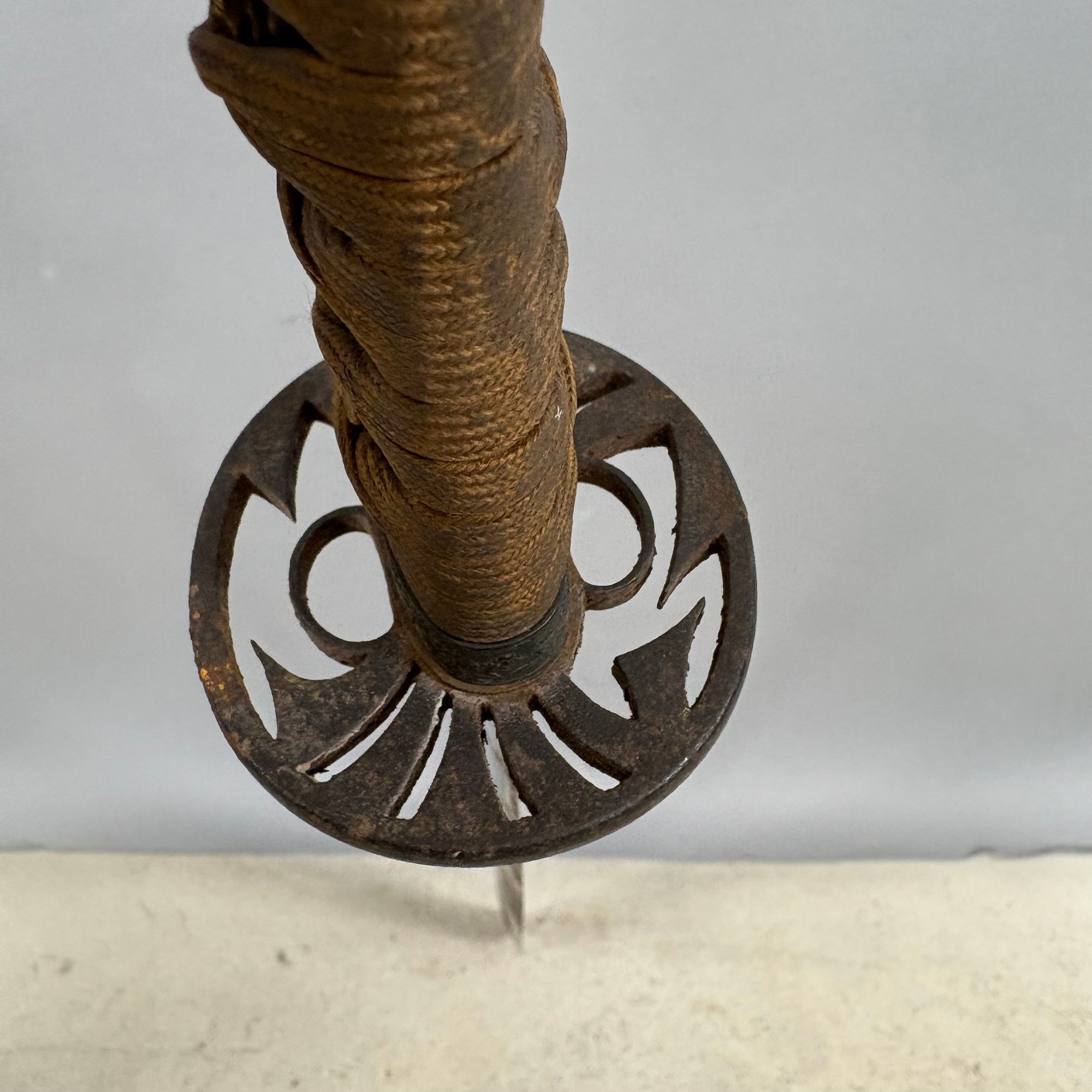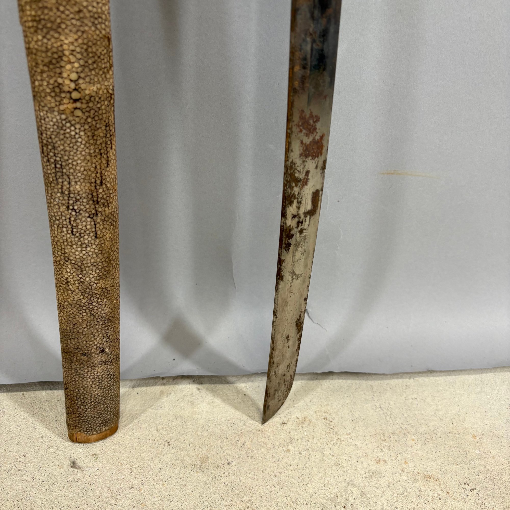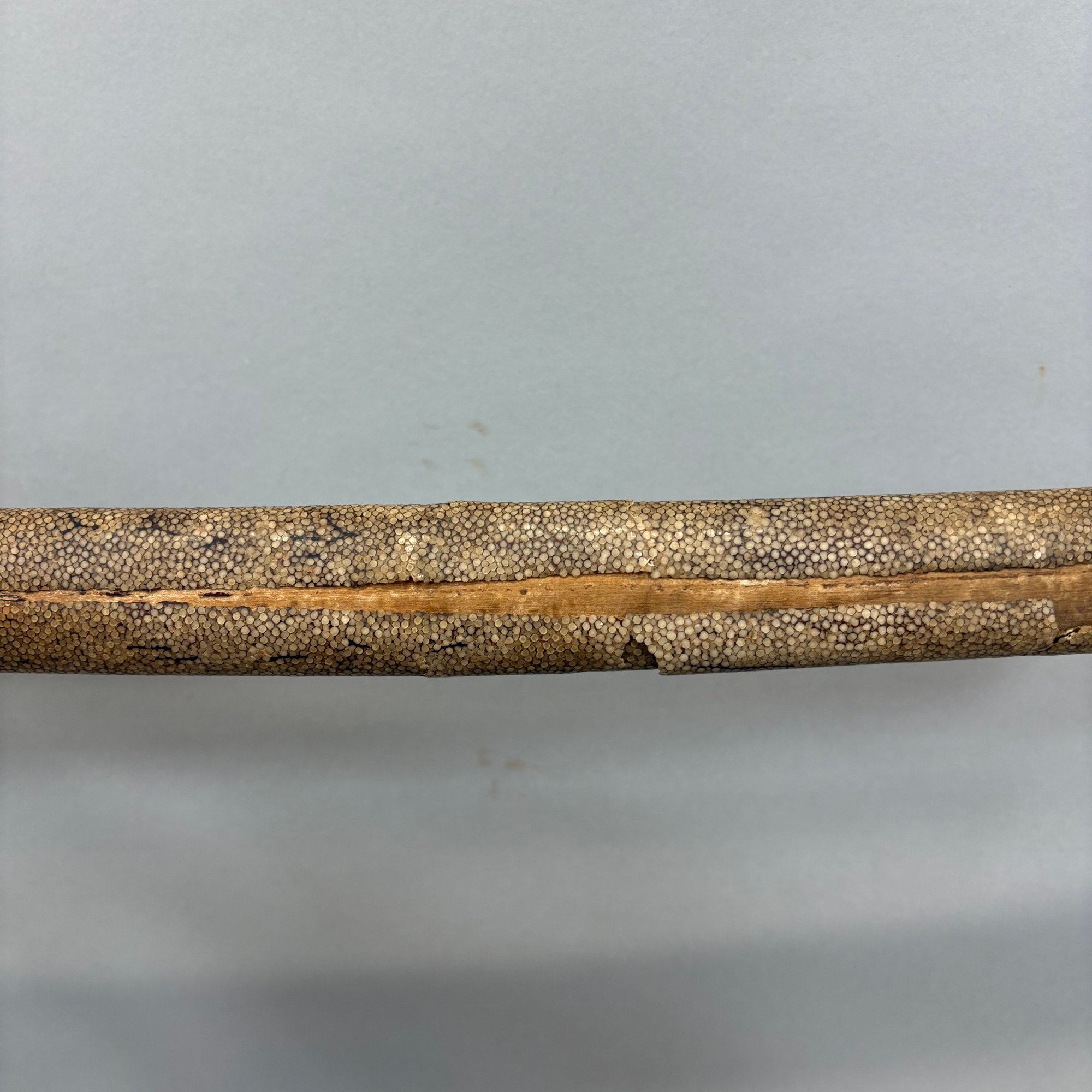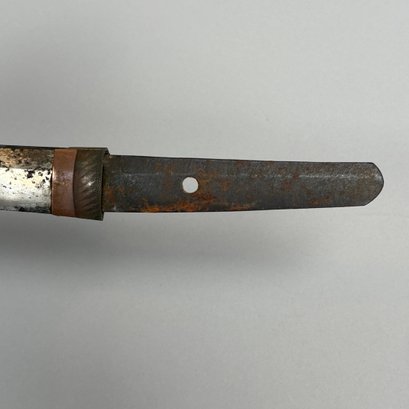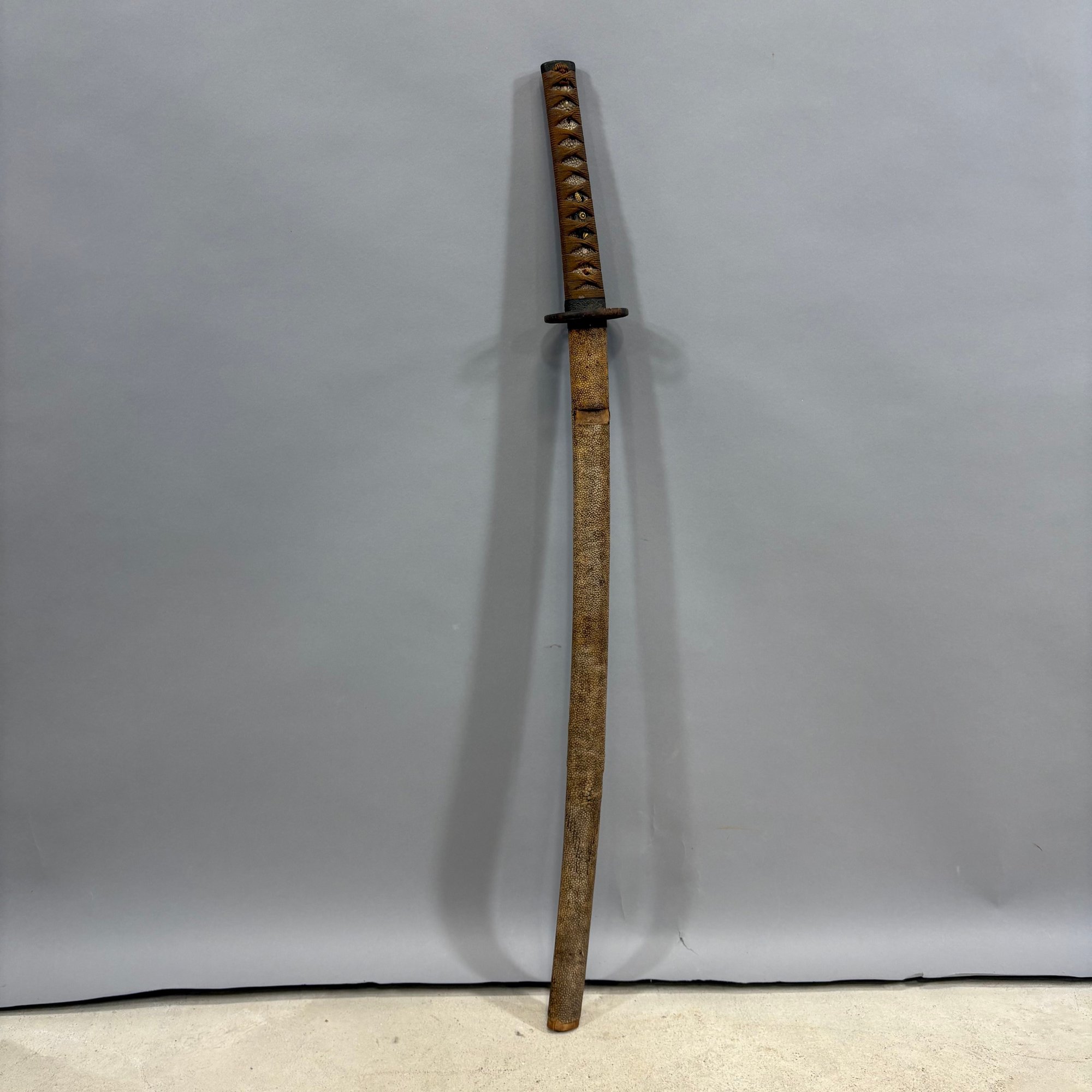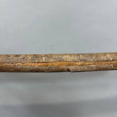 Japanese Wakizashi Samurai Sword with Ray Skin Saya. Wood tsuka wrapped with ray skin (samegawa) and silk or cotton gold cord (ito) enclosing floral menuki, pierced tsuba.