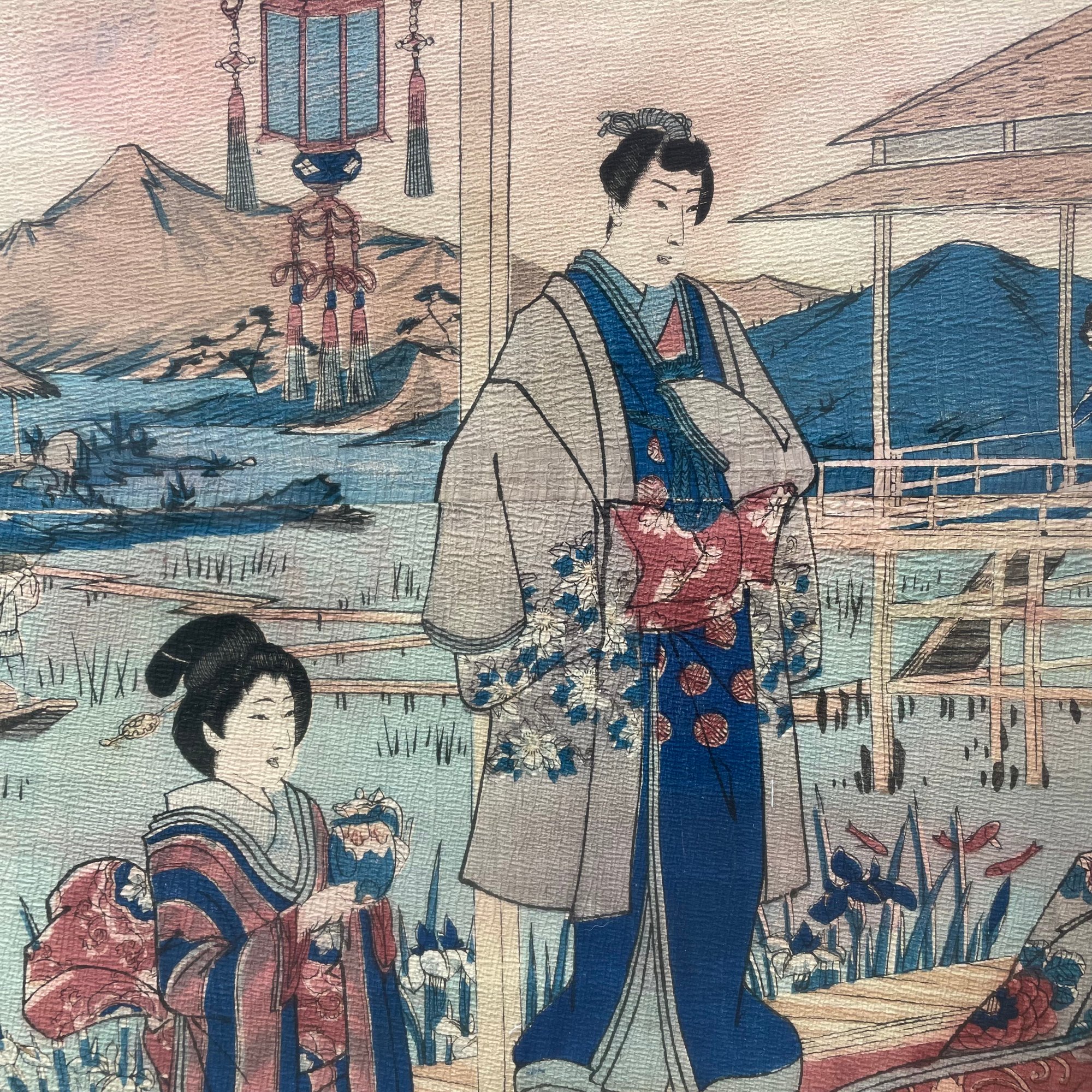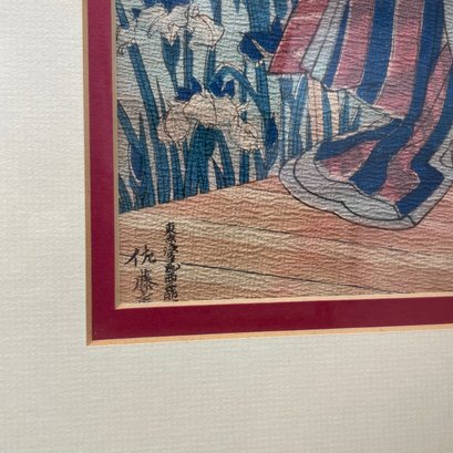 Japanese Woodblock Print. Depicting a man observing a woman cutting a flower and another holding a vase, (21.5 x 15 inches, sight).