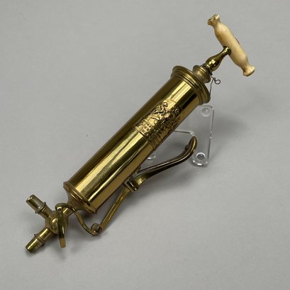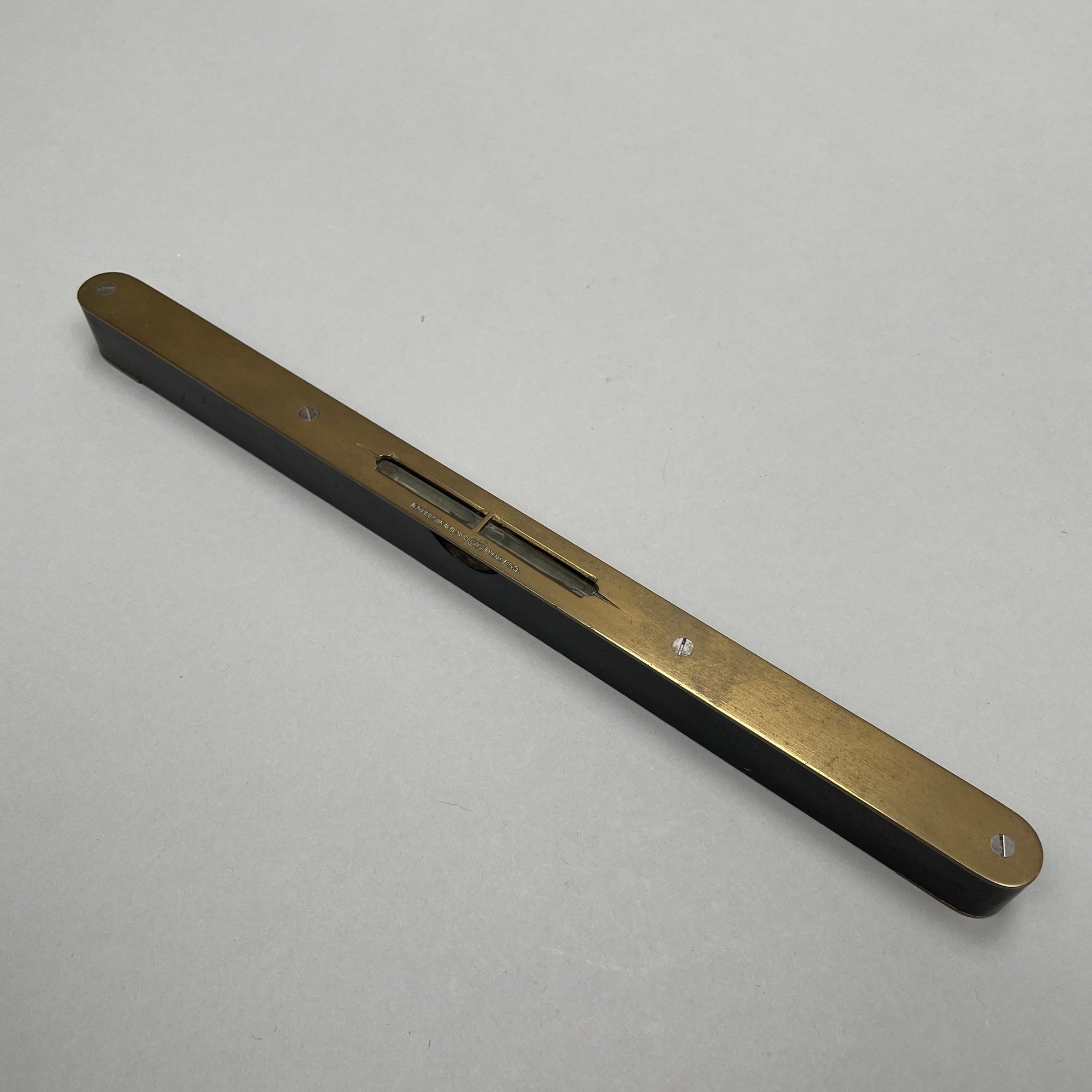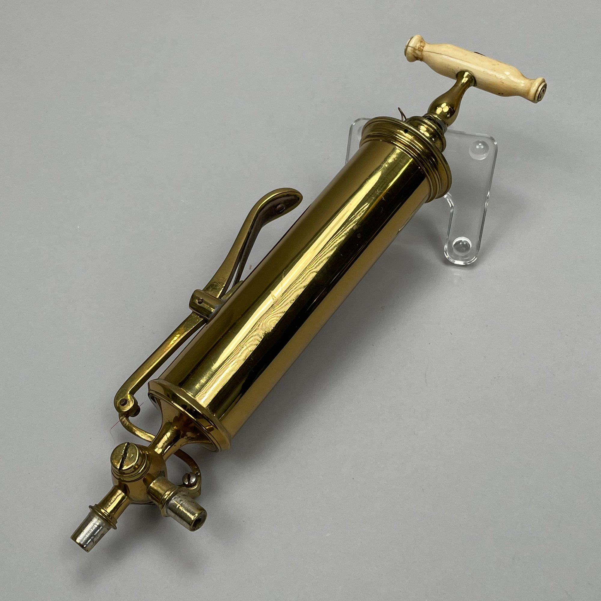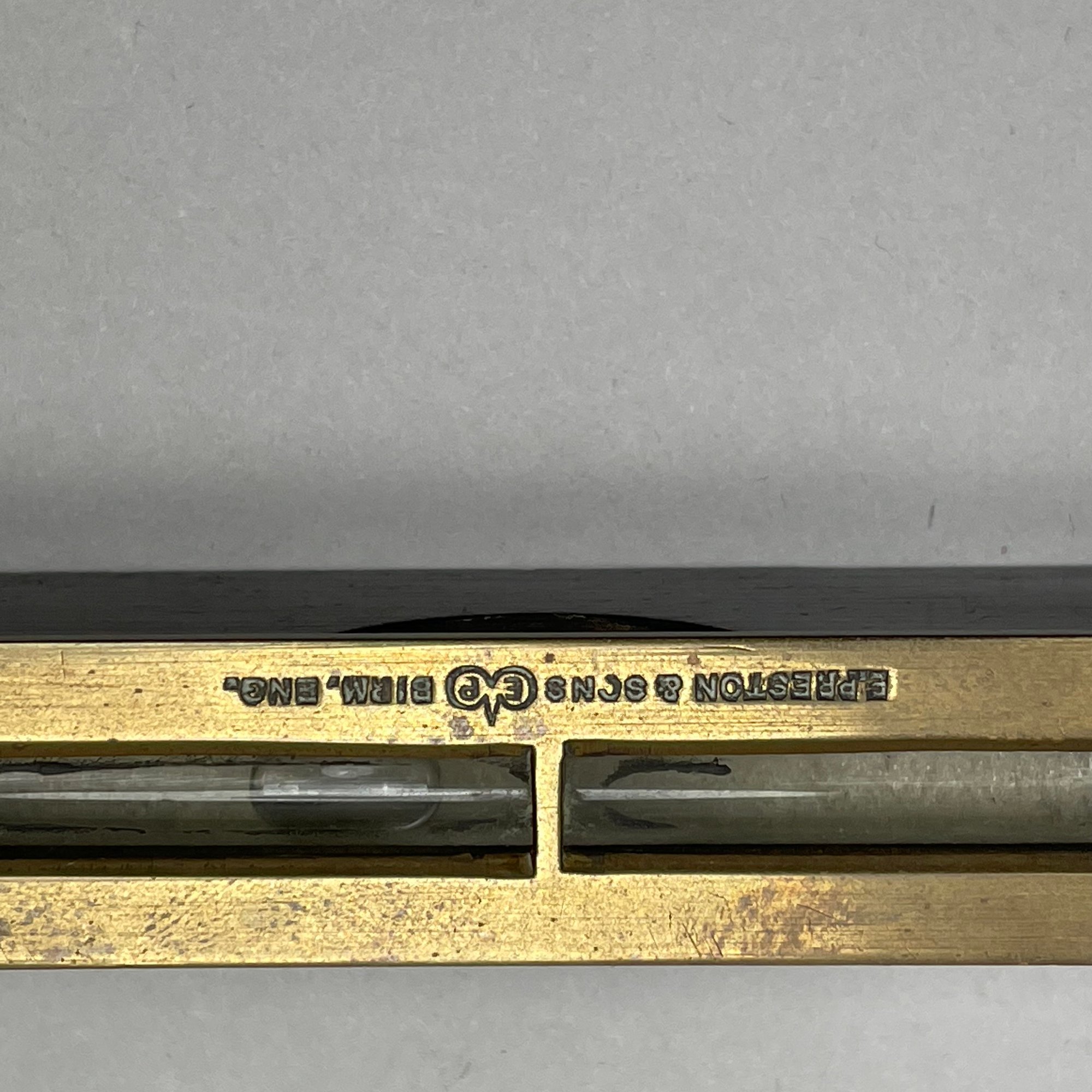 Joseph Gray & Son Truss Works, Sheffield, England, Brass Stomach Pump, Late Nineteenth Century; a brass and ebonized wood spirit level, E. Preston & Sons, Birmingham, 1920-49; and a Holosteric Barometer.