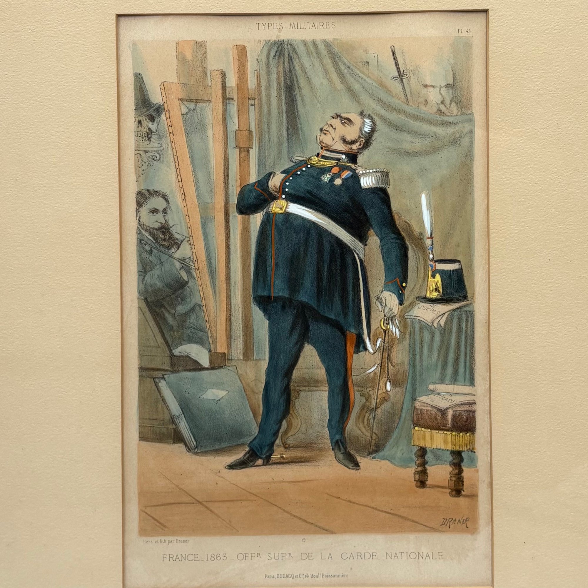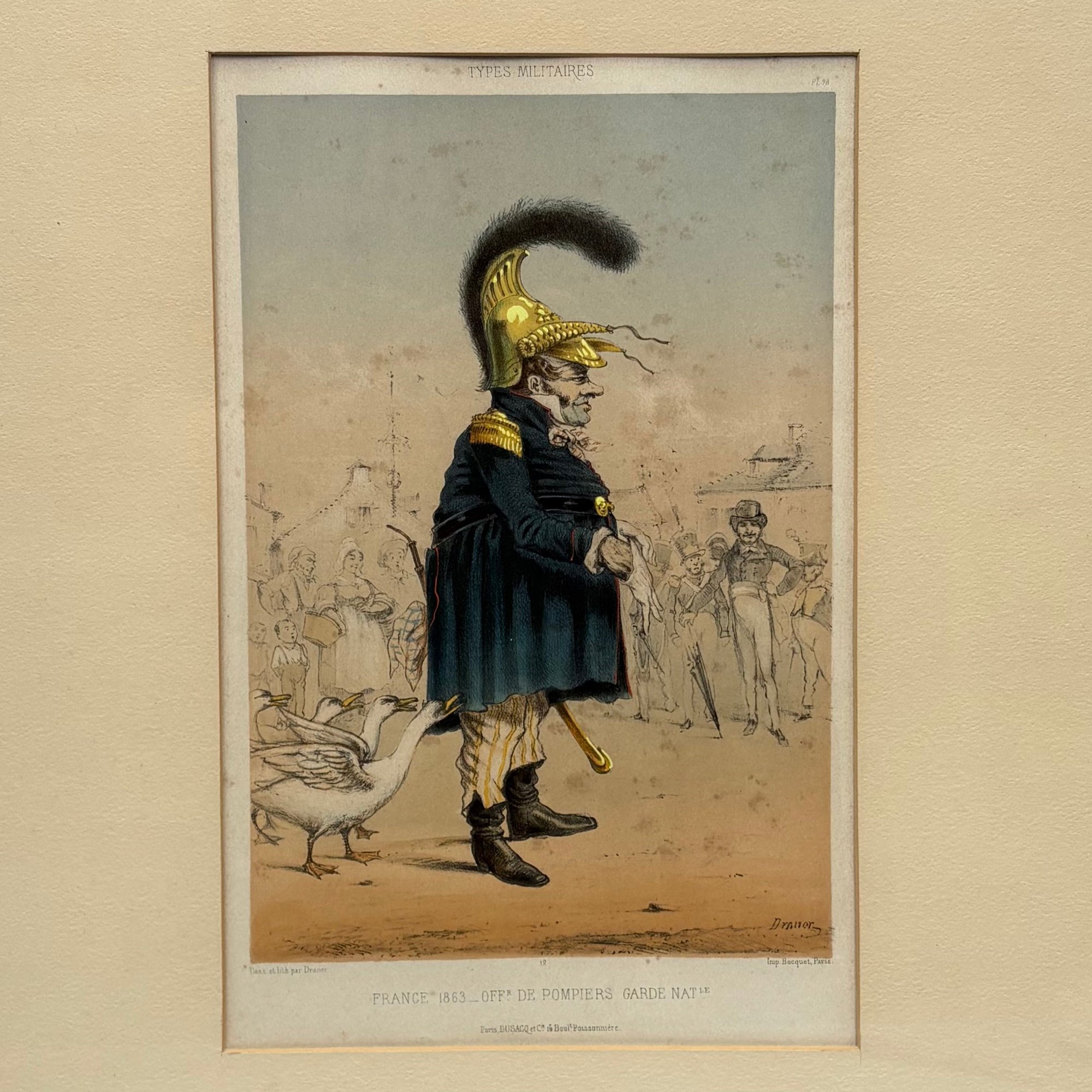 Jules "Draner" Renard (1833-1926, Belgian). Pair of "TYPES MILITAIRES: FRANCE 1863: OFF.R SUP.R DE LA CARDE NATIONALE" and "OFF.R DE POMPIERS GARDE NAT.LE," 1863. Hand-colored lithographs, each signed "DRANER" in the plate lower right, published by Dusacq et Cie B, Paris, (13.25 x 8.5 inches, sight).