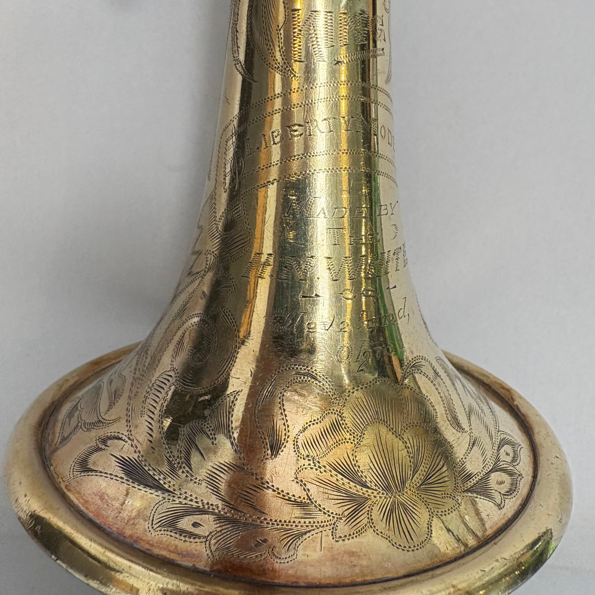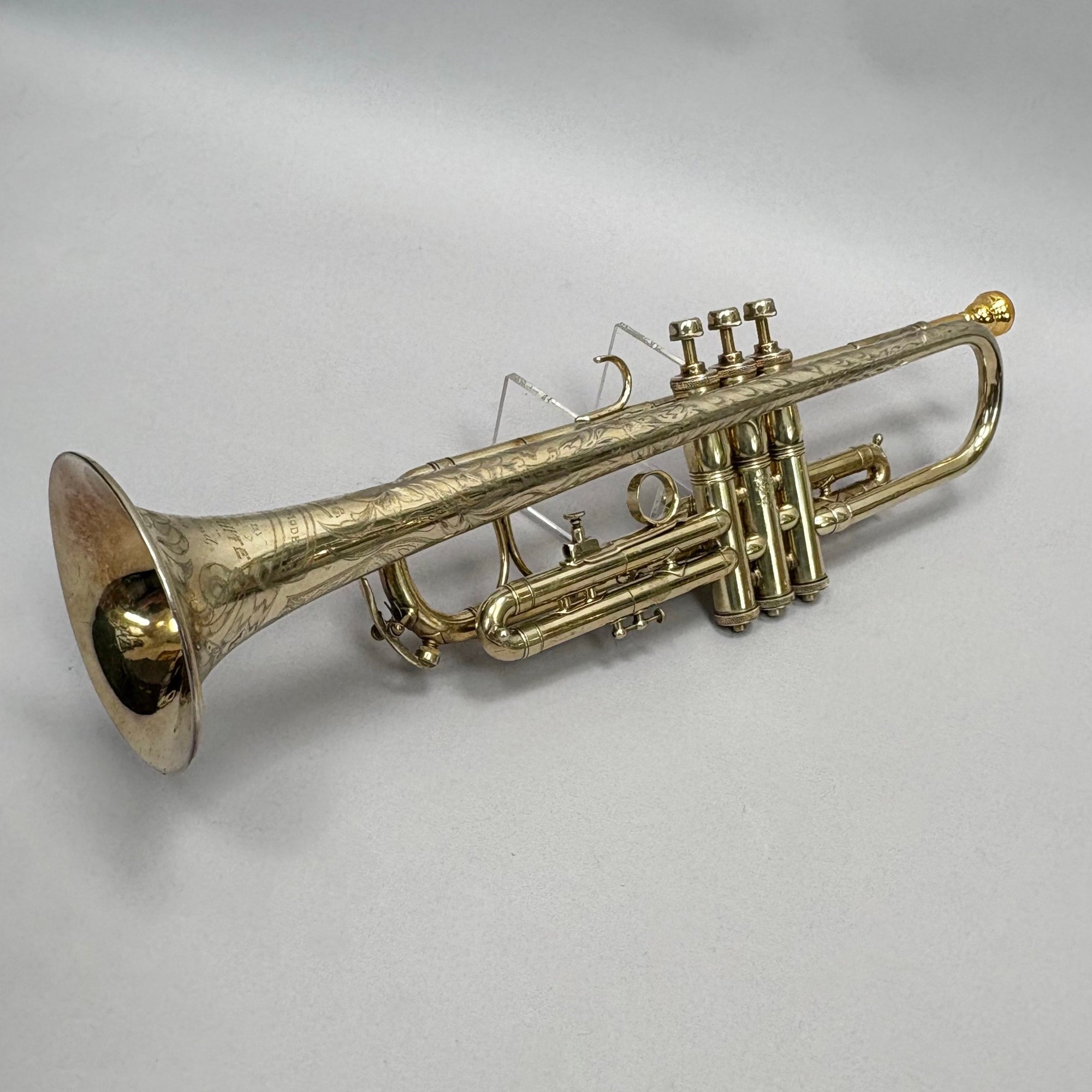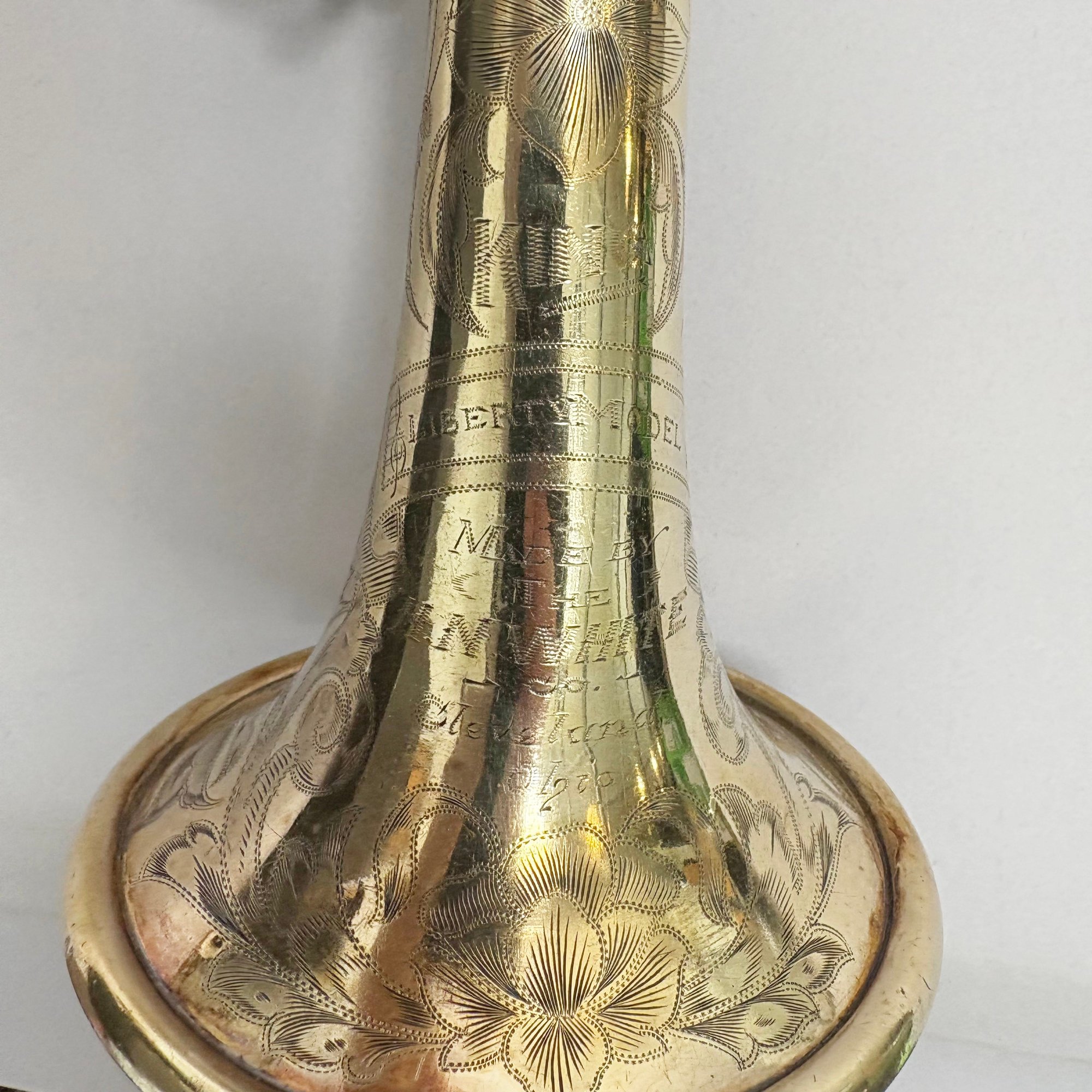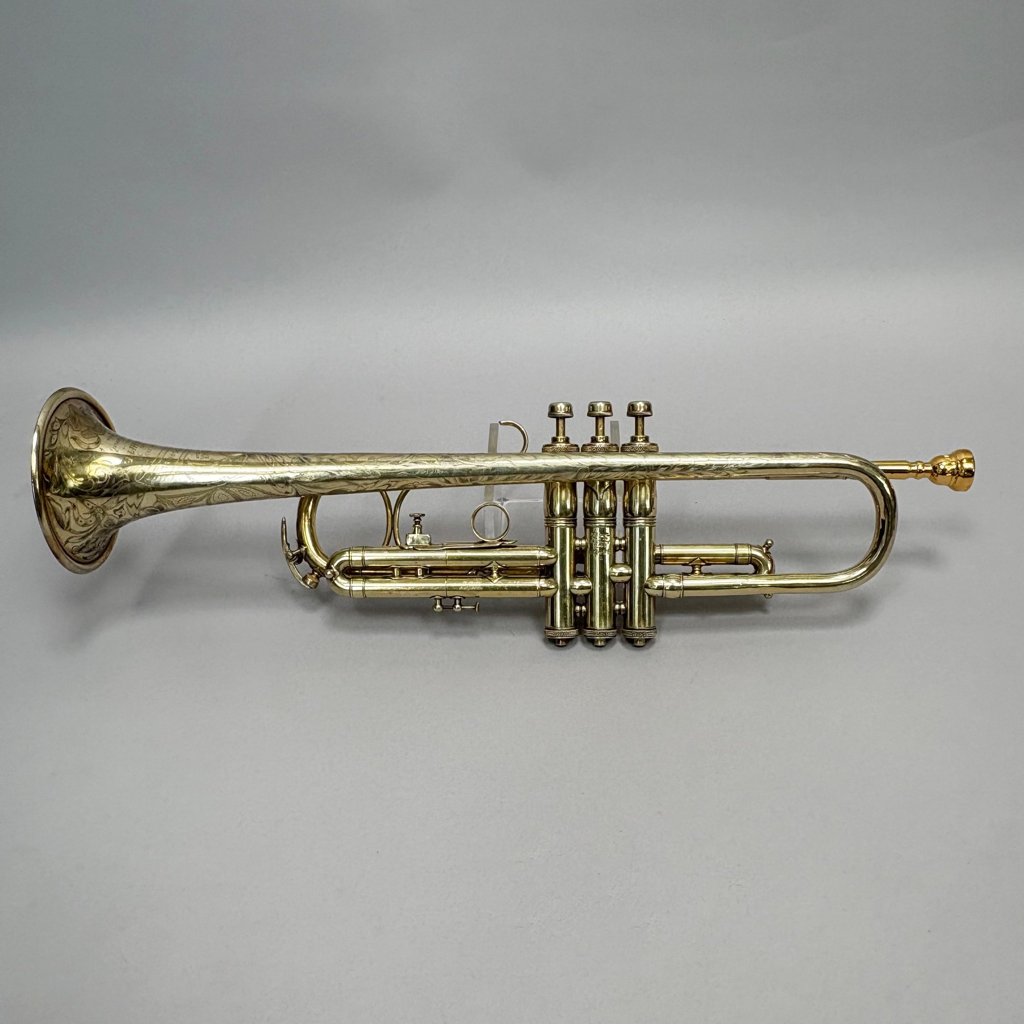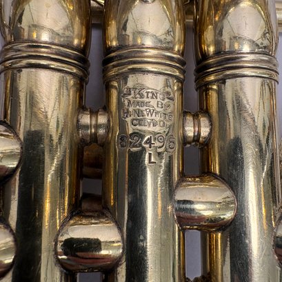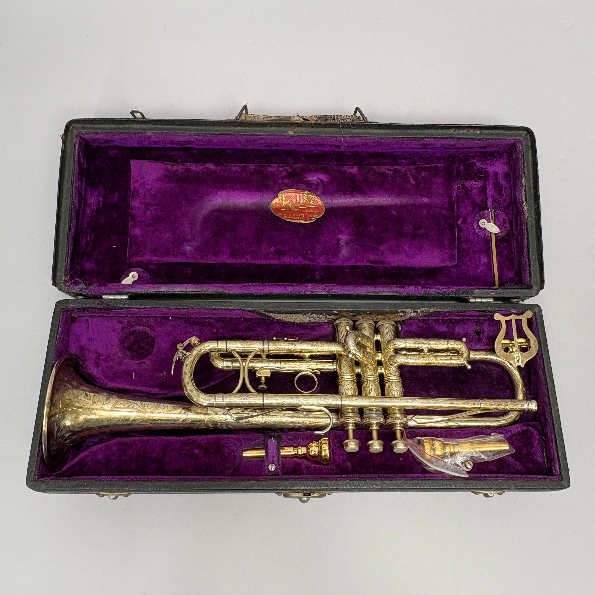 H.N. (Henderson Nelson) White Company King "Liberty" Model Engraved Brass Trumpet, Serial Number 82495L, Cleveland, Ohio, 1925-1930. Engraved overall on the leadpipe, bell and one side with leaves and vines, marked on the bell "KING/ LIBERTY MODEL/ MADE BY/ THE/ H.N. WHITE/ CO/ Cleveland,/ Ohio," and on the opposite side on the second valve tube "KING/ MADE BY/ H.N. WHITE/ CLEV'D. O/ 82495/ L," with two mouthpieces and a lyre-form music holder; housed in the original leather covered case with purple lining, affixed on the inside cover with a foil label and on the side of the case with a brass label, each signed "KING/ The N.H. White Co., CLEVELAND O."