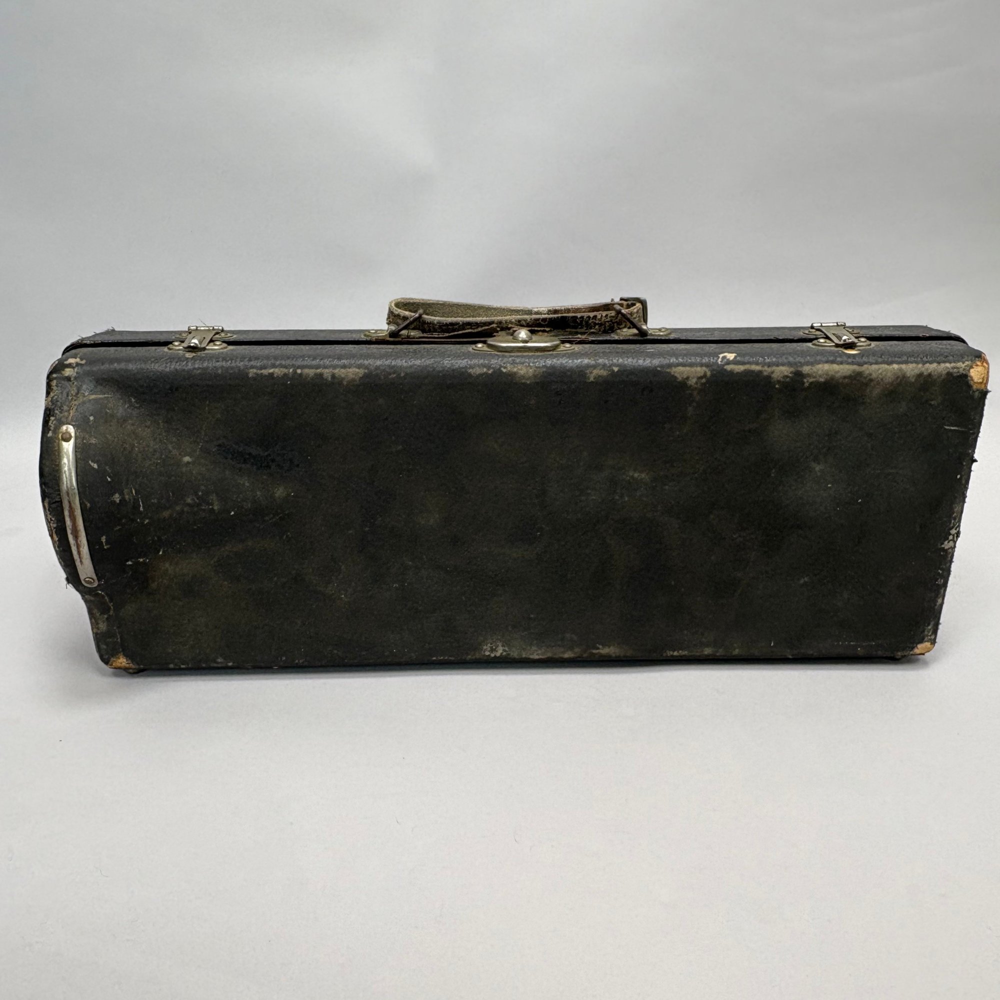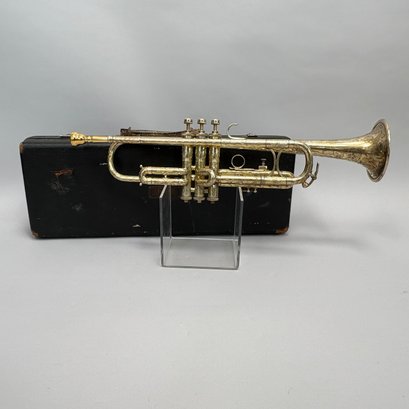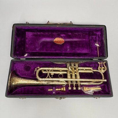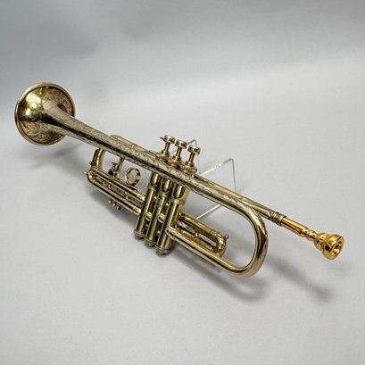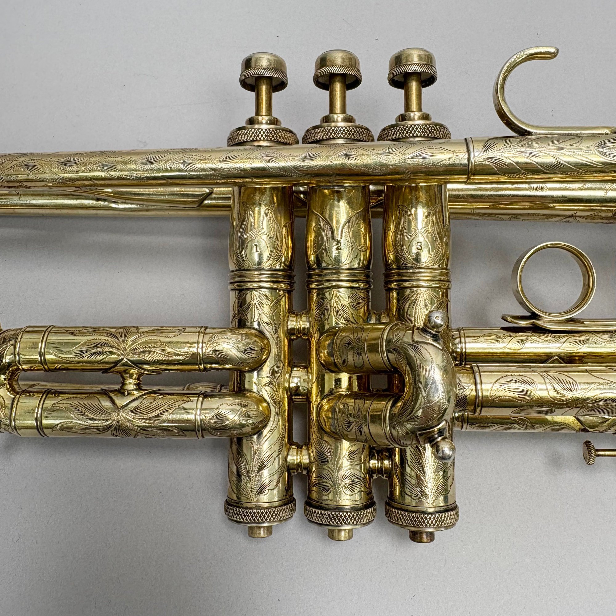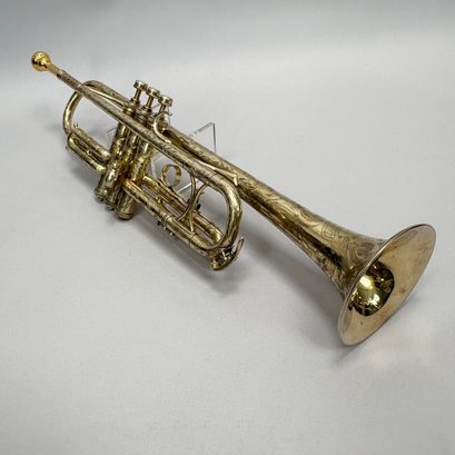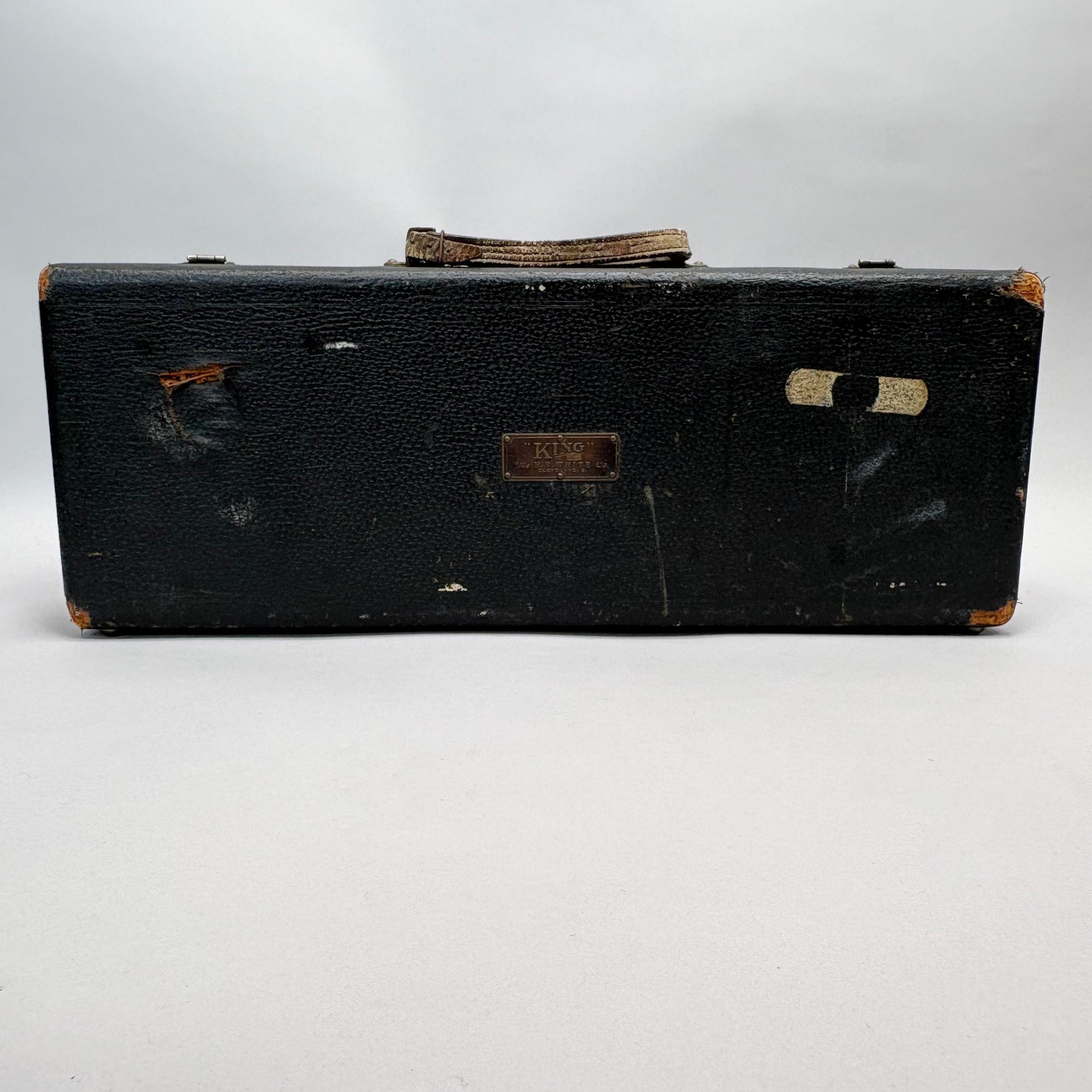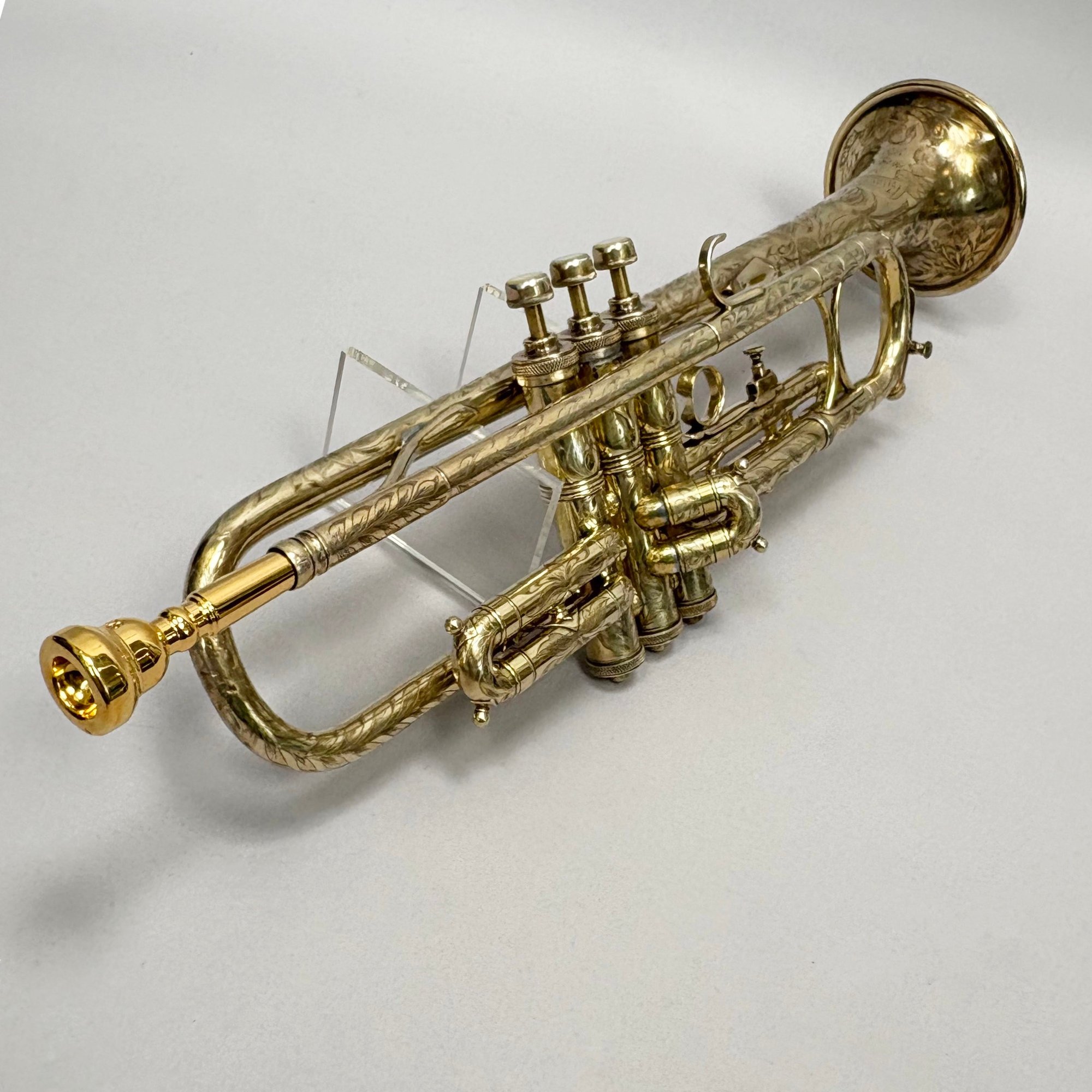 H.N. (Henderson Nelson) White Company King "Liberty" Model Engraved Brass Trumpet, Serial Number 82495L, Cleveland, Ohio, 1925-1930. Engraved overall on the leadpipe, bell and one side with leaves and vines, marked on the bell "KING/ LIBERTY MODEL/ MADE BY/ THE/ H.N. WHITE/ CO/ Cleveland,/ Ohio," and on the opposite side on the second valve tube "KING/ MADE BY/ H.N. WHITE/ CLEV'D. O/ 82495/ L," with two mouthpieces and a lyre-form music holder; housed in the original leather covered case with purple lining, affixed on the inside cover with a foil label and on the side of the case with a brass label, each signed "KING/ The N.H. White Co., CLEVELAND O."