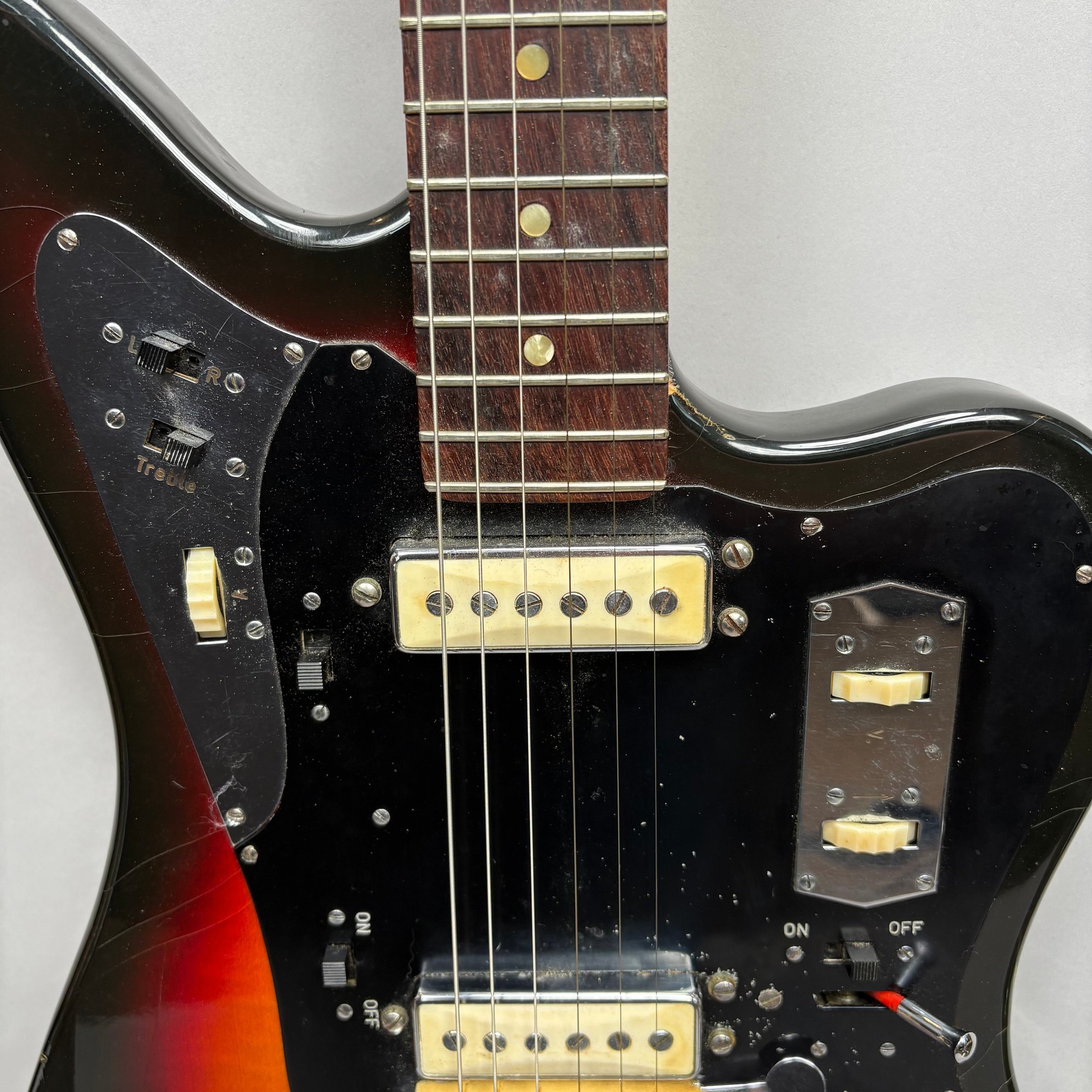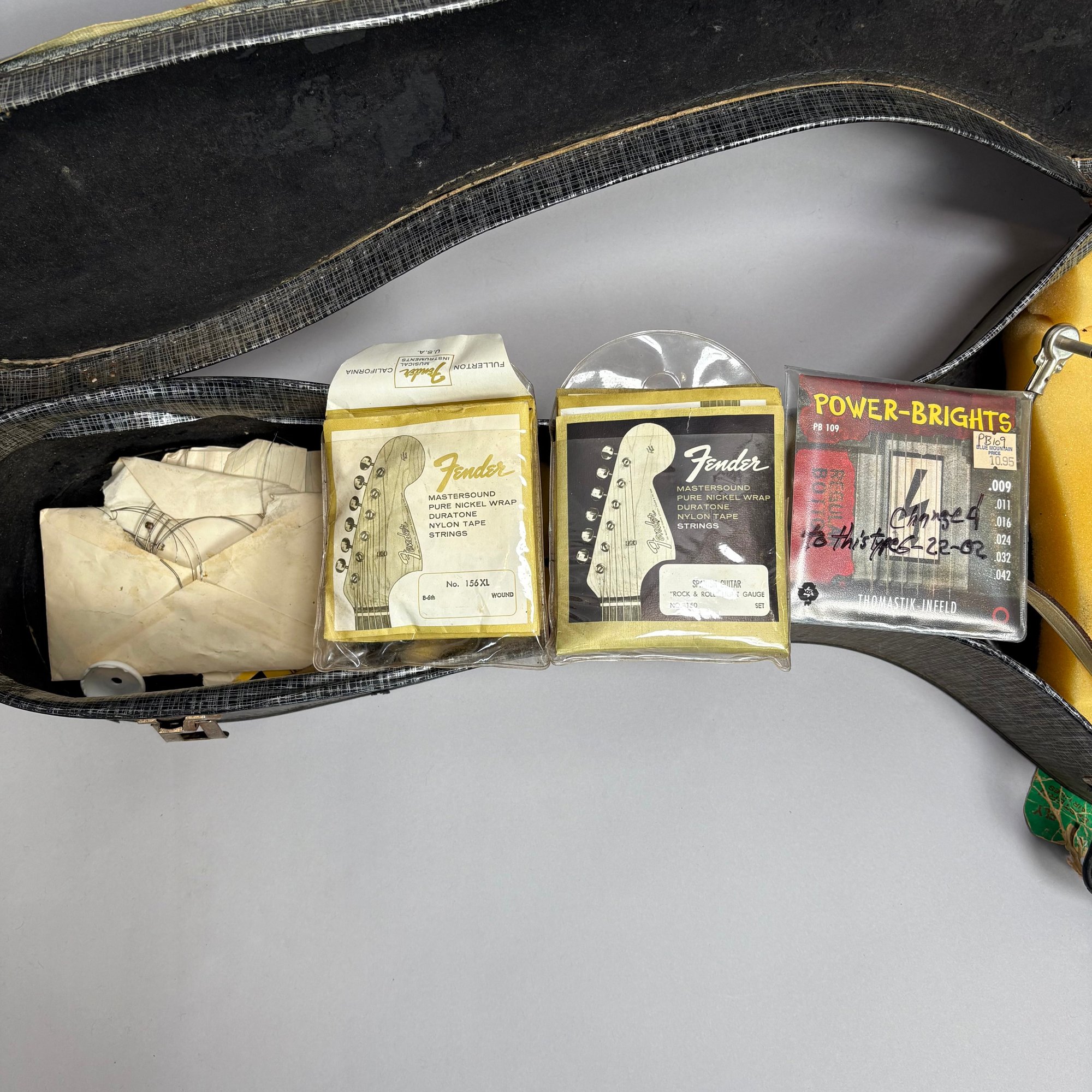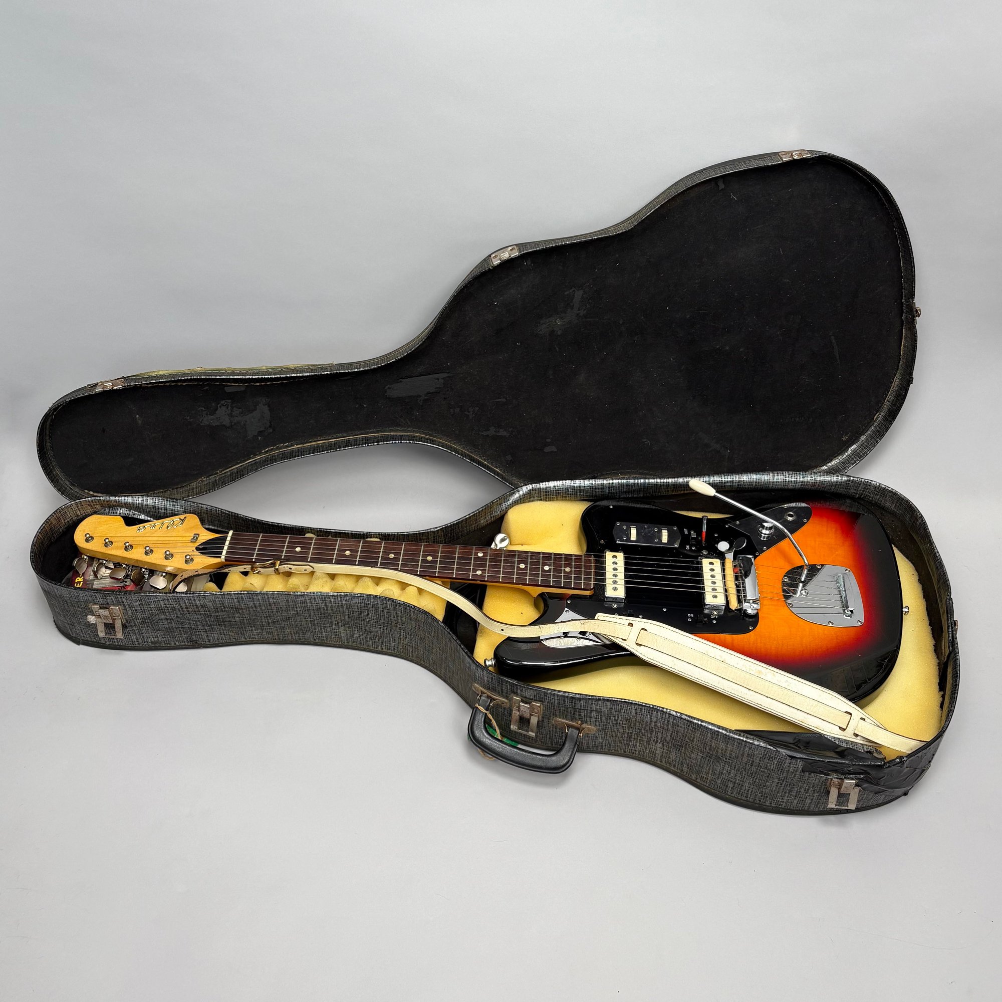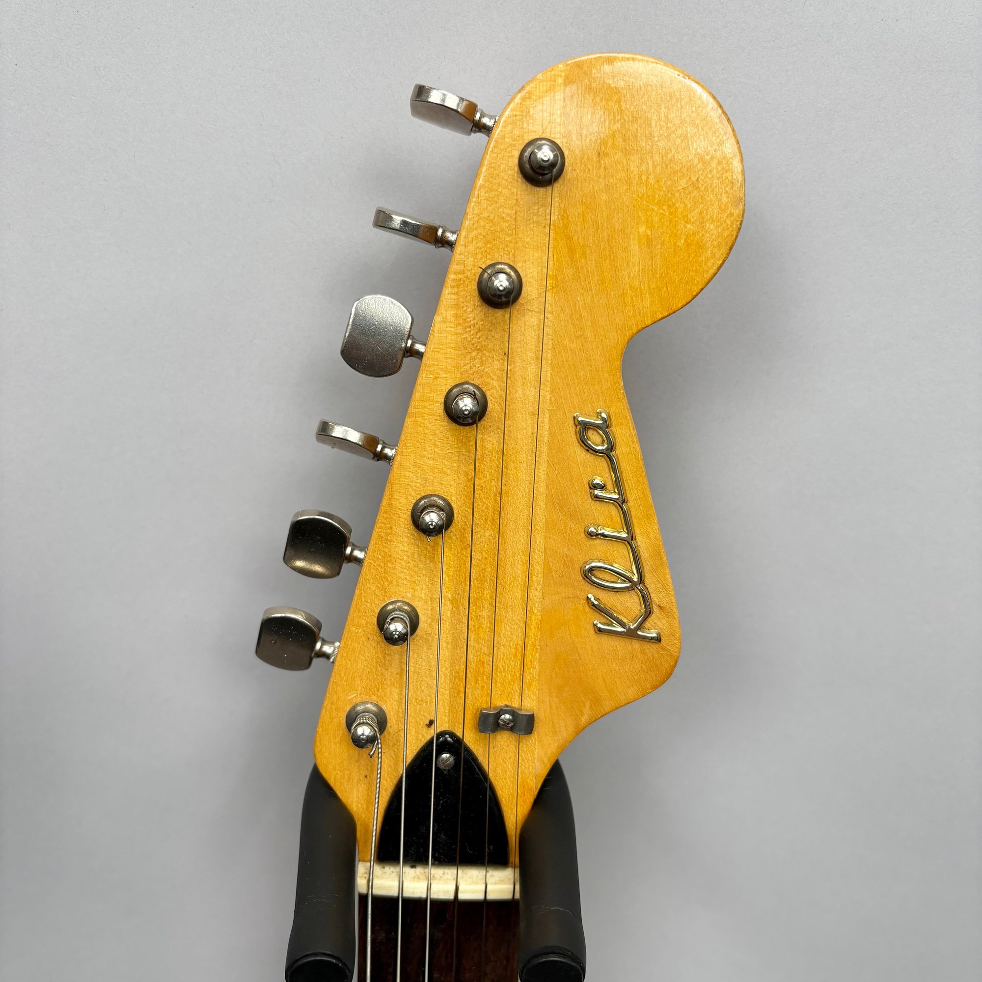 Klira 233 Star Club Sunburst Guitar, Germany, 1967-1969, and Case. Right-handed, maple headstock applied "Klira" in raised gold-plate lettering, rosewood fretboard with pearloid dots; also including an instrument cable, eleven packs of Fender strings and one empty Thomastik-Infeld set of Power-Brights with handwritten note "Changed to this type 6-22-02," one set of unknown strings in an envelope, Schaller security lock, a "Fender/ THIN" white guitar pick, and a soft-sided case. Together with a white leather guitar strap.