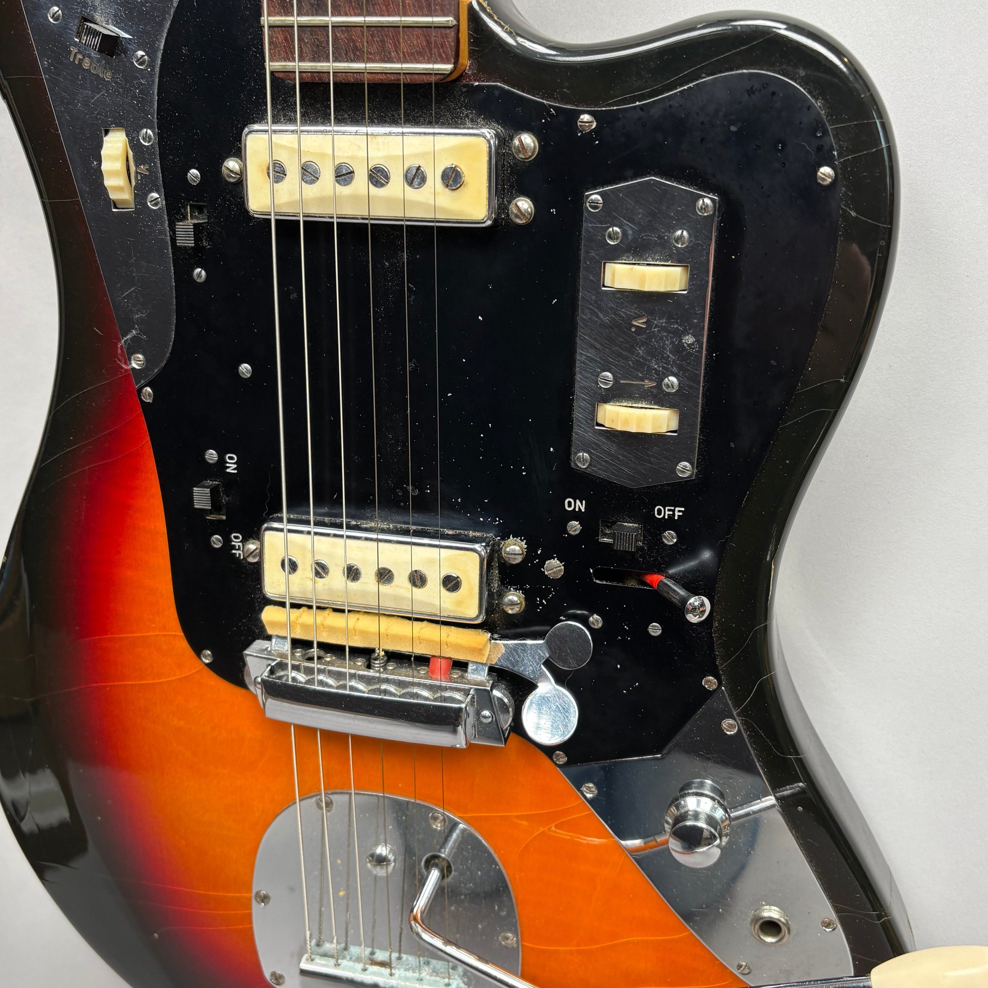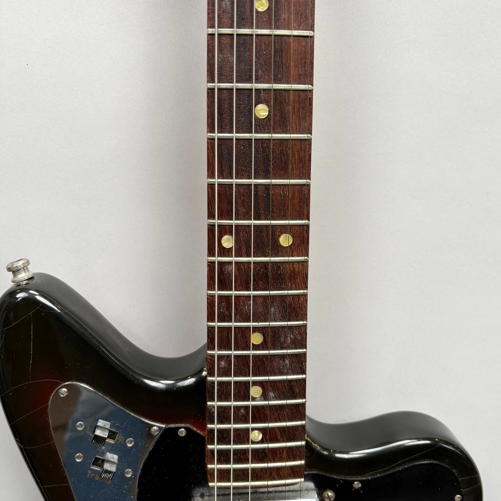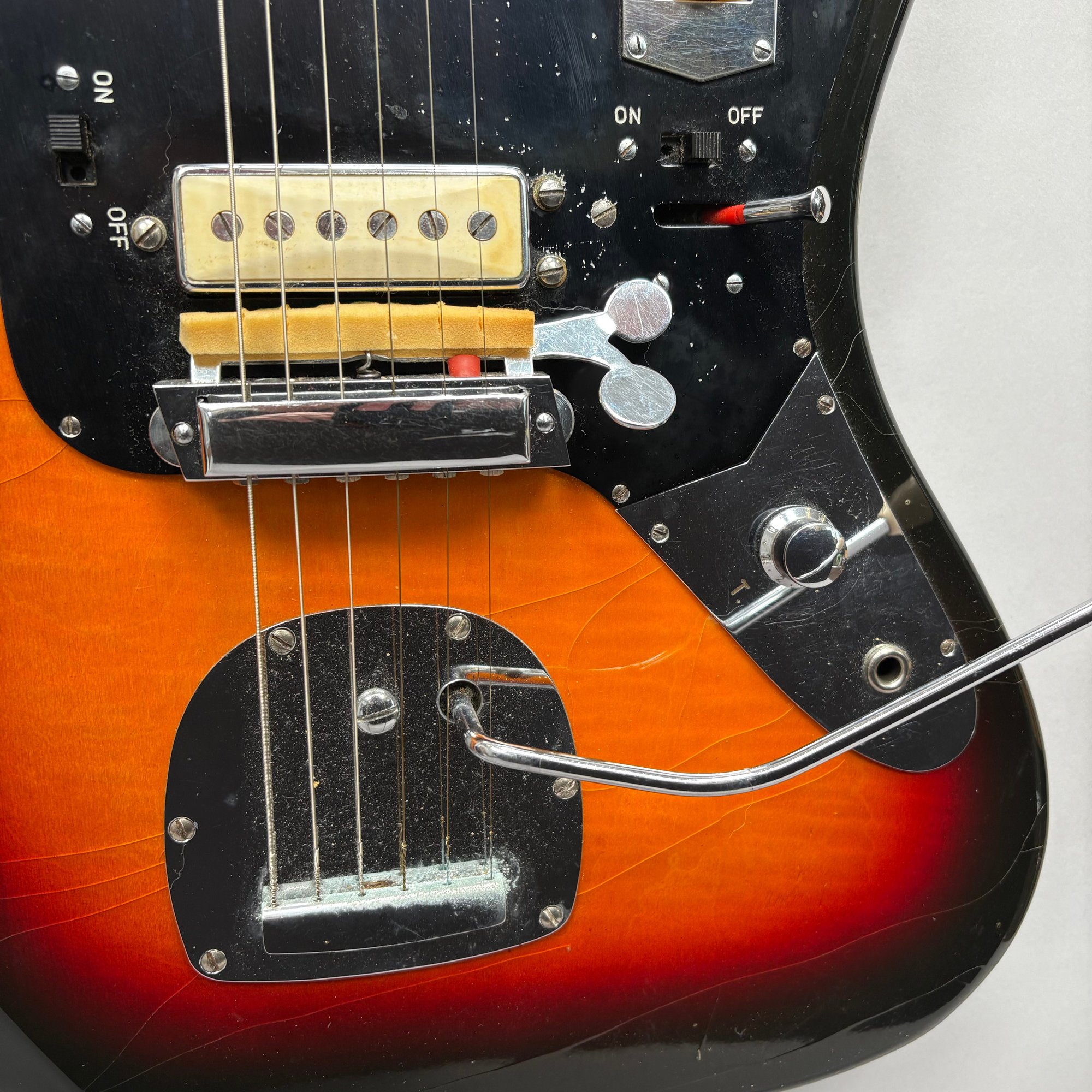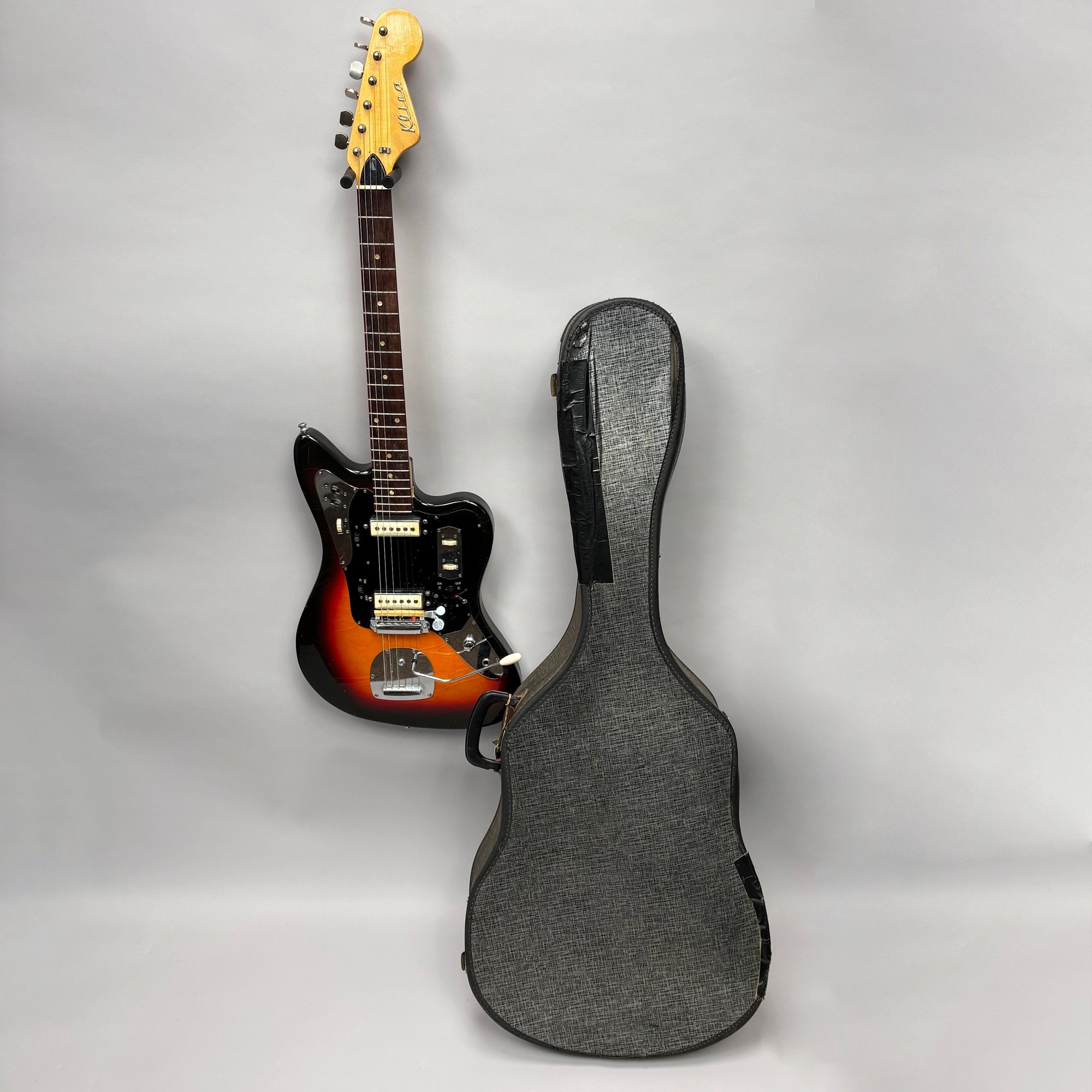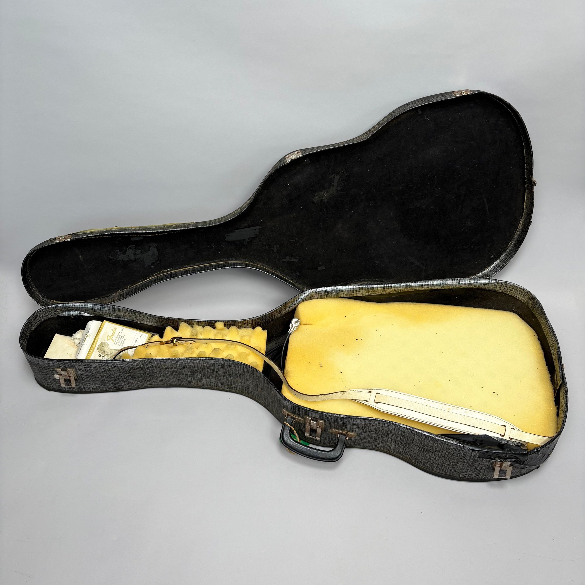 Klira 233 Star Club Sunburst Guitar, Germany, 1967-1969, and Case. Right-handed, maple headstock applied "Klira" in raised gold-plate lettering, rosewood fretboard with pearloid dots; also including an instrument cable, eleven packs of Fender strings and one empty Thomastik-Infeld set of Power-Brights with handwritten note "Changed to this type 6-22-02," one set of unknown strings in an envelope, Schaller security lock, a "Fender/ THIN" white guitar pick, and a soft-sided case. Together with a white leather guitar strap.