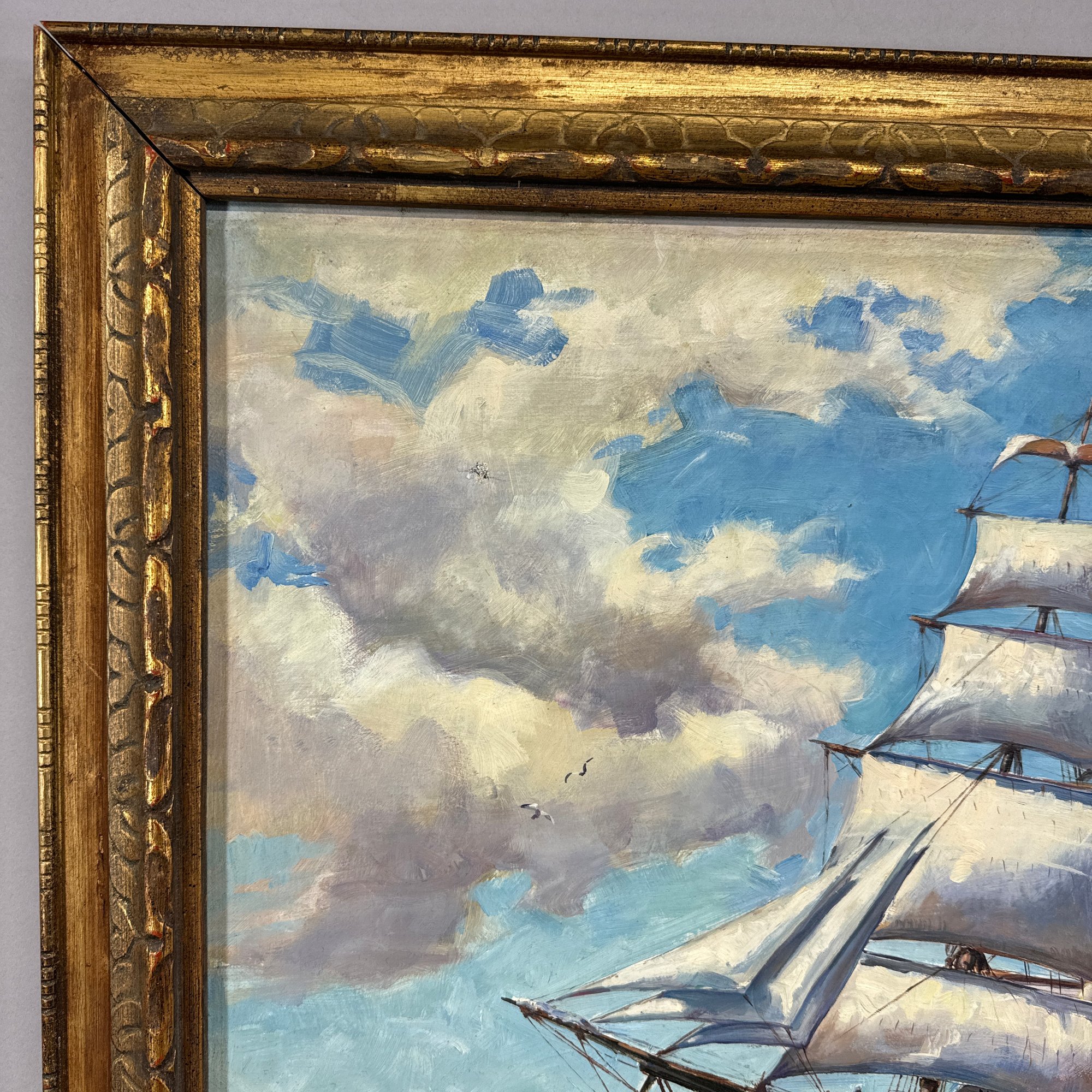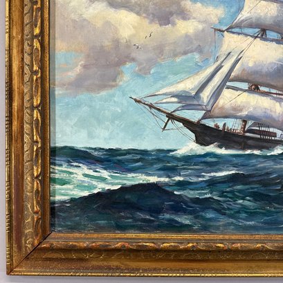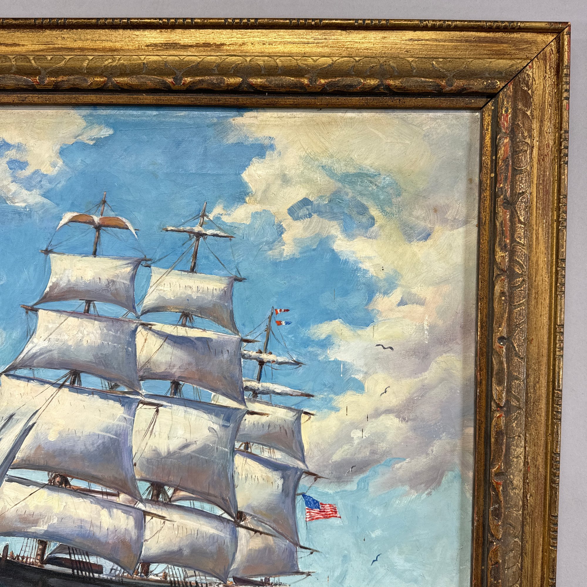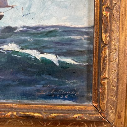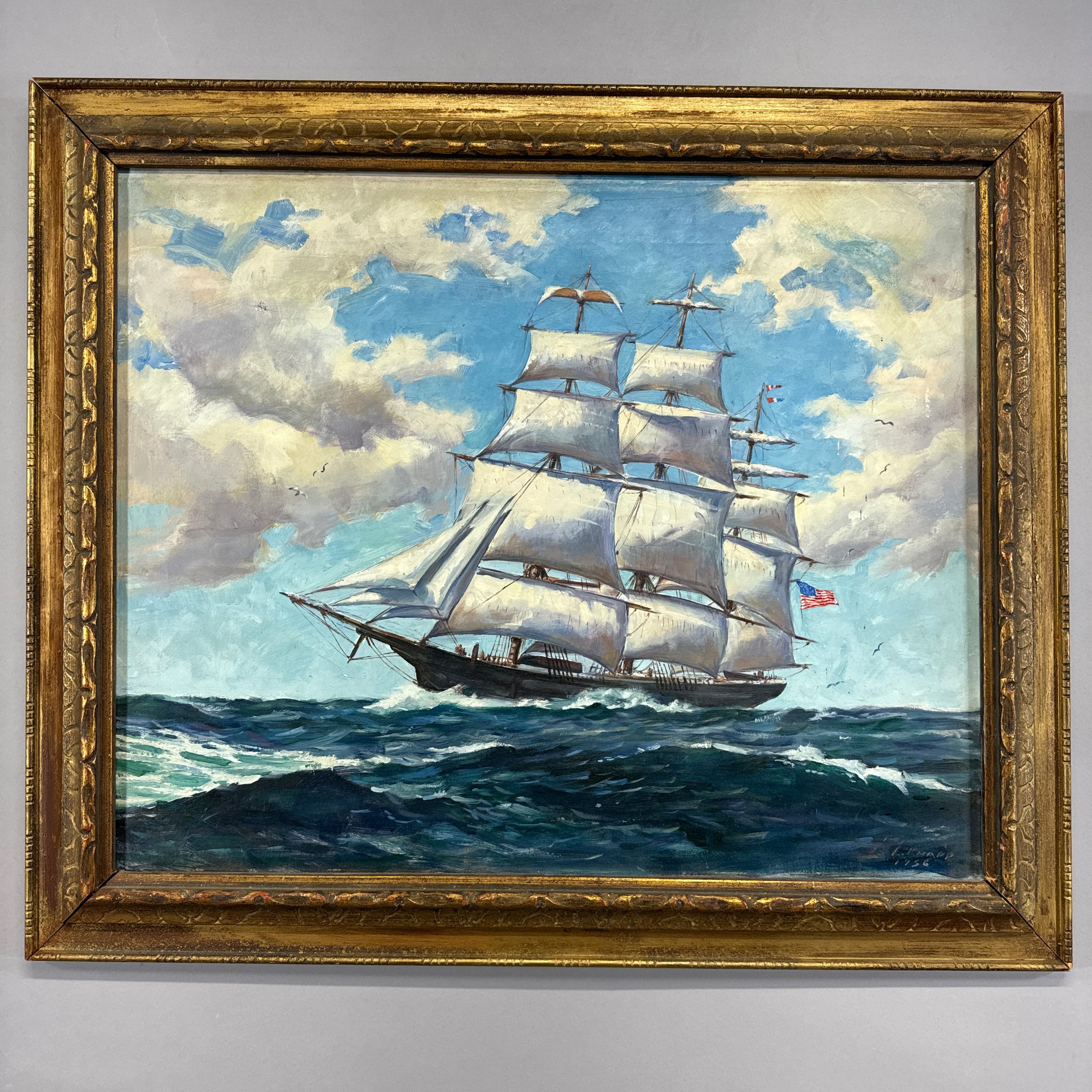 L. Knapp. American Ship at Sea, 1956. Oil on canvas, depicting a three-masted ship flying an American flag, signed and dated "L. KNAPP/ 1956" lower right, (20.375 x 25 inches).